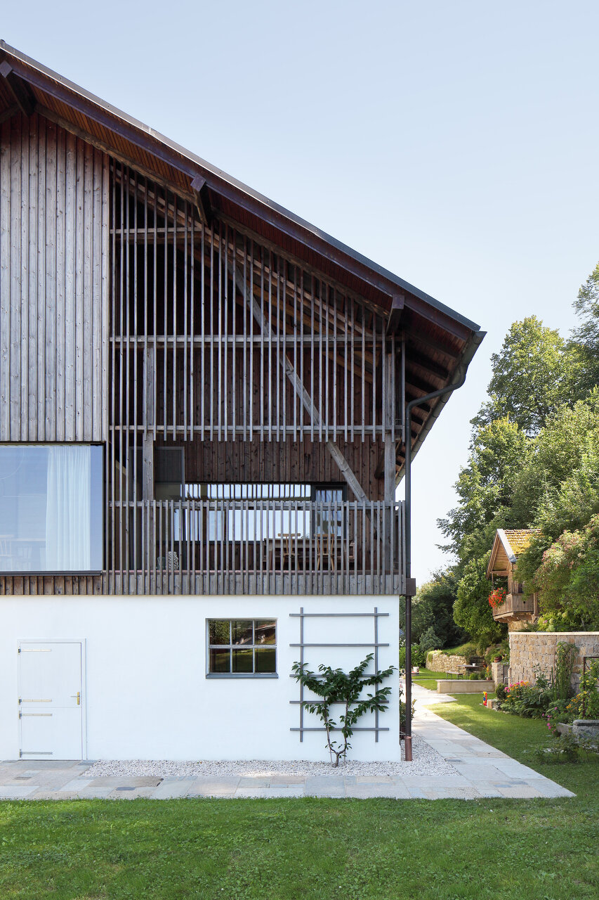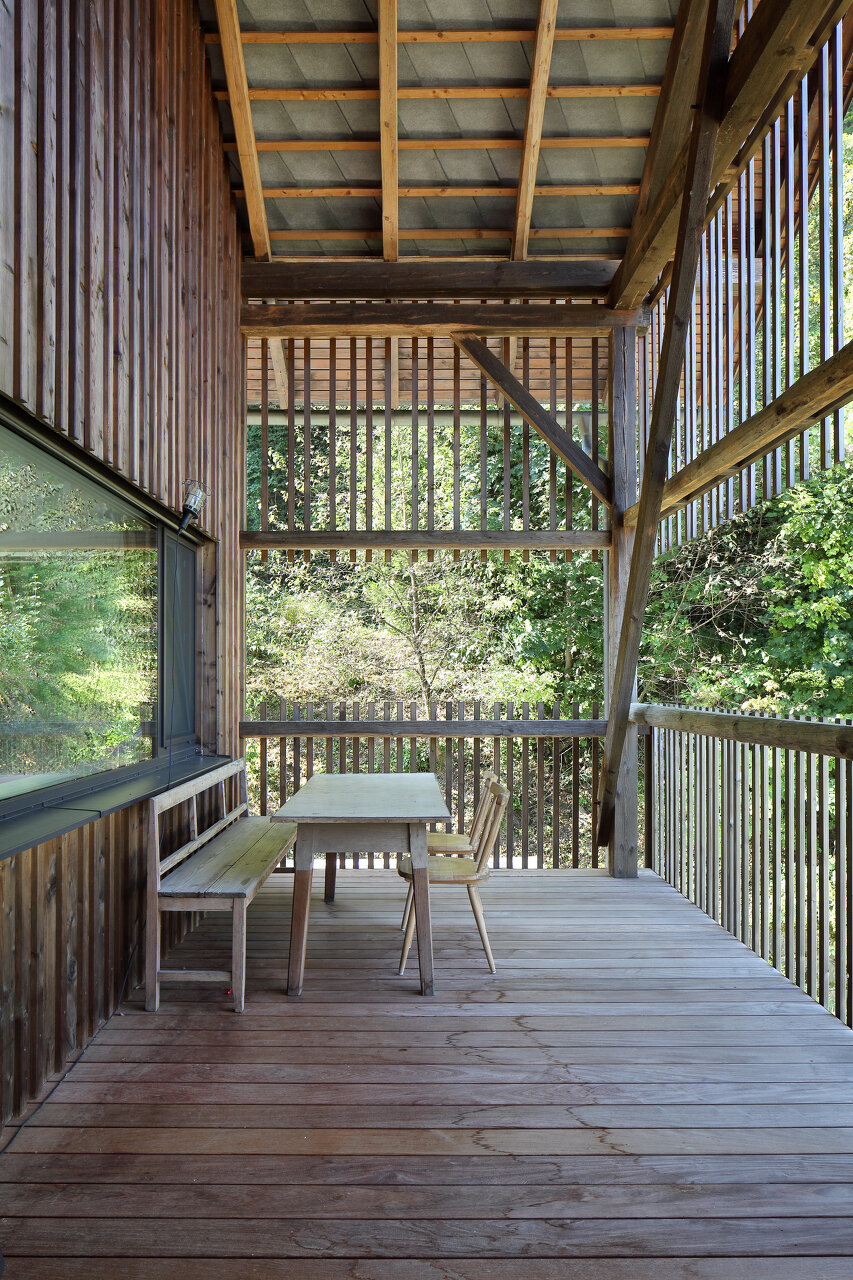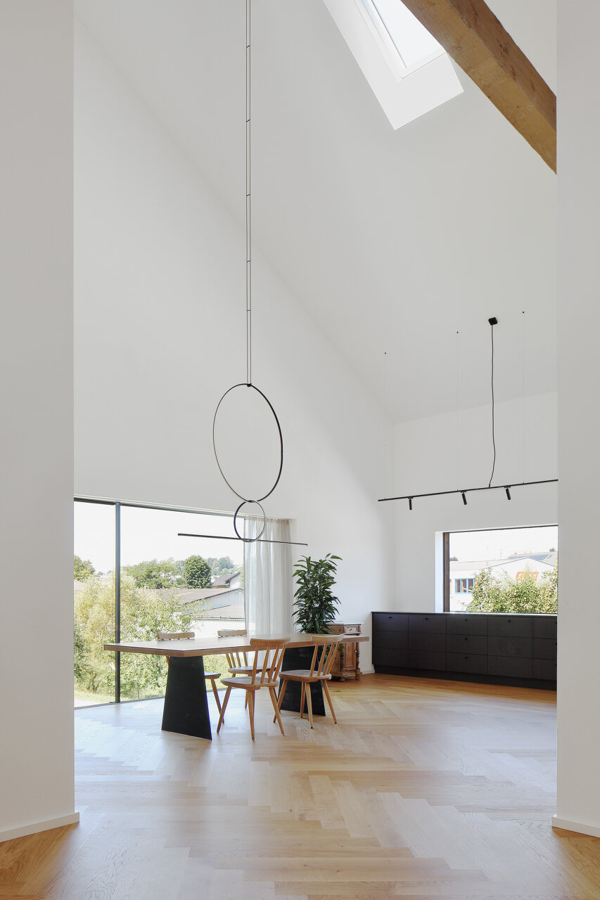 In einem zweiten Schritt wurde die Tenne als Wohnraum für die nachfolgende Generation ausgebaut. Die bestehende Tragstruktur des Daches blieb dabei als Sichtkonstruktion erhalten. In den hohen, offenen Wohn- und Essbereich wurde eine geschützte Terrasse eingeschnitten. Im Erdgeschoß wurde die vormalige Durchfahrt zwischen Wohnbereich und Stall zur Erschließungszone für die neue Wohnung im Obergeschoß . Sie dient zugleich als Schnittstelle zwischen den Wohneinheiten und einem gemeinschaftlich genutzten Raum, der sich für Familienfeiern oder ähnliche Nutzungen anbietet.
