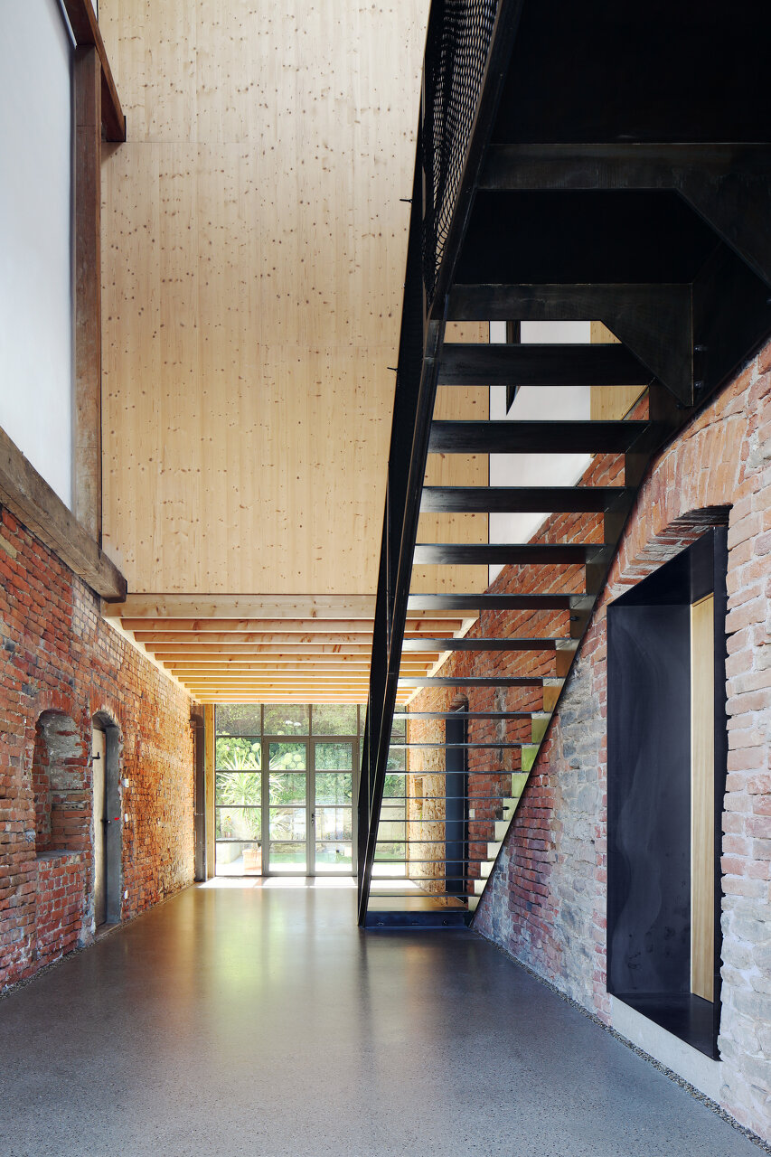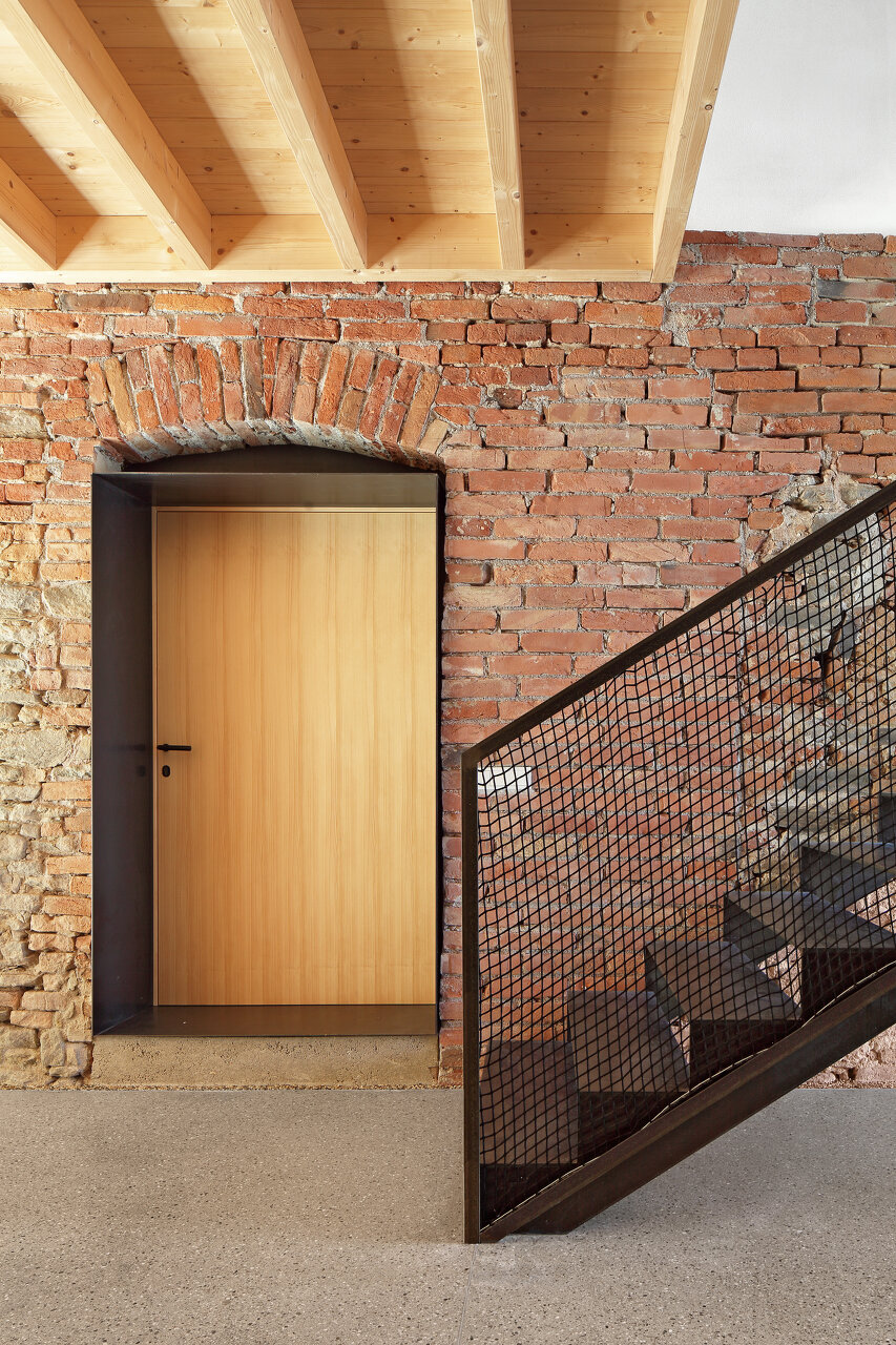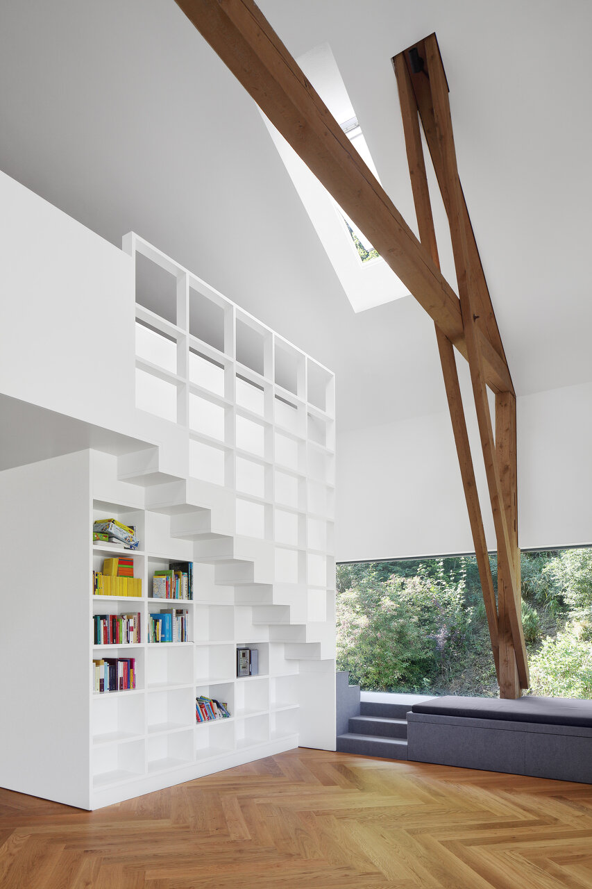 In einem zweiten Schritt wurde die Tenne als Wohnraum für die nachfolgende Generation ausgebaut. Die bestehende Tragstruktur des Daches blieb dabei als Sichtkonstruktion erhalten. In den hohen, offenen Wohn- und Essbereich wurde eine geschützte Terrasse eingeschnitten. Im Erdgeschoß wurde die vormalige Durchfahrt zwischen Wohnbereich und Stall zur Erschließungszone für die neue Wohnung im Obergeschoß . Sie dient zugleich als Schnittstelle zwischen den Wohneinheiten und einem gemeinschaftlich genutzten Raum, der sich für Familienfeiern oder ähnliche Nutzungen anbietet.