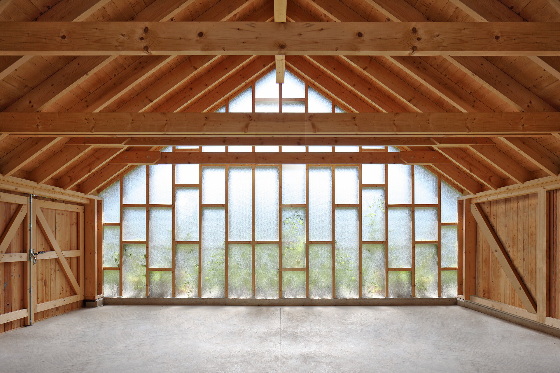 Vielfältig nutzbar ist auch das neu errichtete Garagengebäude, das durch seine Struktur und die Fassade aus transluzenten Stegplatten gleichermaßen Raum für Traktoren, Tischtennisturniere oder zur Pflanzenaufzucht bereitstellt. (Text: ArchitektIn, bearbeitet)