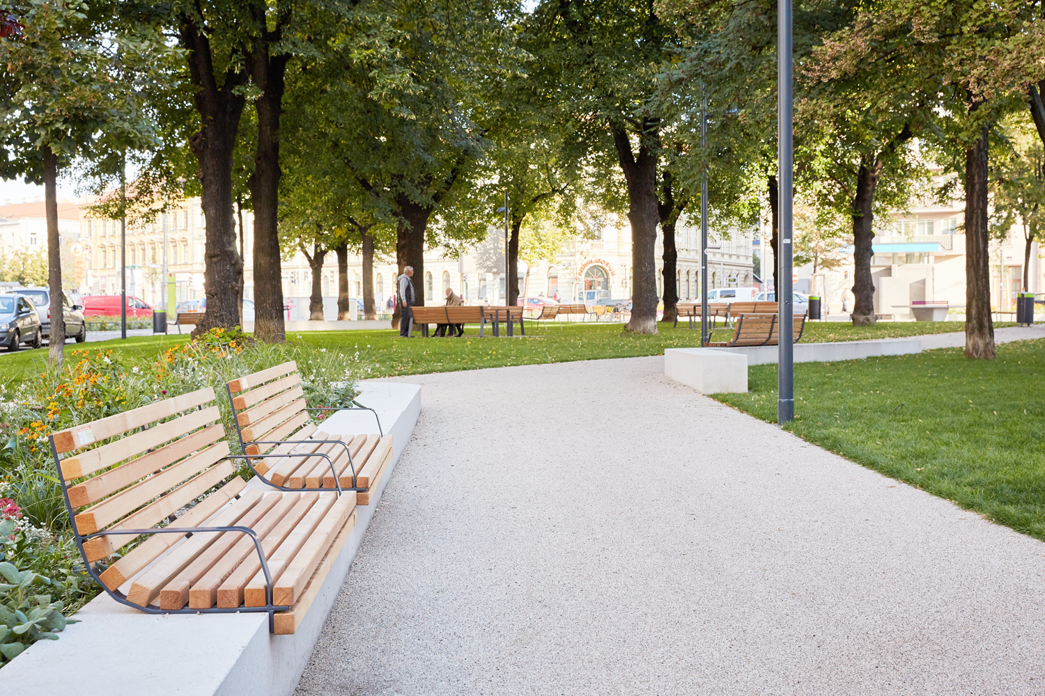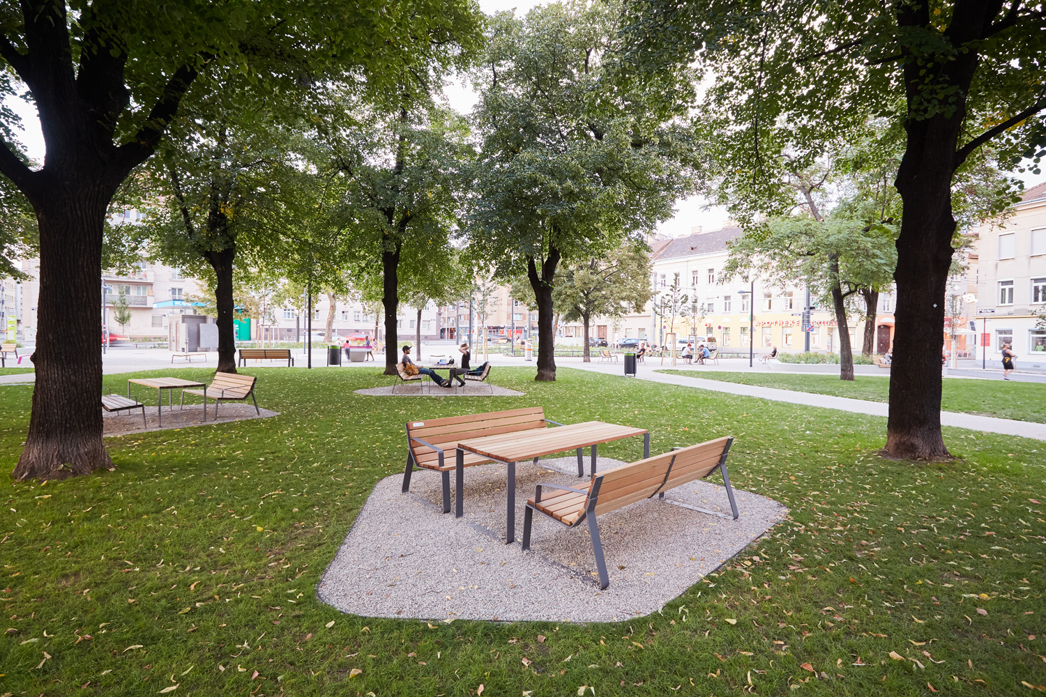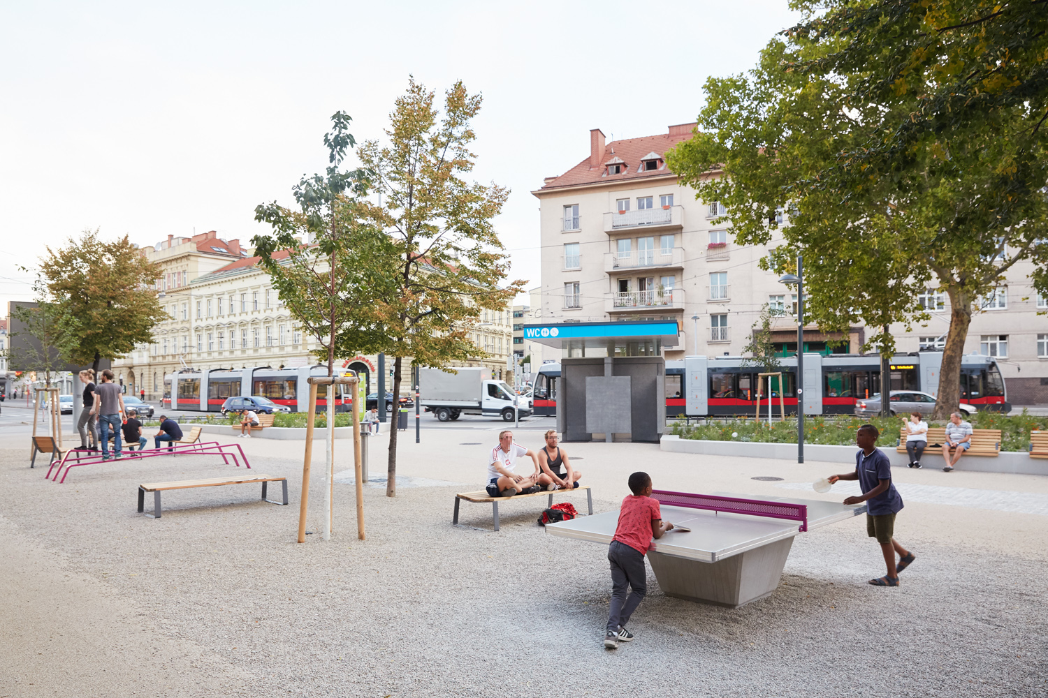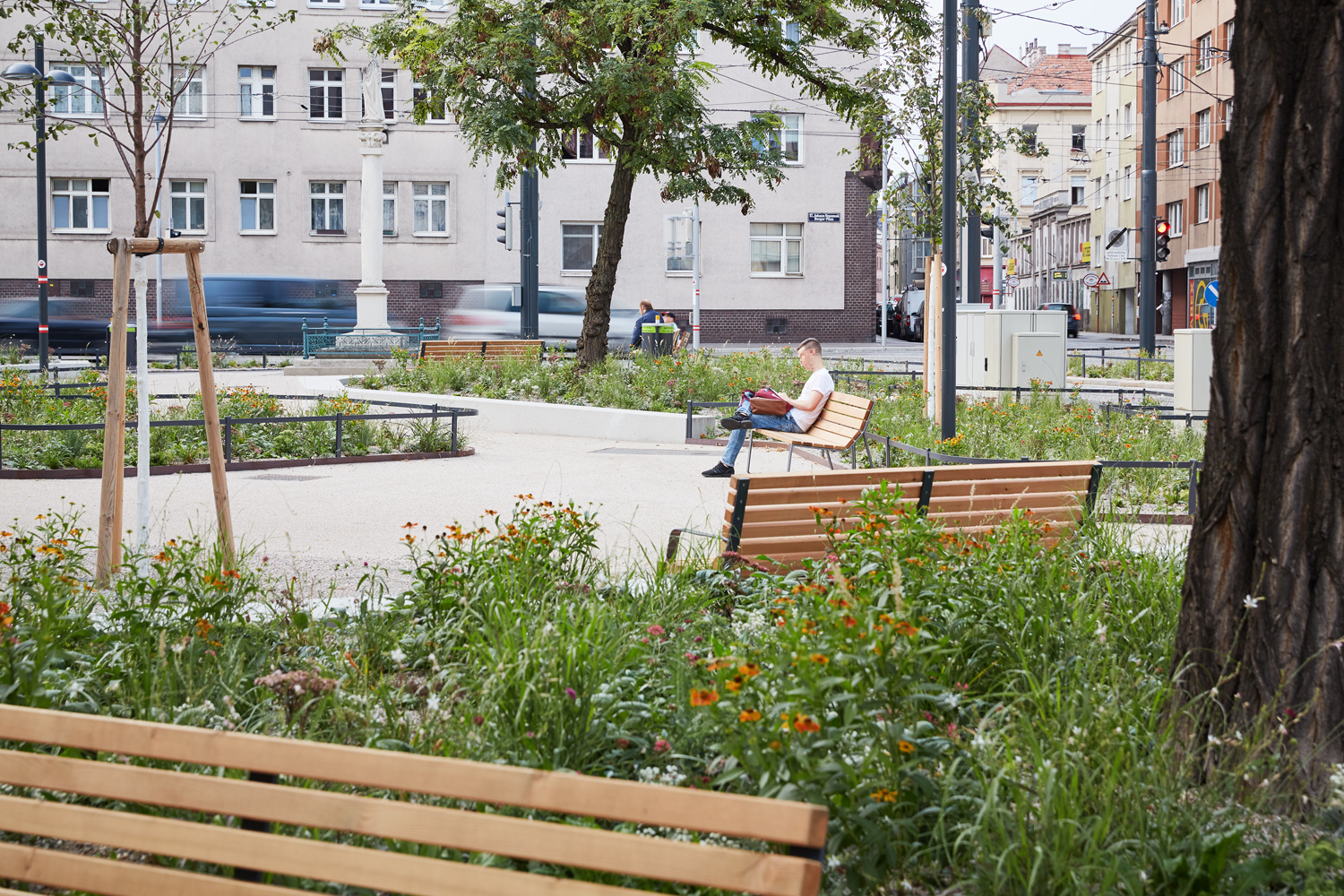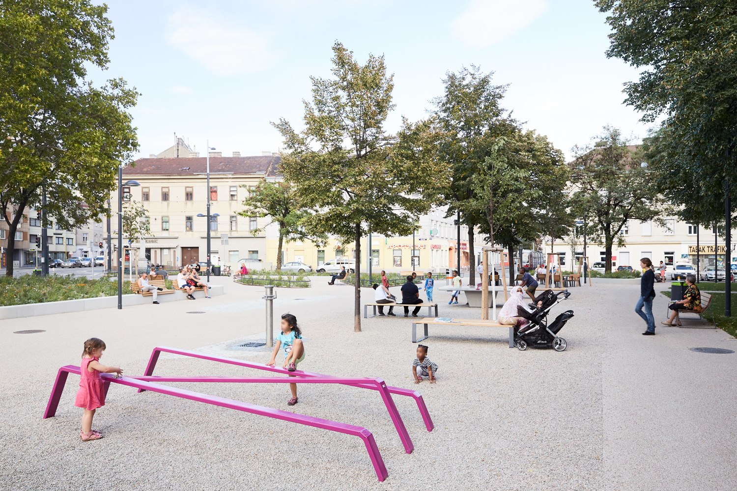 Das Gestaltungskonzept verbindet den nördlichen urbanen Bereich rund um die Mariensäule mit dem von Bestandsbäumen geprägten Grünraum im Süden des Platzes. Letzterer bietet schattige Verweilmöglichkeiten für ruhige und passive Nutzung, wohingegen der urbane Norden des Platzes intensiv bespielt werden kann. Die Eingangssituation lädt mit Stauden- und Gräserpflanzungen die Passant:innen in den Platz ein. Im Zentrum des Platzes stehen ein Wasserspiel, ein Tischtennistisch, Spieltische und zahlreiche Sitzmöglichkeiten und schaffen so einen Treffpunkt in der Nachbarschaft. (Text: Landschaftsarchitektin)