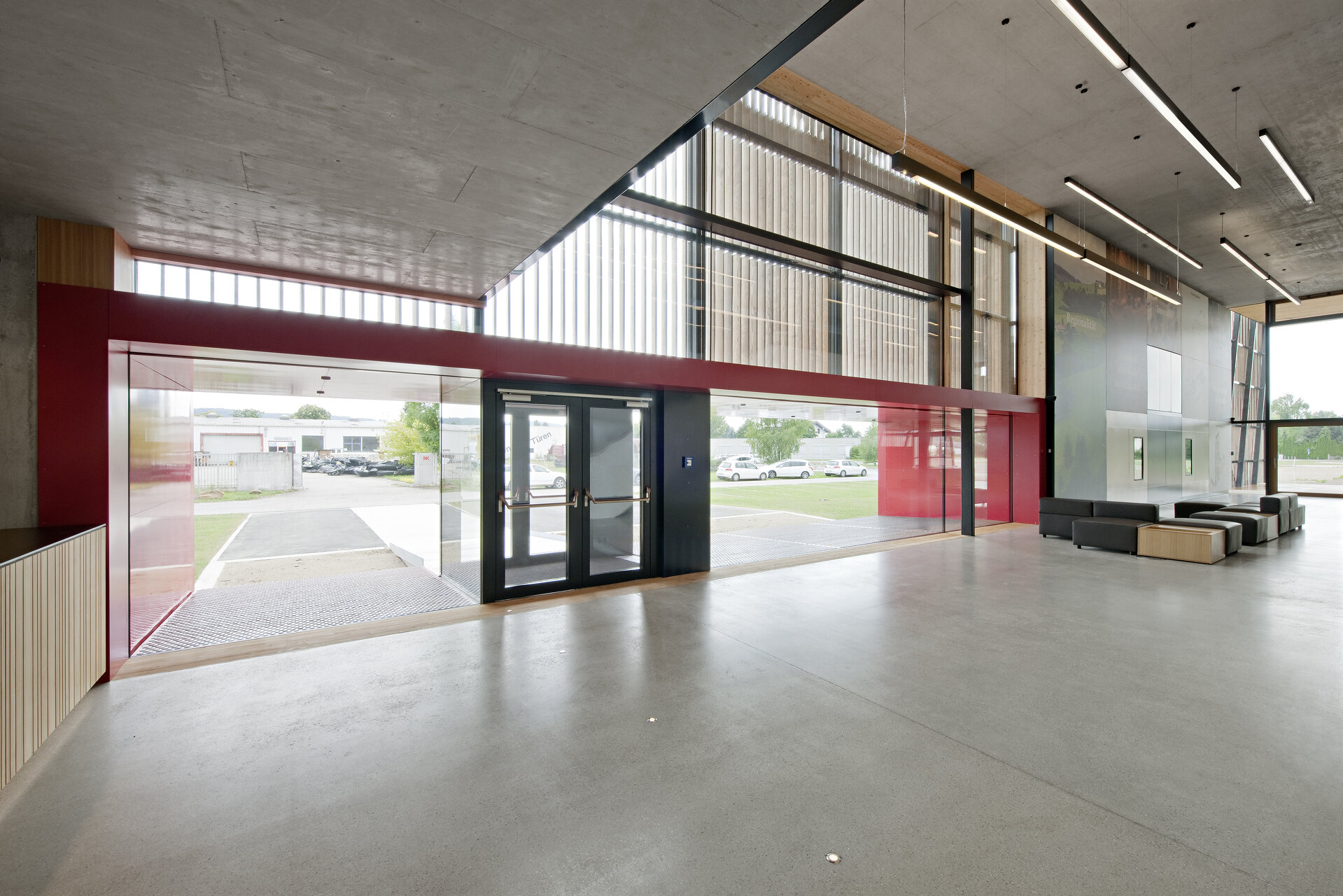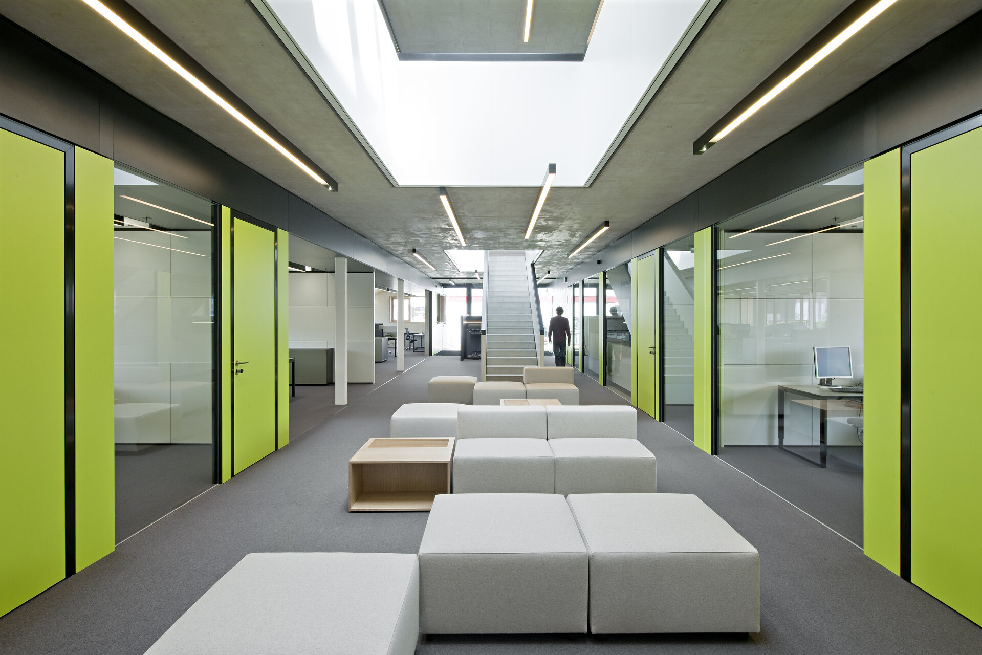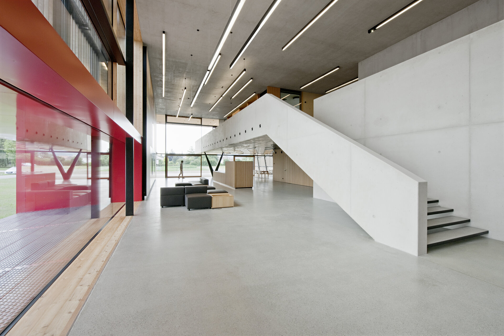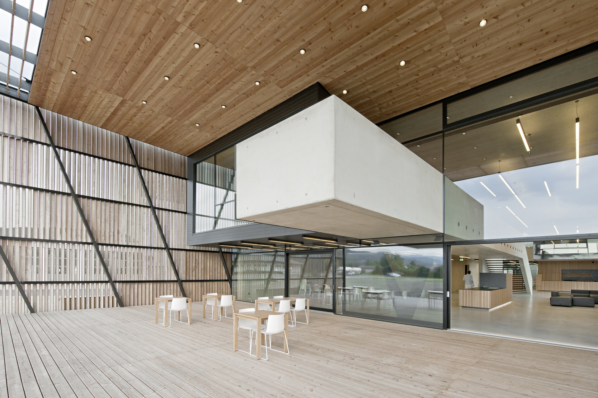 Die Terrasse öffnet sich als Erweiterung des Speisesaals zu einem Schaugarten, der die wesentlichen Rohstoffe für die Futtermittelherstellung zeigt und die Längserstreckung des Baukörpers zusätzlich betont. In der großen Halle, die Empfang, Büro wie Konferenzbereich verbindet und die Kantine aufnimmt, zeichnen sich die Seminar- und Besprechungsräume als klar definierte Baukörper ab und gliedern den Raum. Von einer Galerie, die, auf einer einzigen Stütze ruhend, den Hallenbereich überspannt, können auf einer raumhohen Installation des Büros Liquid Frontiers Informationen zur Tätigkeit und Philosophie des Unternehmens betrachtet werden.
