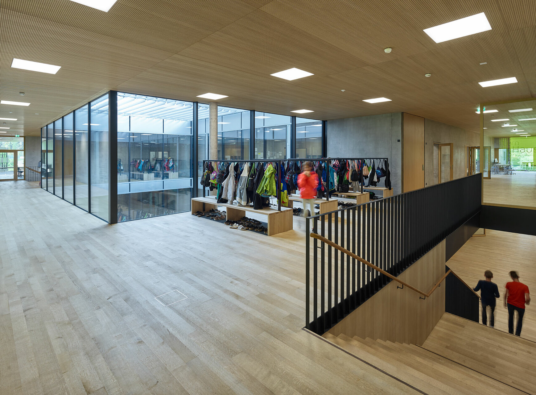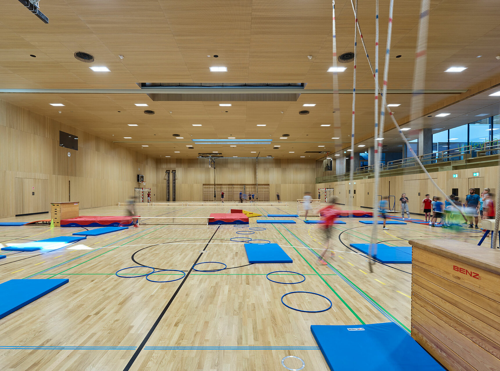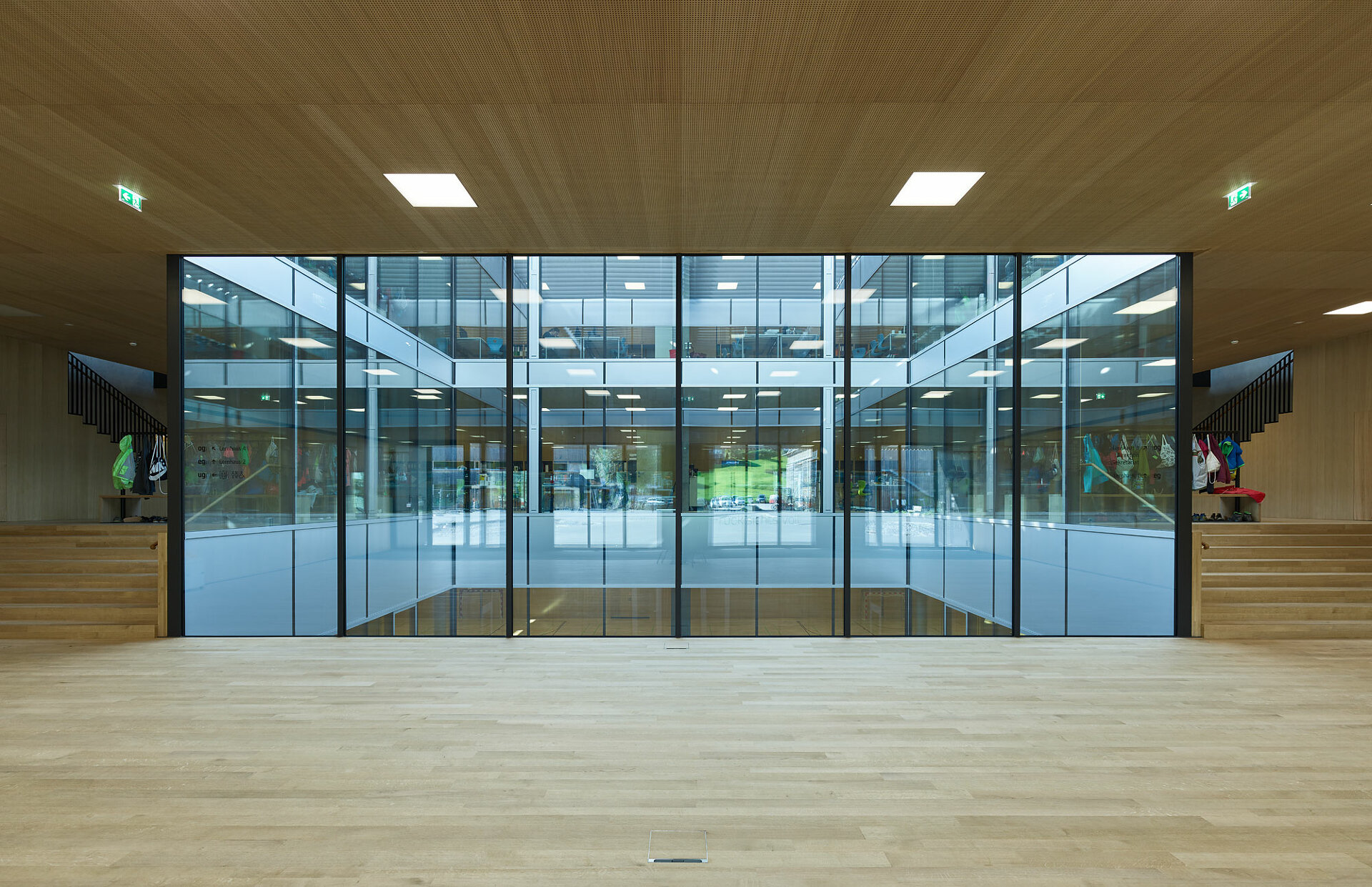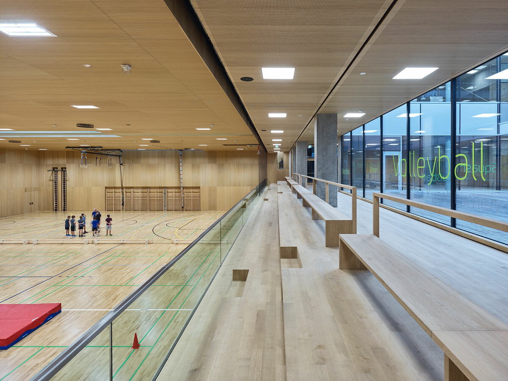 Während die Dreifachturnhalle beinah zur Gänze im Gelände verschwindet, wurden die Schulräume darüber in kompaktem, zweigeschoßigem Baukörper auf quadratischem Grundriss organisiert. Das Haus wurde so positioniert, dass es im Zusammenspiel mit den benachbarten Bauten von Sozialzentrum, Kindergarten und BORG einen großzügigen, campusartigen Freiraum fasst. Zwei gläsern überdachte Atrien sorgen für Licht, Transparenz und Sichtbeziehungen bis tief ins Gebäudeinnere. Unterschiedlich tief ins Volumen eingeschnitten, bieten sie sich zudem als innenliegende „Pausenhöfe“ an – der eine für die umliegenden Unterrichtsräume und Lernlandschaften im Erdgeschoß, der andere auf der Sportebene im ersten Untergeschoß, wo sich die Foyers und Sitztribünen für die darunterliegende Turnhalle um das Atrium gruppieren.