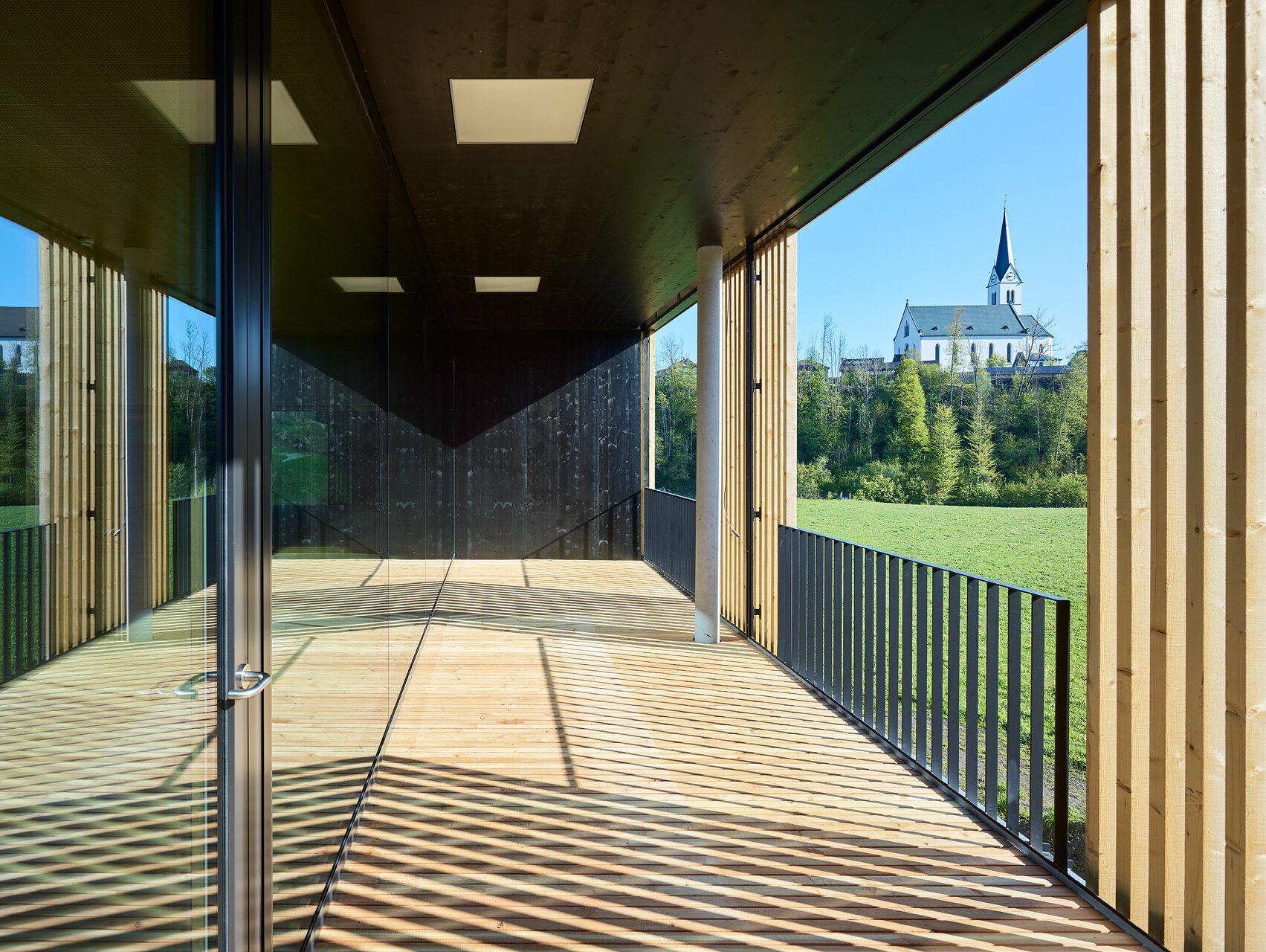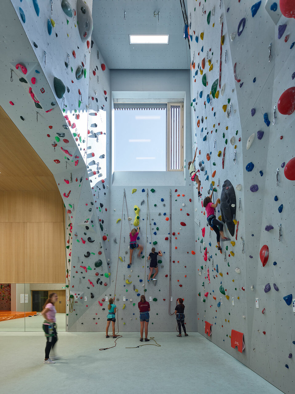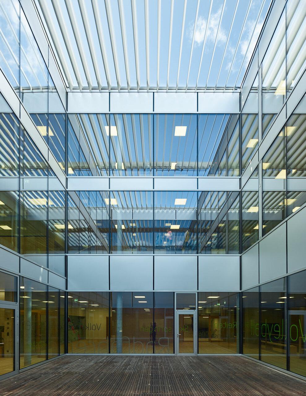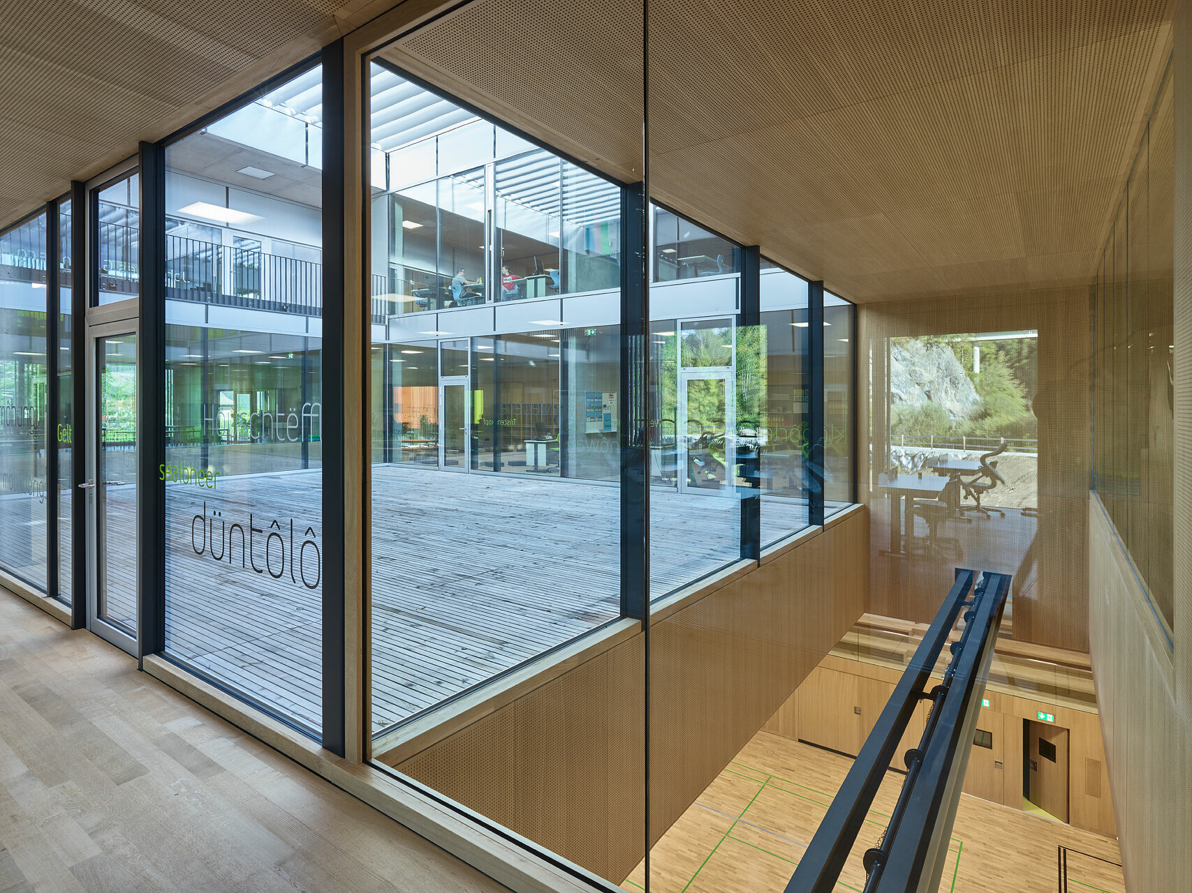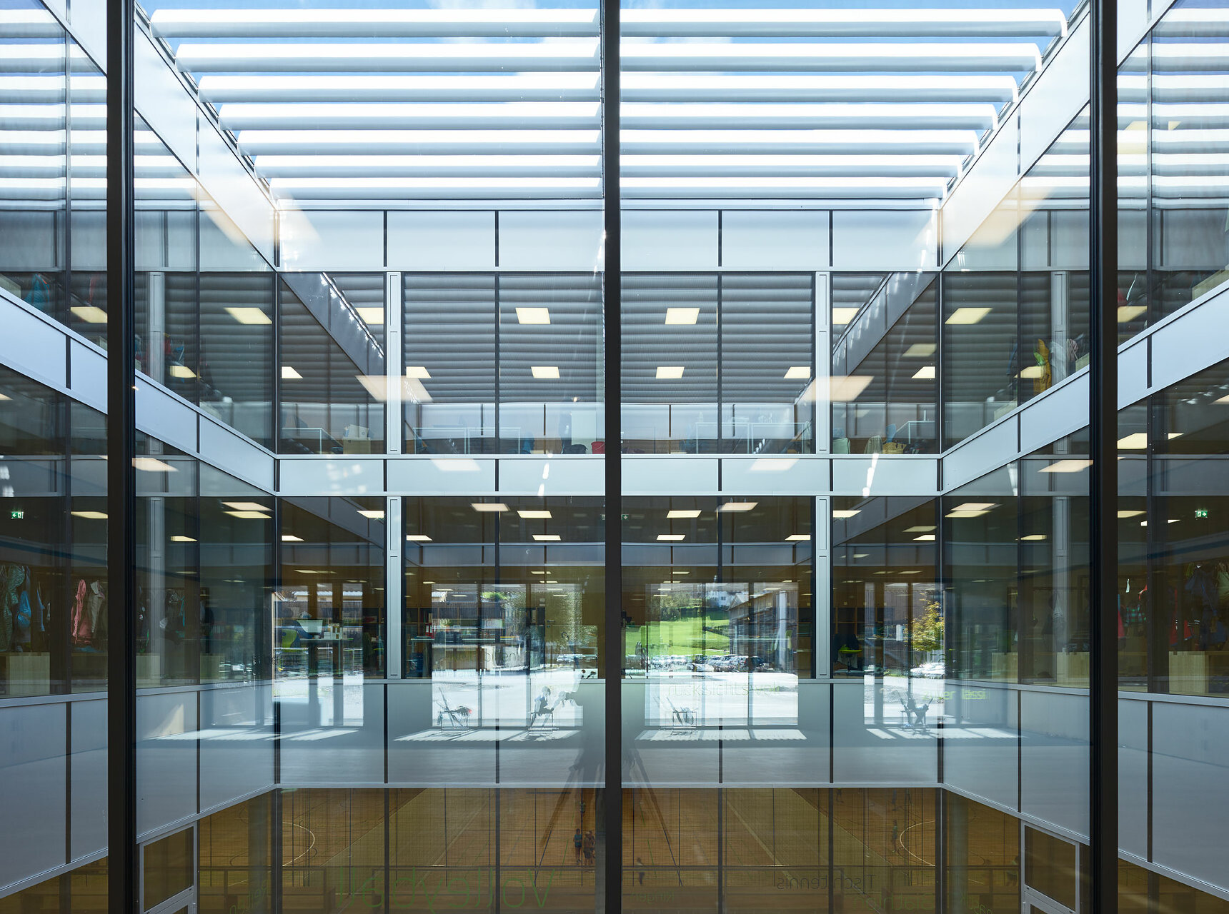 Während die Dreifachturnhalle beinah zur Gänze im Gelände verschwindet, wurden die Schulräume darüber in kompaktem, zweigeschoßigem Baukörper auf quadratischem Grundriss organisiert. Das Haus wurde so positioniert, dass es im Zusammenspiel mit den benachbarten Bauten von Sozialzentrum, Kindergarten und BORG einen großzügigen, campusartigen Freiraum fasst. Zwei gläsern überdachte Atrien sorgen für Licht, Transparenz und Sichtbeziehungen bis tief ins Gebäudeinnere. Unterschiedlich tief ins Volumen eingeschnitten, bieten sie sich zudem als innenliegende „Pausenhöfe“ an – der eine für die umliegenden Unterrichtsräume und Lernlandschaften im Erdgeschoß, der andere auf der Sportebene im ersten Untergeschoß, wo sich die Foyers und Sitztribünen für die darunterliegende Turnhalle um das Atrium gruppieren.