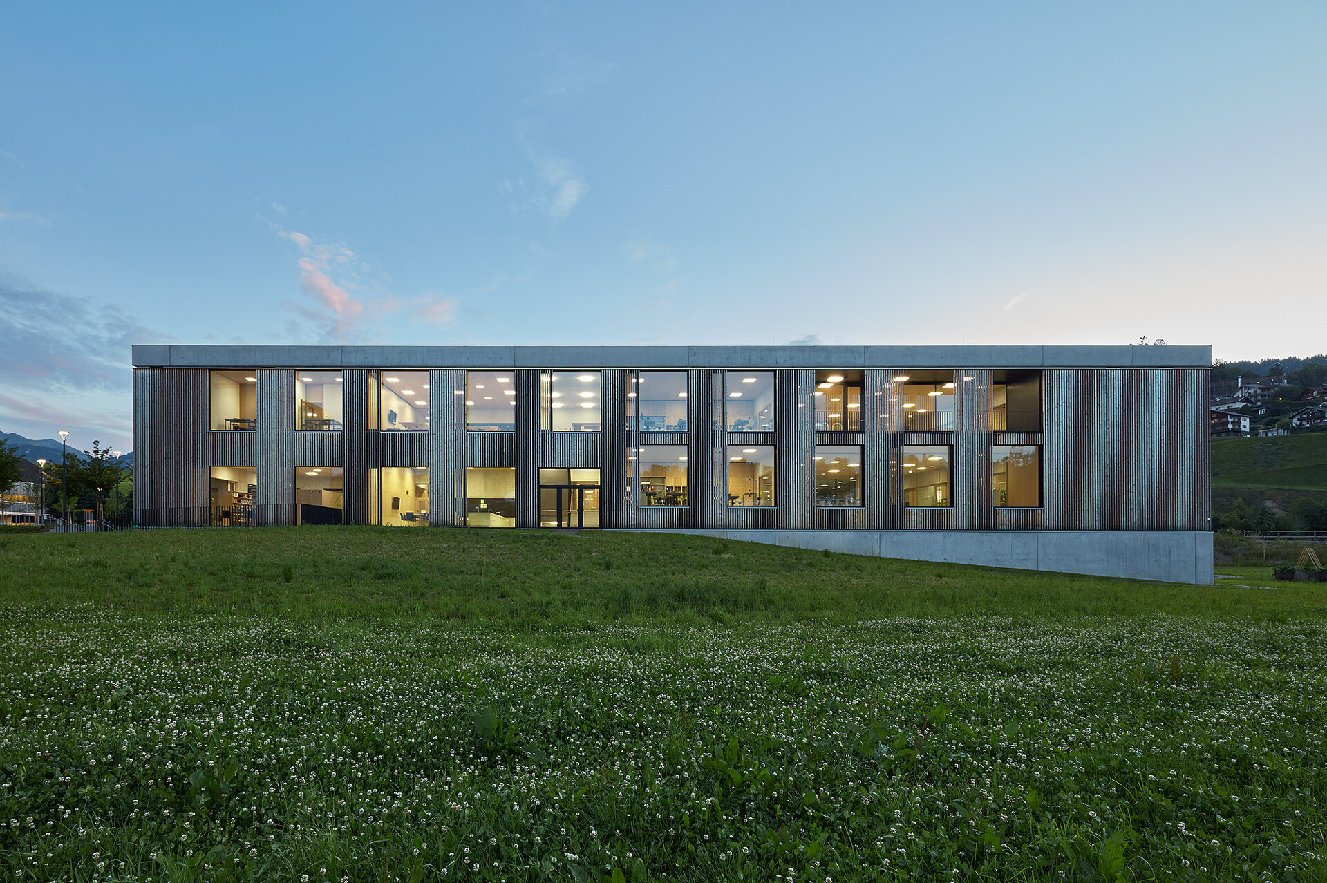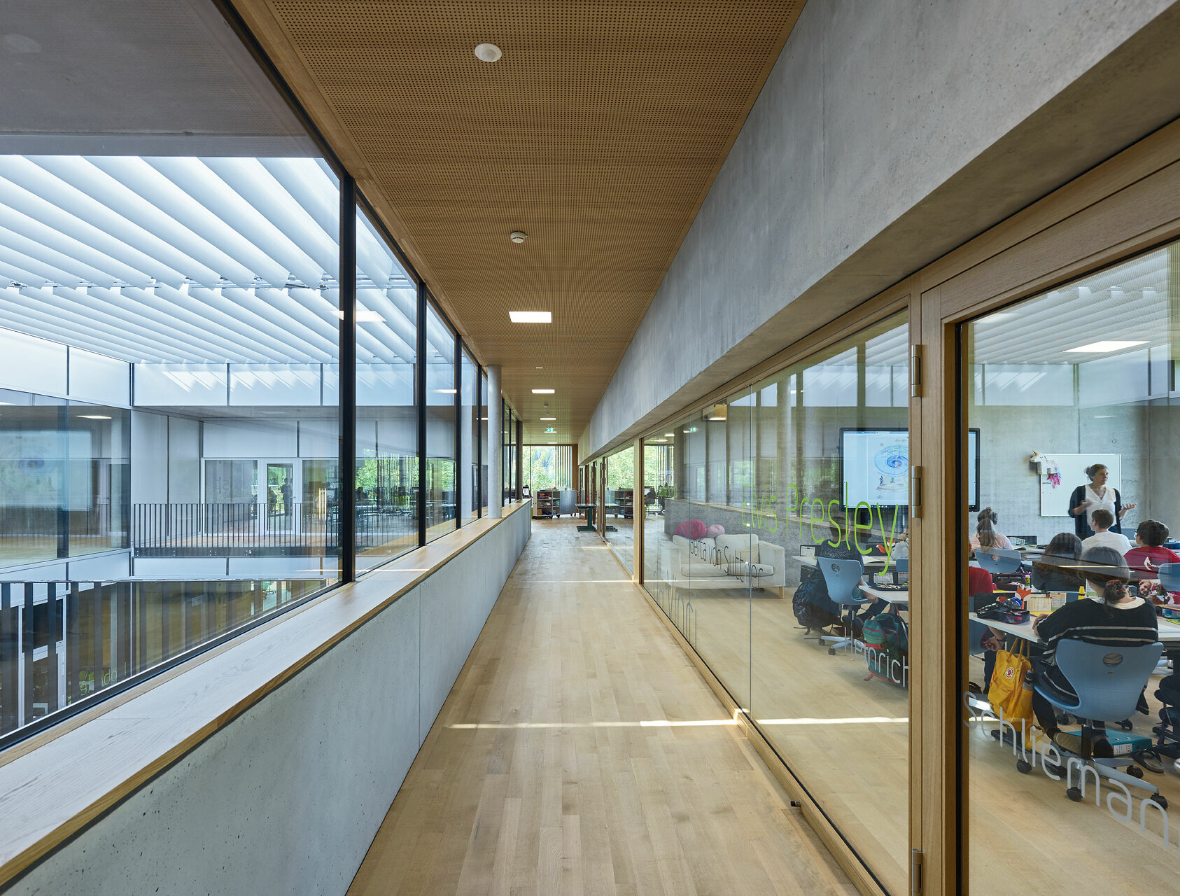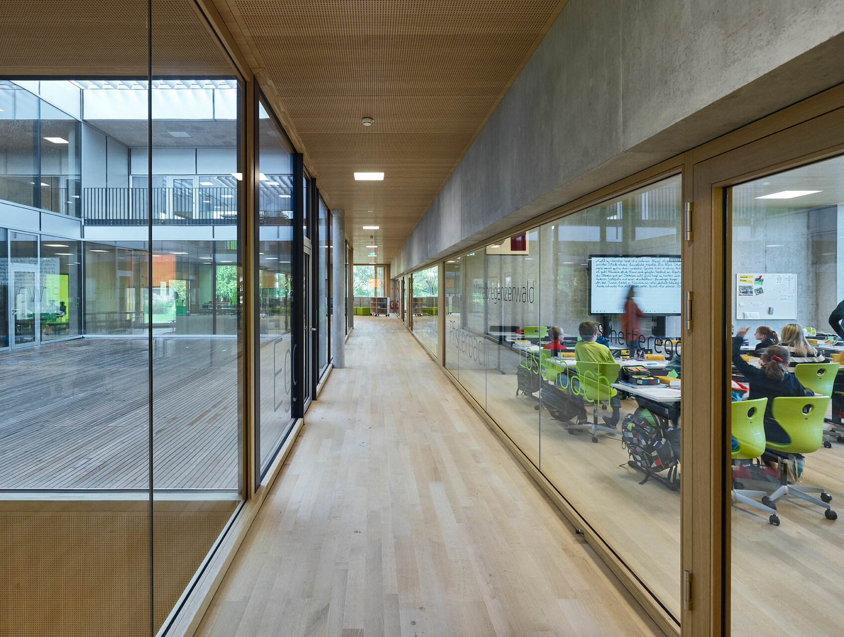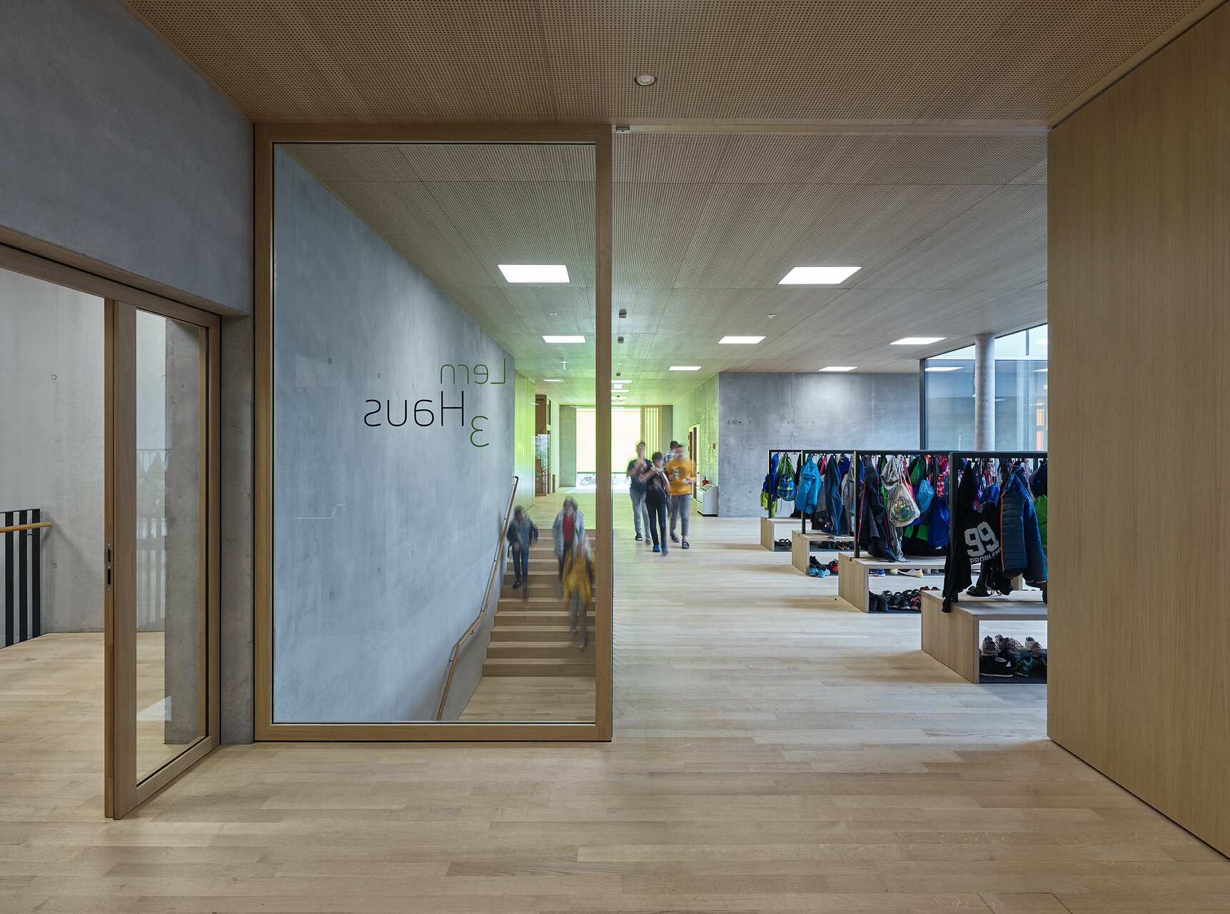 Als Schulbau mit Clusterstruktur ausgeführt, teilen sich je vier Klassen eine gemeinsame Lernlandschaft, die sich jeweils mit einer Loggia ins Freie erweitern lässt. Sichtbeton, Eichenholz und Glas bestimmen das Erscheinungsbild im Inneren, wobei auch das Mobiliar in weiten Teilen vom Architekten entworfen wurde. Der Massivbau wurde mit einer Fassade aus Fichtenlatten umhüllt, Jalousien in Orange und Grün sorgen für farbige Akzente. (Text: Tobias Hagleitner)