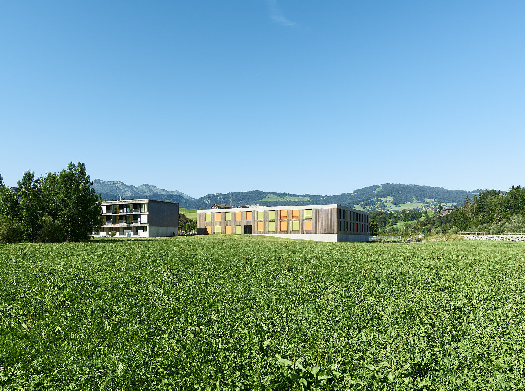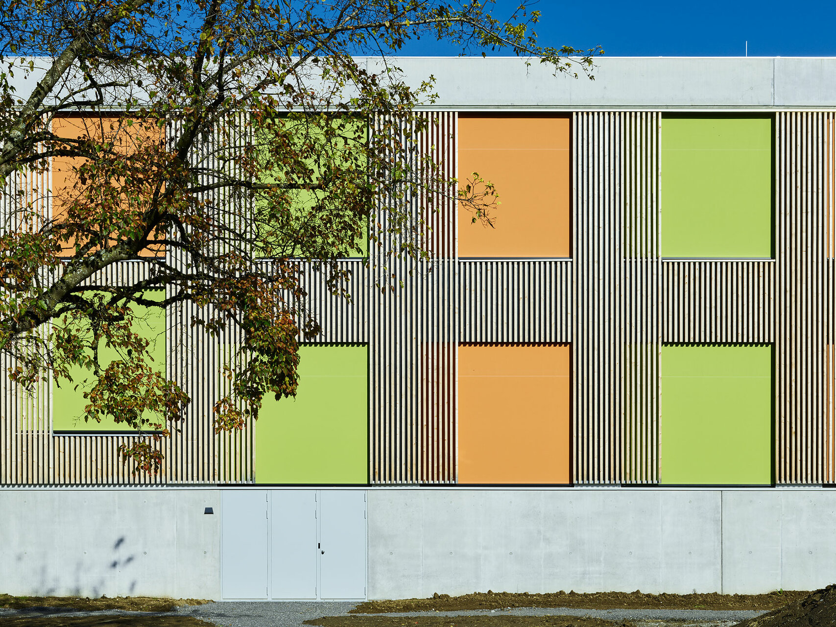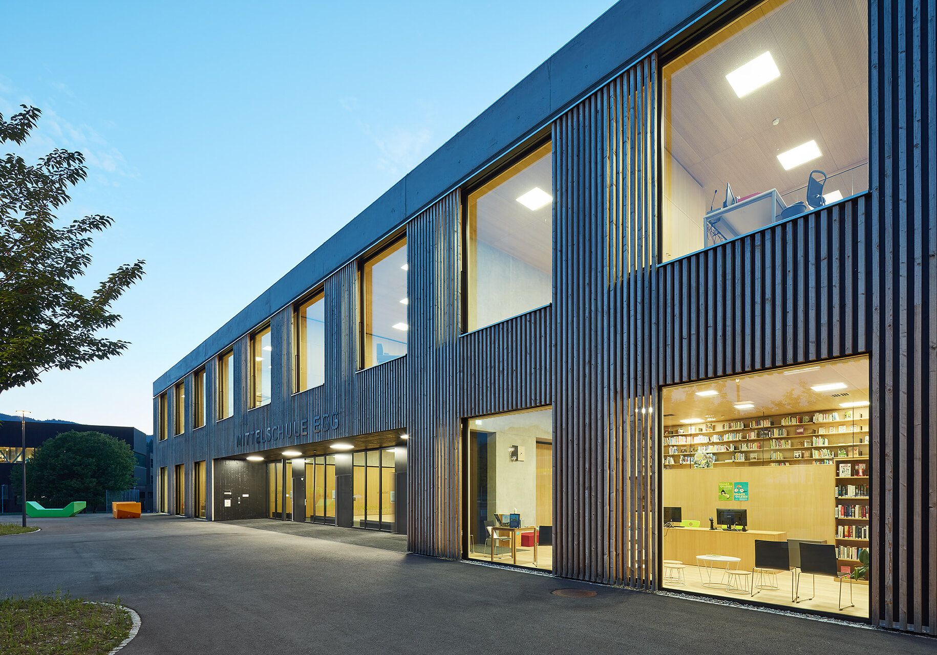 Als Schulbau mit Clusterstruktur ausgeführt, teilen sich je vier Klassen eine gemeinsame Lernlandschaft, die sich jeweils mit einer Loggia ins Freie erweitern lässt. Sichtbeton, Eichenholz und Glas bestimmen das Erscheinungsbild im Inneren, wobei auch das Mobiliar in weiten Teilen vom Architekten entworfen wurde. Der Massivbau wurde mit einer Fassade aus Fichtenlatten umhüllt, Jalousien in Orange und Grün sorgen für farbige Akzente. (Text: Tobias Hagleitner)