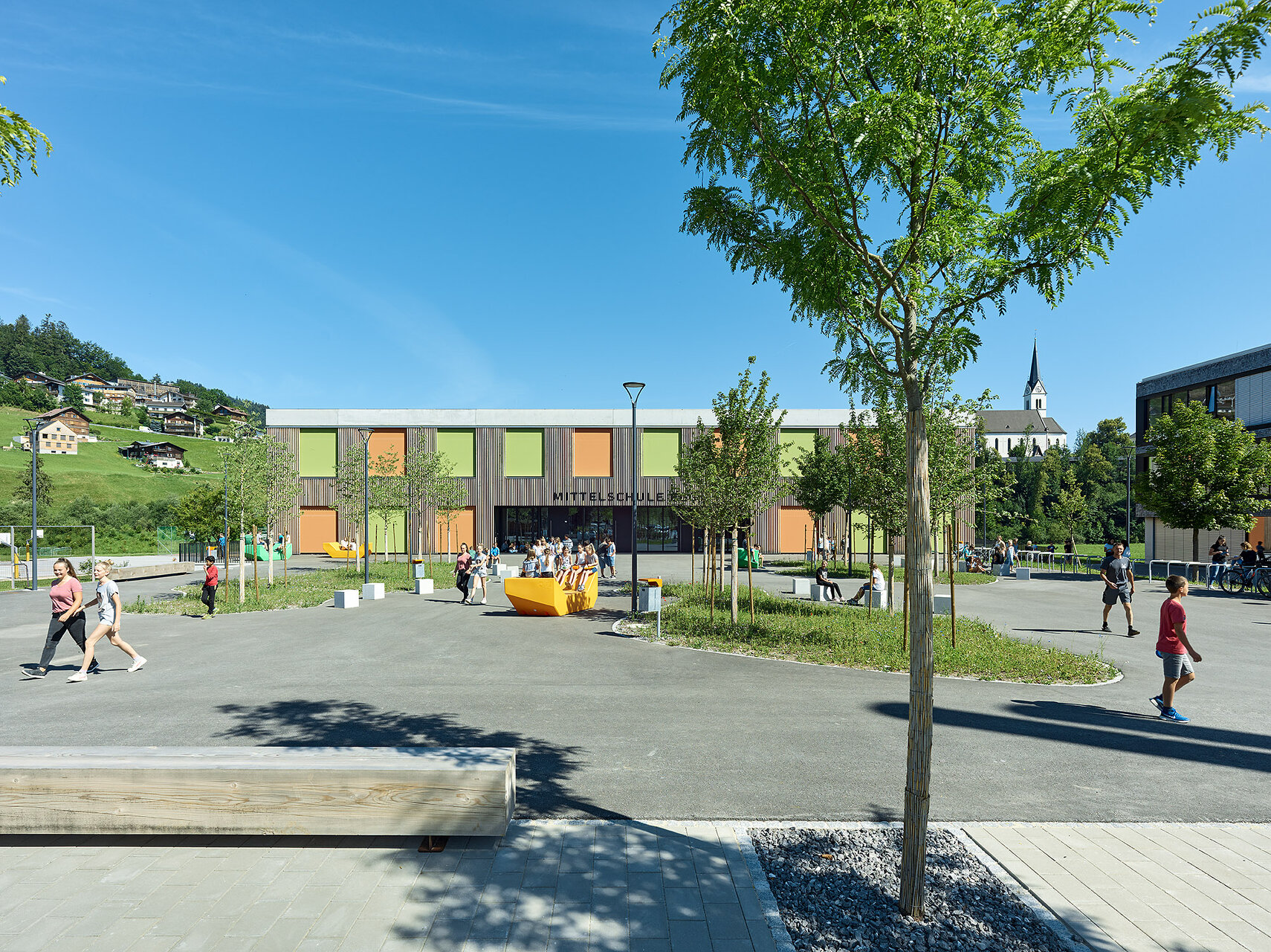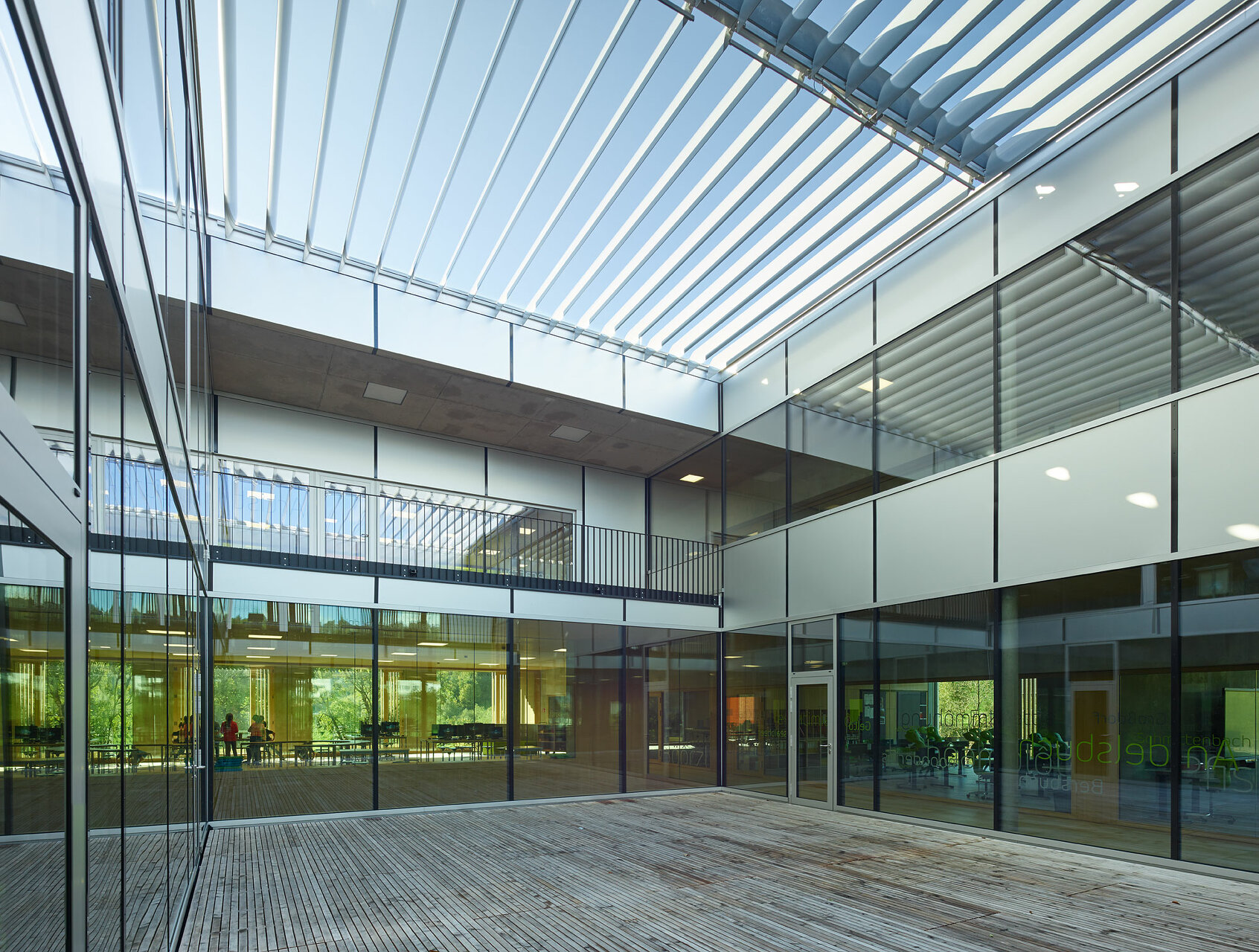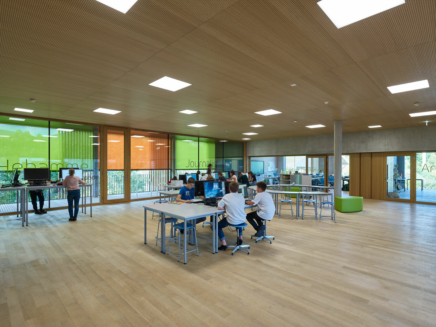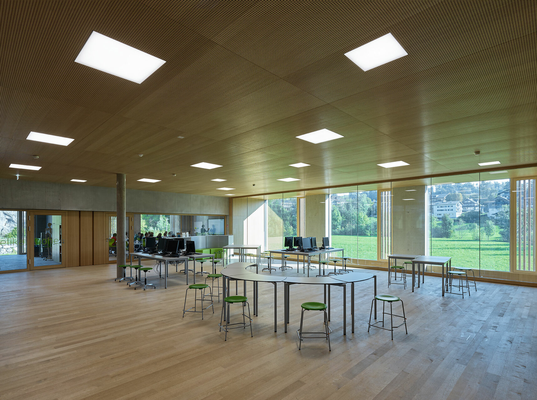 Als Schulbau mit Clusterstruktur ausgeführt, teilen sich je vier Klassen eine gemeinsame Lernlandschaft, die sich jeweils mit einer Loggia ins Freie erweitern lässt. Sichtbeton, Eichenholz und Glas bestimmen das Erscheinungsbild im Inneren, wobei auch das Mobiliar in weiten Teilen vom Architekten entworfen wurde. Der Massivbau wurde mit einer Fassade aus Fichtenlatten umhüllt, Jalousien in Orange und Grün sorgen für farbige Akzente. (Text: Tobias Hagleitner)