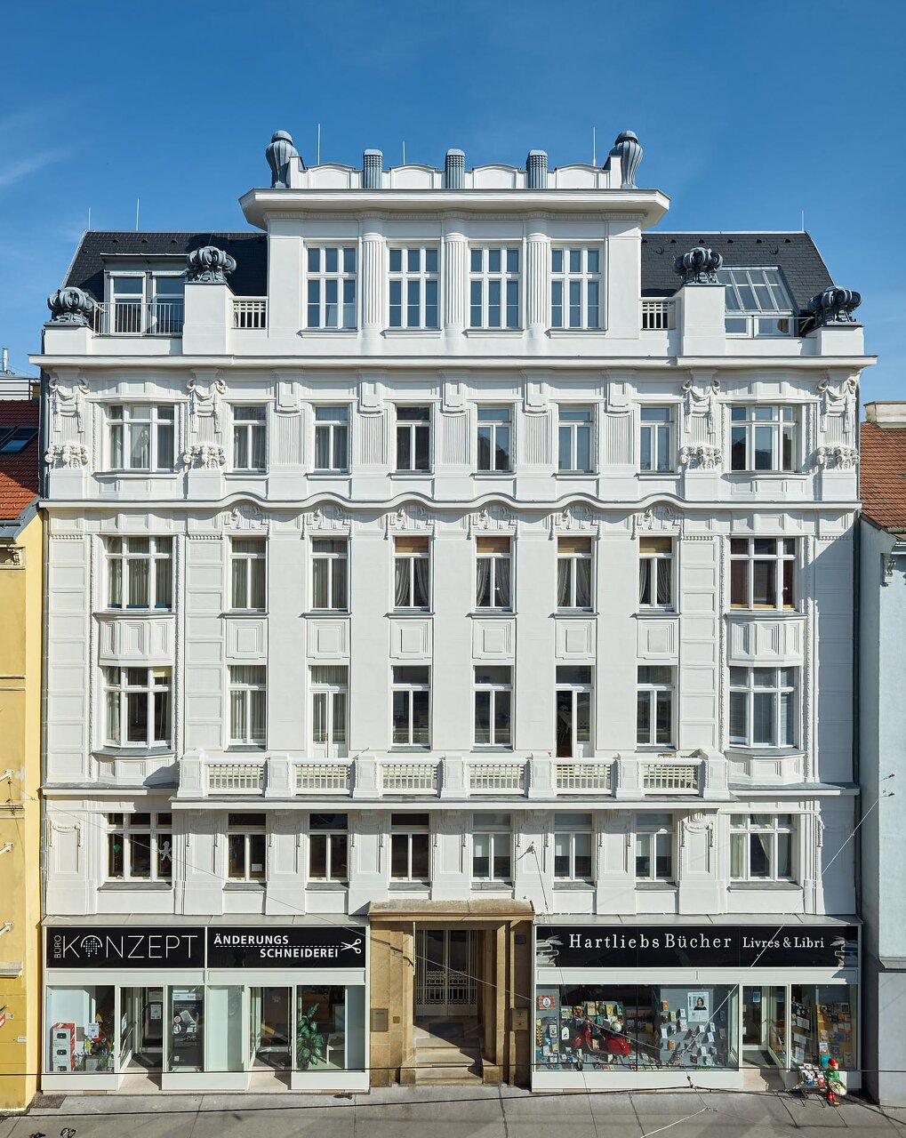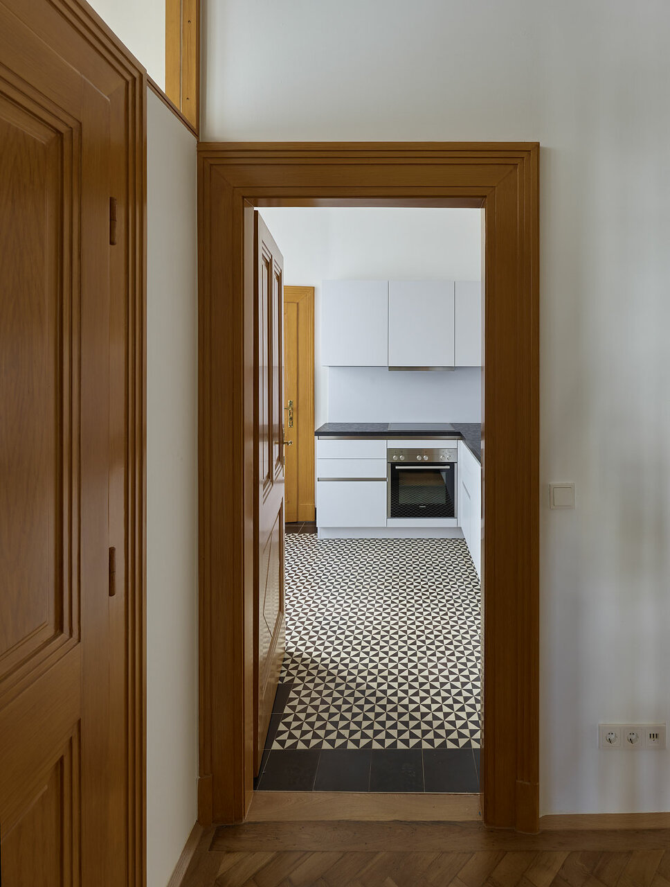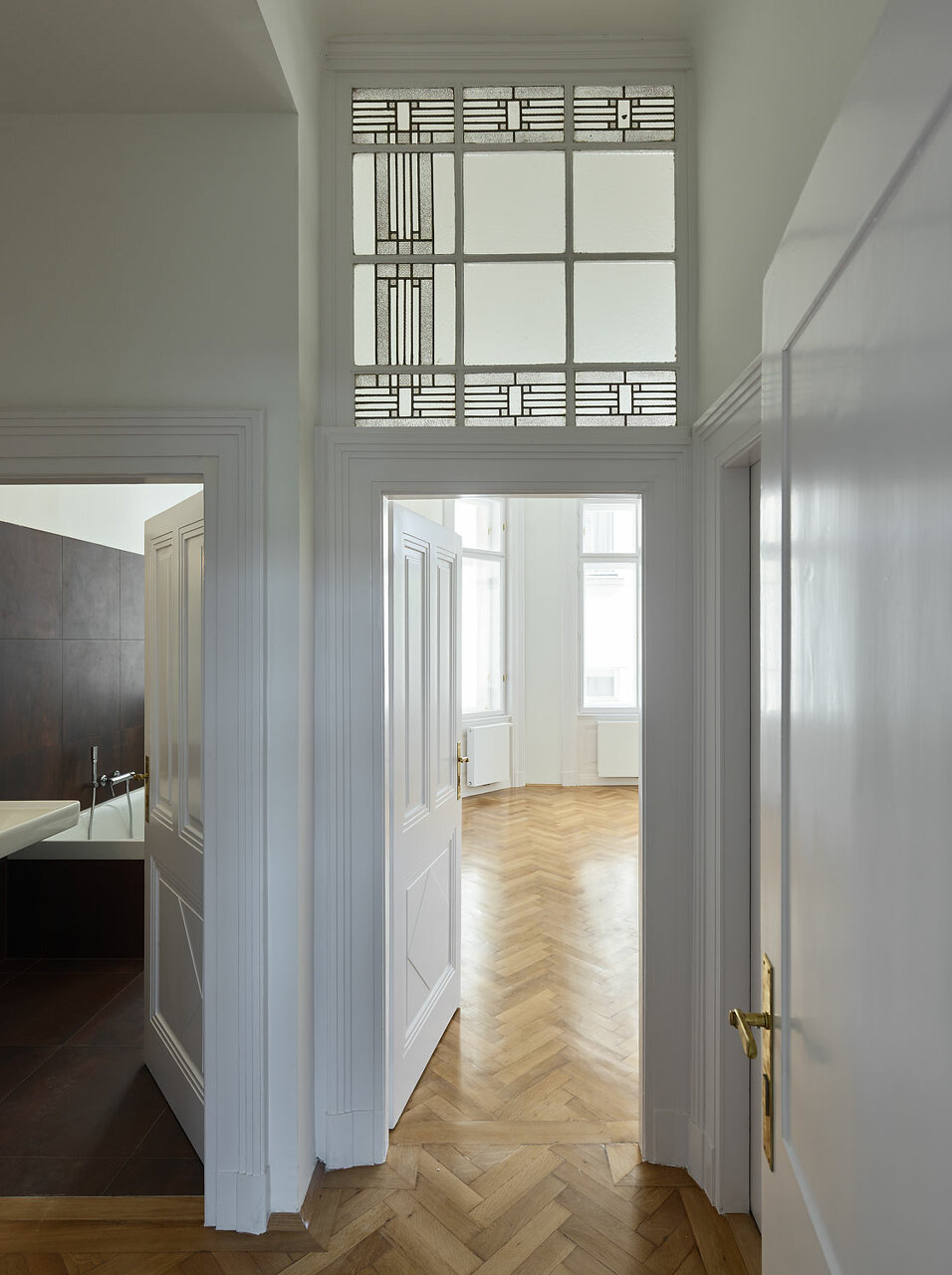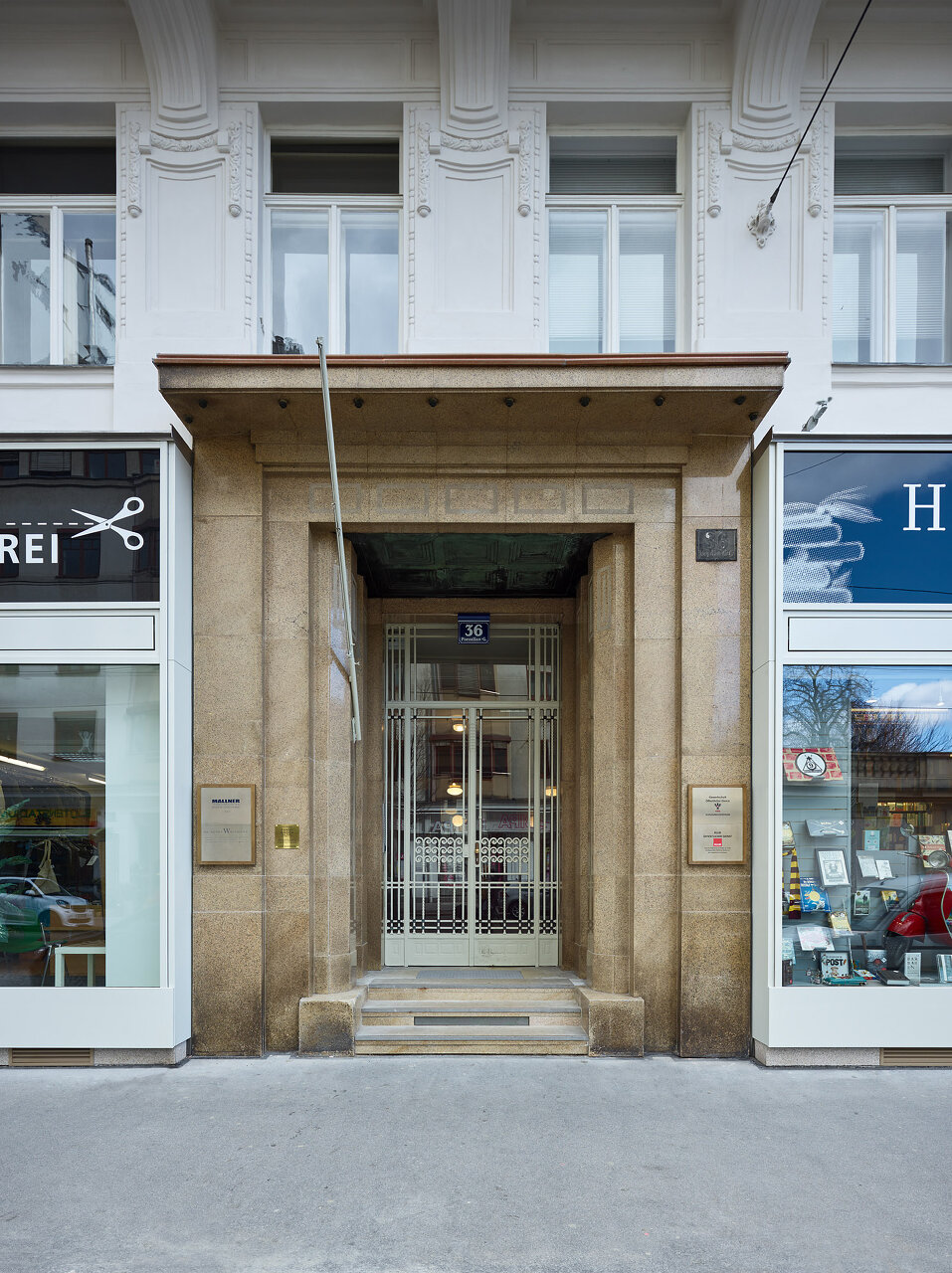 Bauaufgabe in der Porzellangasse 36 waren die Sanierung des gesamten denkmalgeschützten Hauses, das aus einem Straßen- und einem Hoftrakt besteht, der Einbau von zwei zusätzlichen Wohnungen im Dachstuhl des Hoftraktes, die Sanierung von vier Wohnungen, die von den Fliesen- und Parkettböden über die Fenster und Türen, die modernen Einbaukästen, Milchgläser in Zwischenwänden zur Optimierung der Belichtung bis hin zu Wandmalereien in der originalen Substanz erhalten waren.
