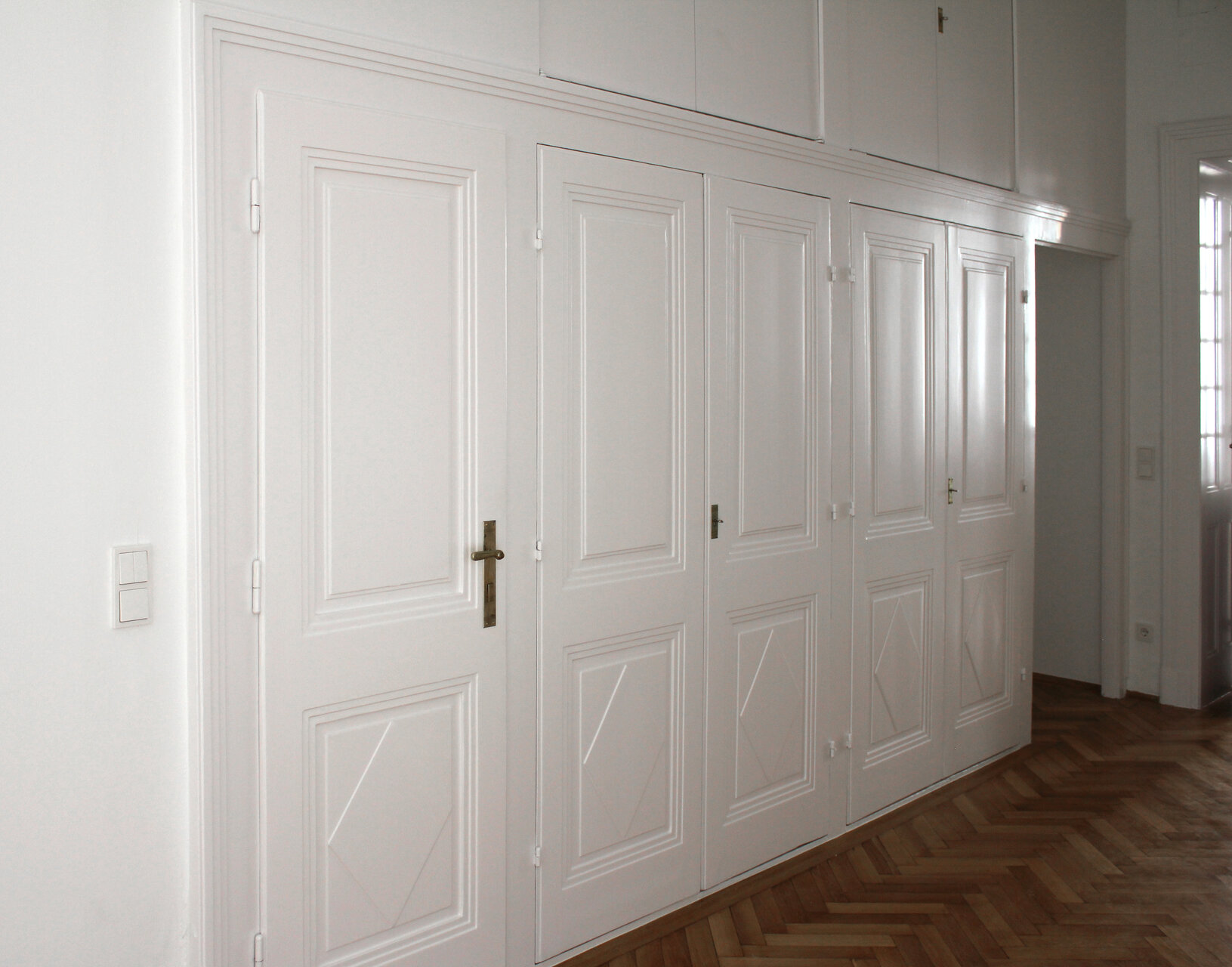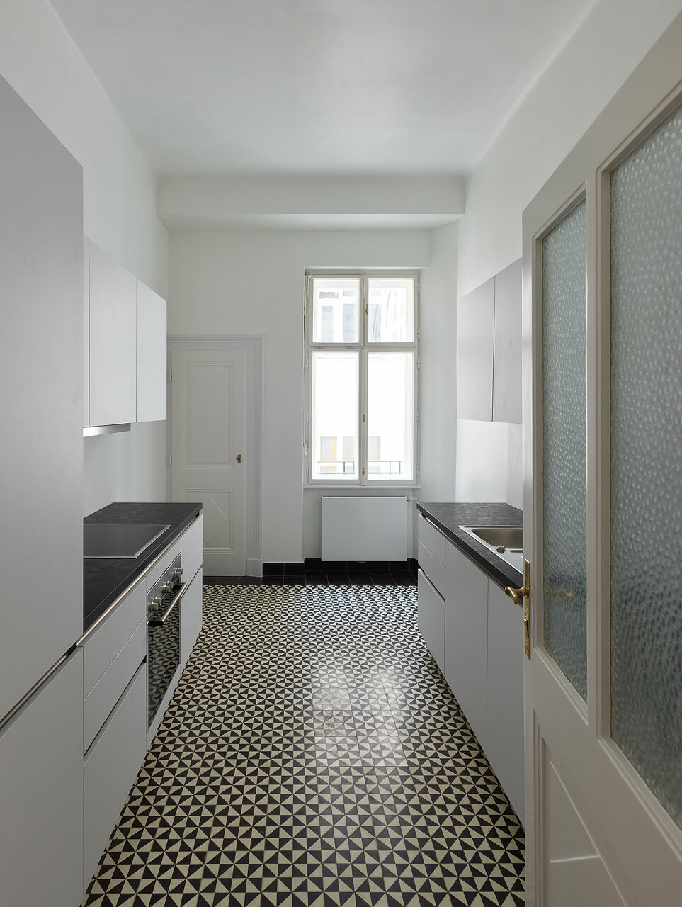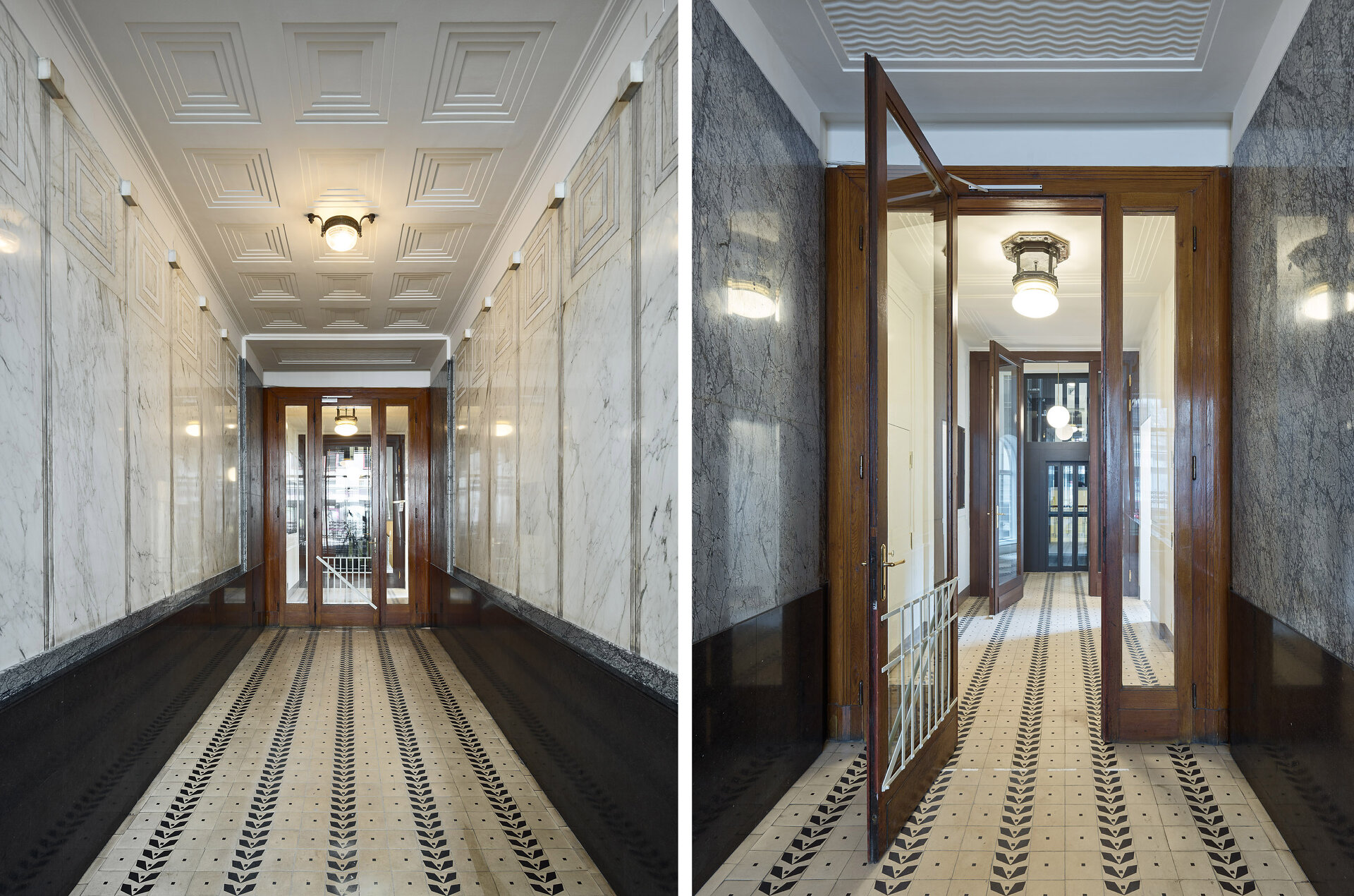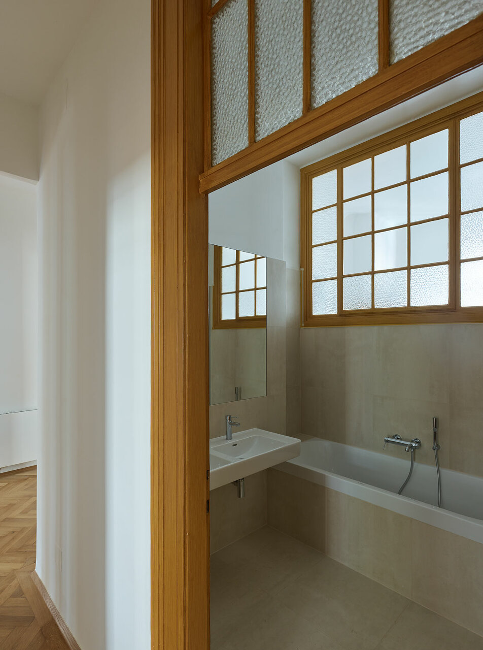 Bauaufgabe in der Porzellangasse 36 waren die Sanierung des gesamten denkmalgeschützten Hauses, das aus einem Straßen- und einem Hoftrakt besteht, der Einbau von zwei zusätzlichen Wohnungen im Dachstuhl des Hoftraktes, die Sanierung von vier Wohnungen, die von den Fliesen- und Parkettböden über die Fenster und Türen, die modernen Einbaukästen, Milchgläser in Zwischenwänden zur Optimierung der Belichtung bis hin zu Wandmalereien in der originalen Substanz erhalten waren.
