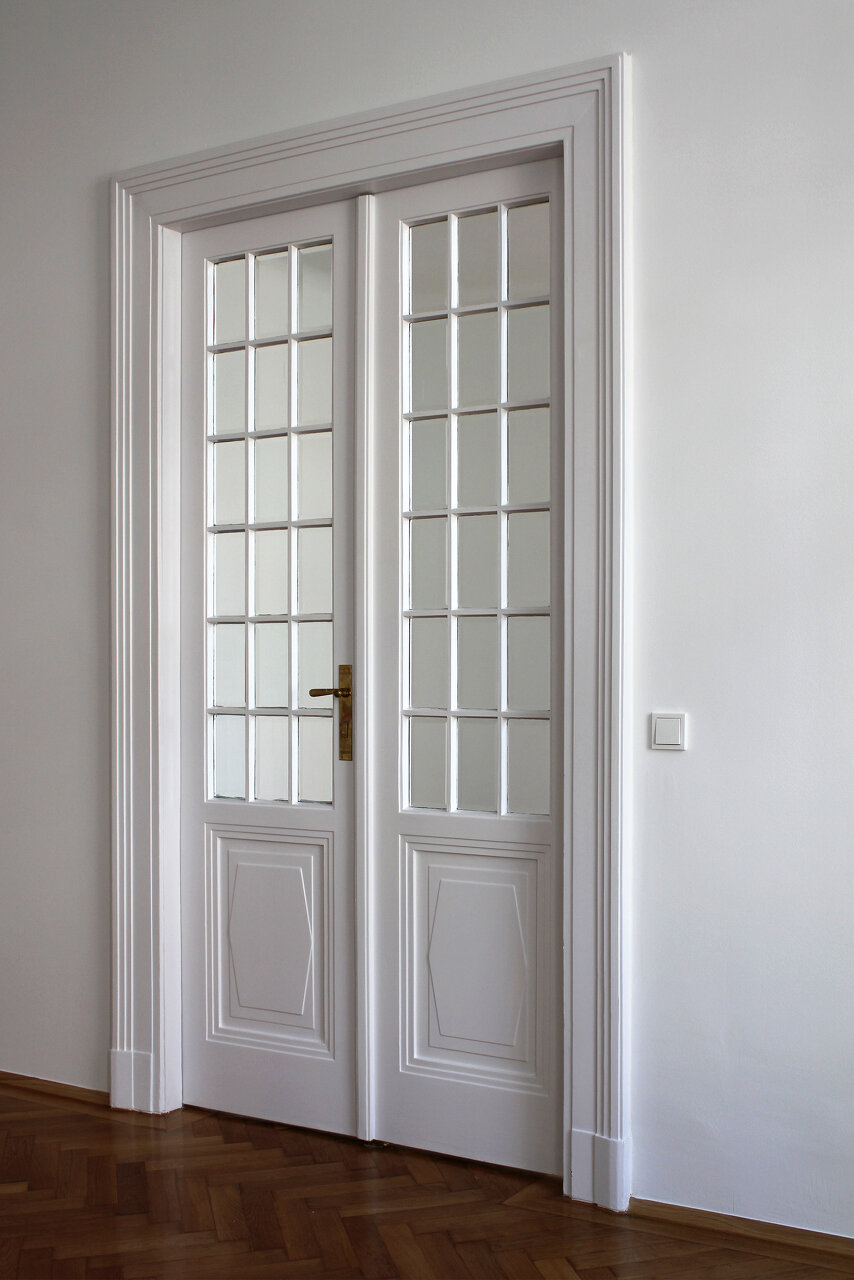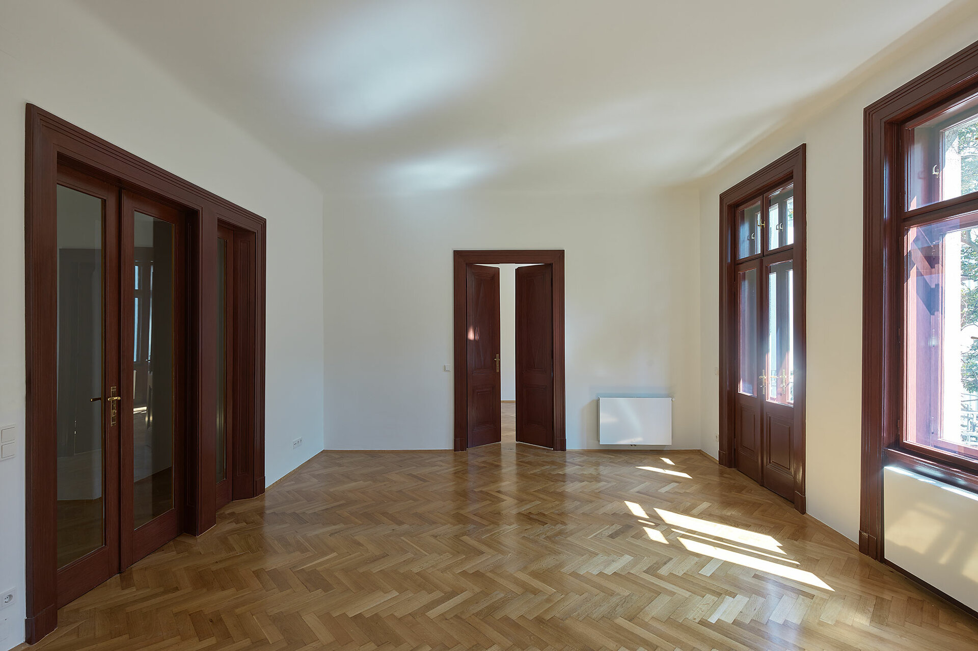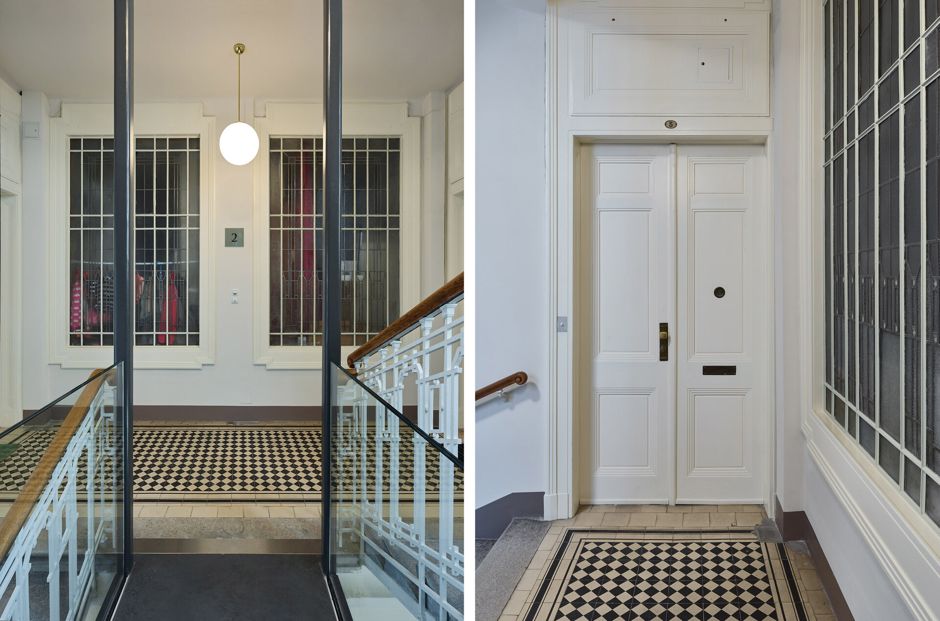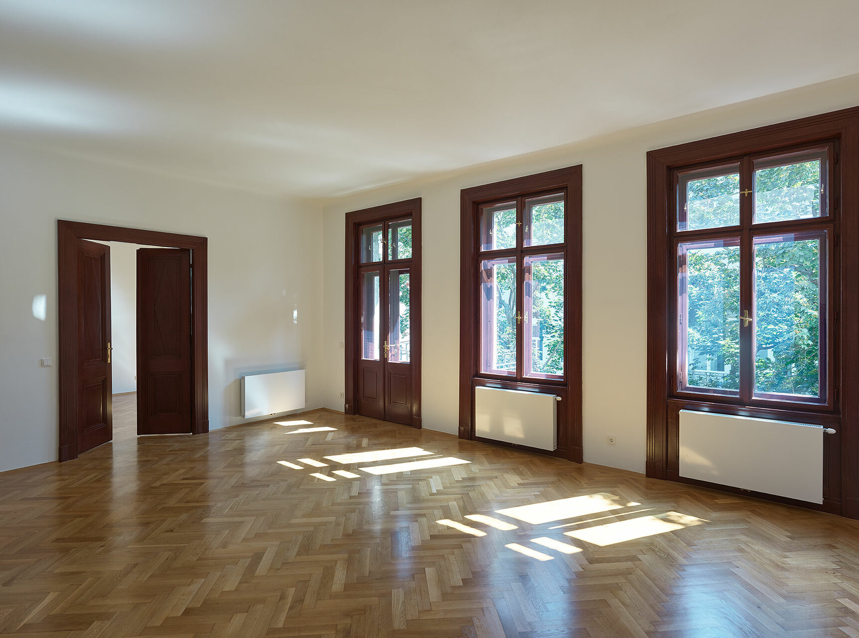 Bauaufgabe in der Porzellangasse 36 waren die Sanierung des gesamten denkmalgeschützten Hauses, das aus einem Straßen- und einem Hoftrakt besteht, der Einbau von zwei zusätzlichen Wohnungen im Dachstuhl des Hoftraktes, die Sanierung von vier Wohnungen, die von den Fliesen- und Parkettböden über die Fenster und Türen, die modernen Einbaukästen, Milchgläser in Zwischenwänden zur Optimierung der Belichtung bis hin zu Wandmalereien in der originalen Substanz erhalten waren.
