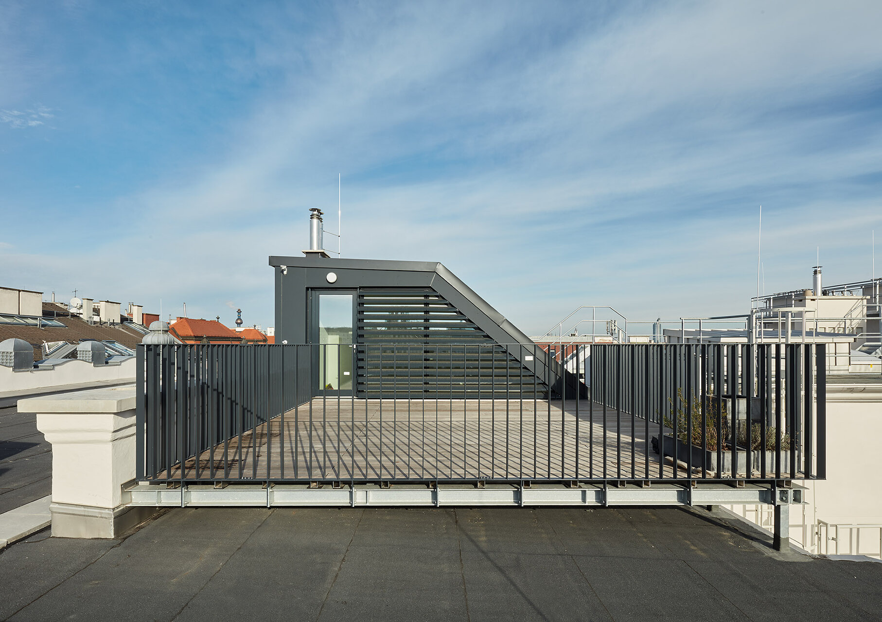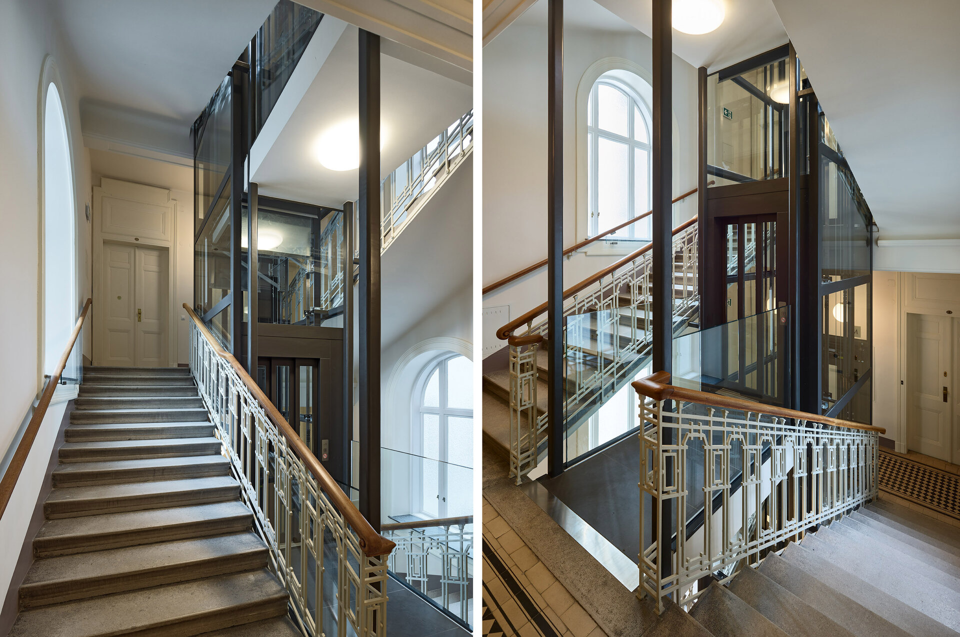 Den Aufzug und die Brückenkonstruktion im Stiegenhausbau zwischen Straßen- und Hoftrakt in der Porzellangasse 36 gestalteten P.Good Architekten als dezidiert neue Elemente. Als Stahl-Glaskonstruktion entsprechen sie der Formschönheit des historischen Baus. Gleichzeitig setzen sie sich mit ihrem dunklen Anstrich von der hellen Farbigkeit des historischen Stiegenhauses ab. Der neue Aufzug erschließt nun gleichrangig die Wohnungen der beiden halbgeschossig zueinander versetzten Trakte.