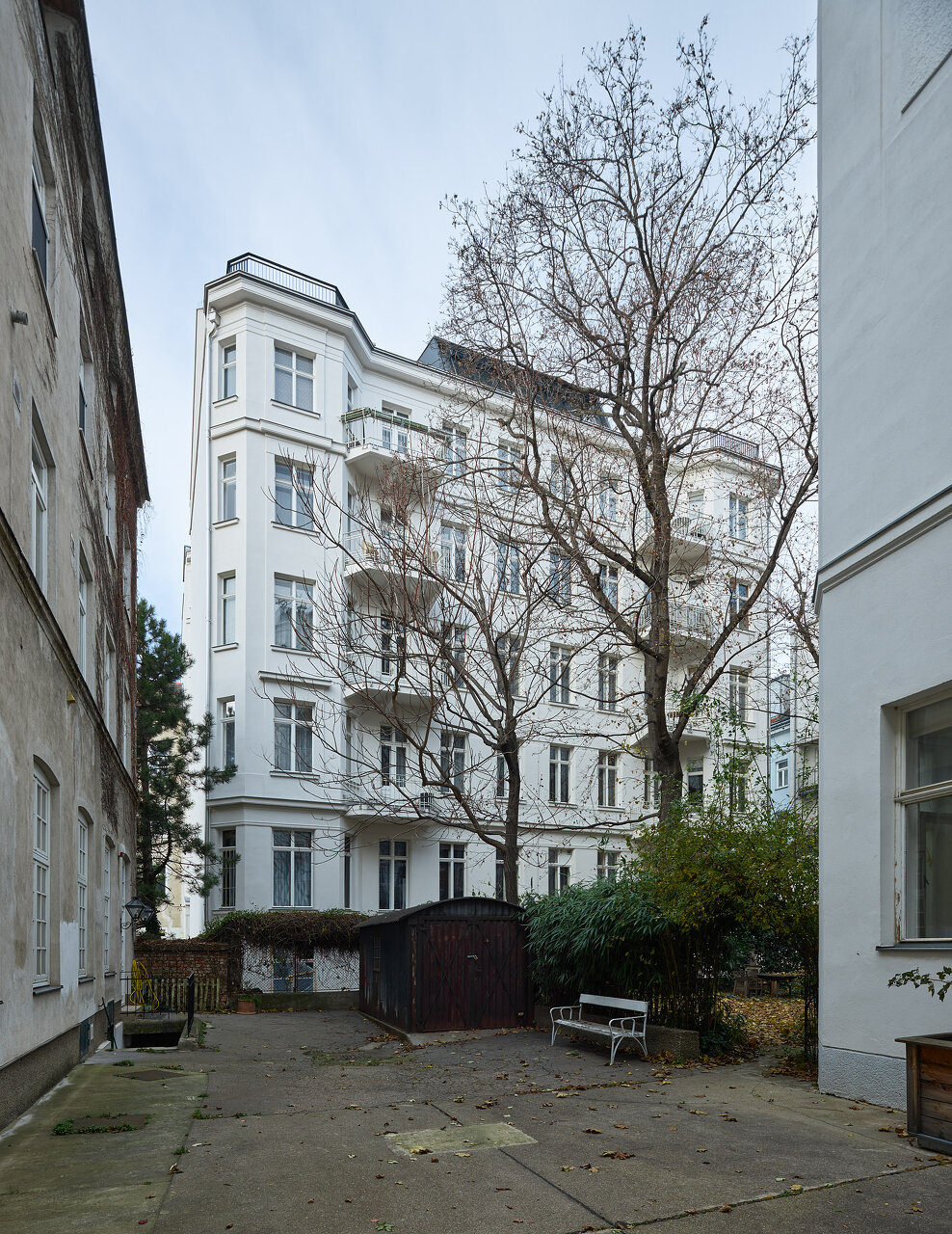 Die hofseitigen Klopfbalkone im Straßentrakt wurden im Zuge der Sanierung zu Außenwohnräumen vergrößert. Im Hoftrakt verfügte bereits 1908 jede Wohnung über einen gut zugeschnittenen Balkon zum Garten hin – was durchaus ungewöhnlich war zu jener Zeit.