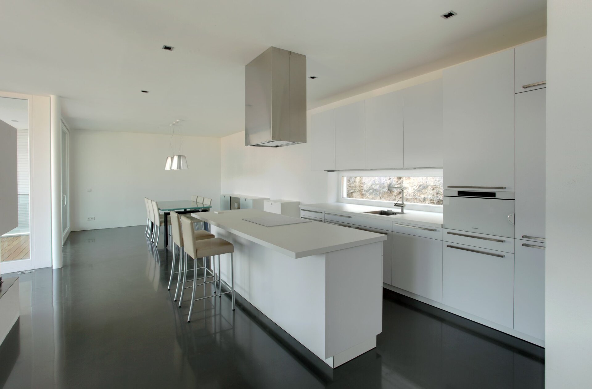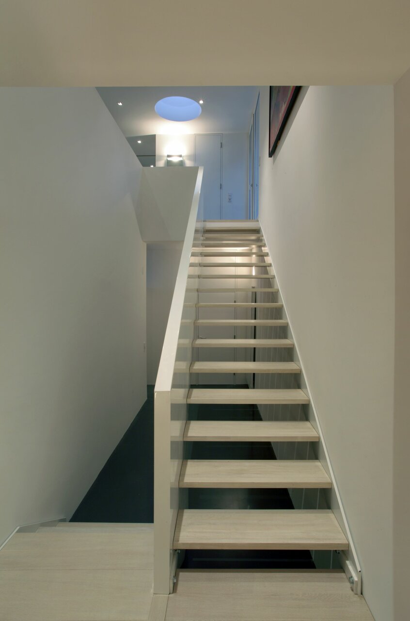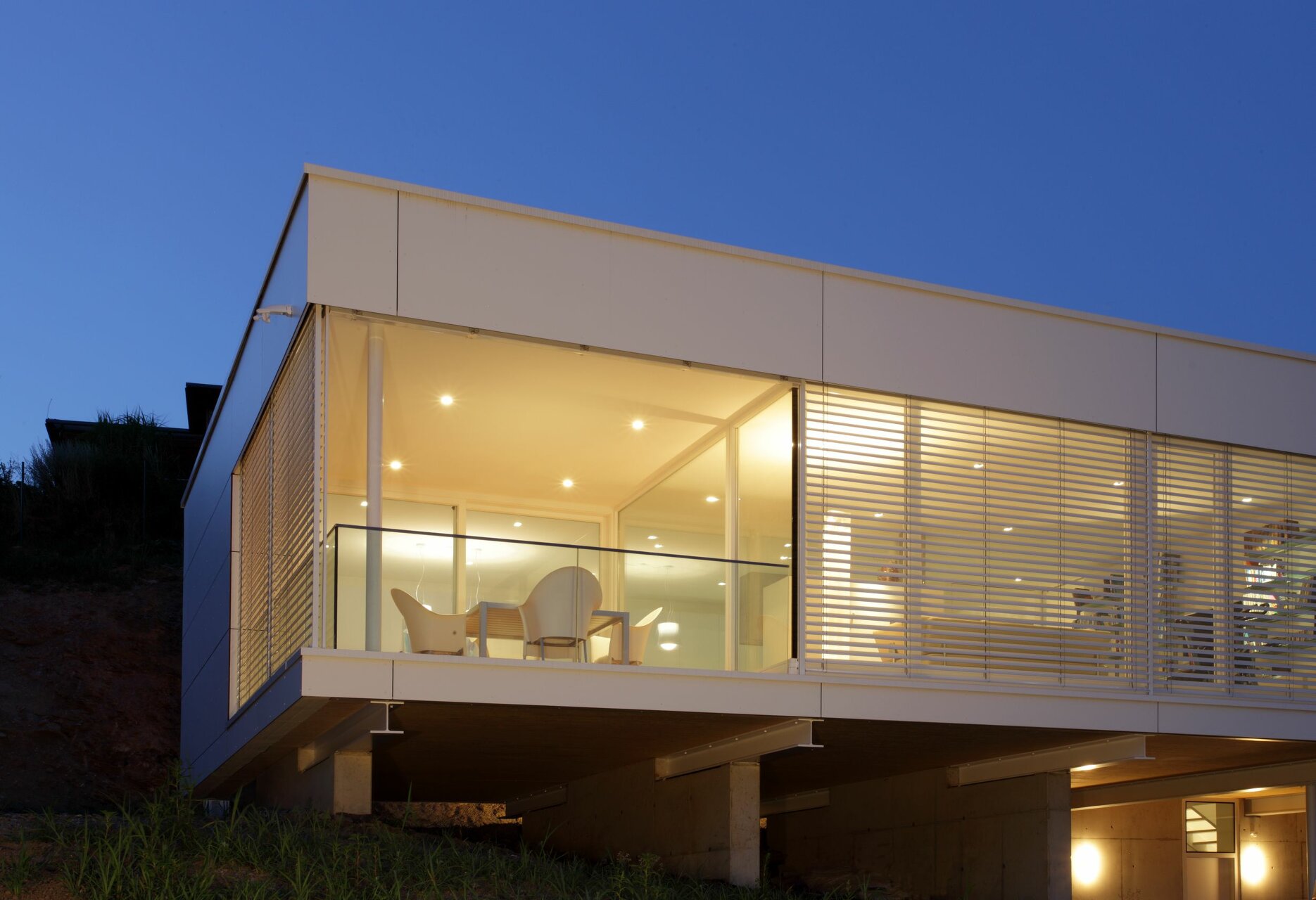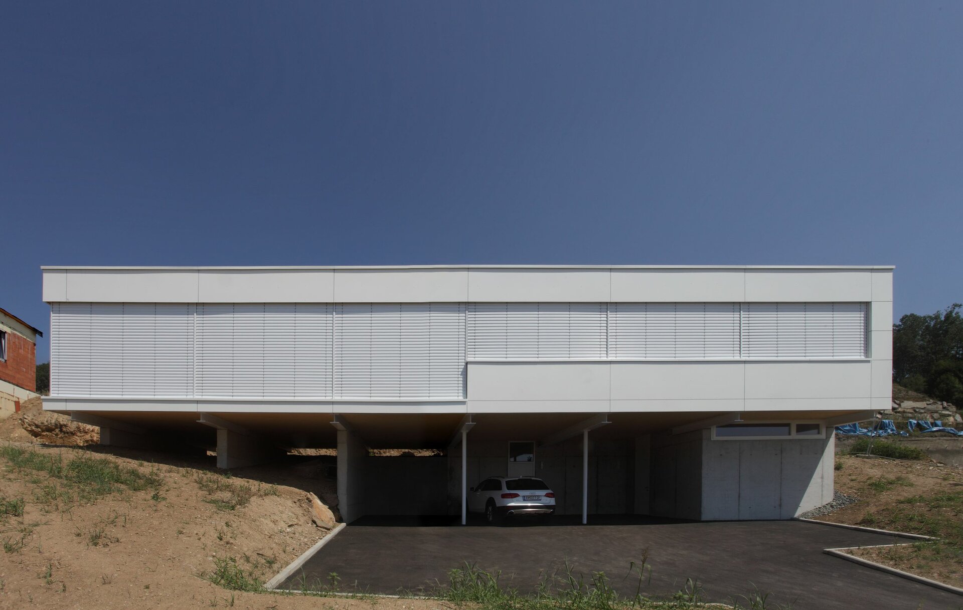 Sämtliche Wohnfunktionen befinden sich auf einer Ebene. Das durchlässige Sockelgeschoss nimmt lediglich 3 überdeckte Pkw-Stellplätze, eine Abstellbox, den Technikbereich und das vertikale Erschließungselement auf.