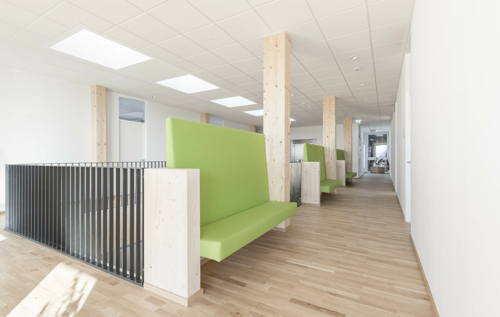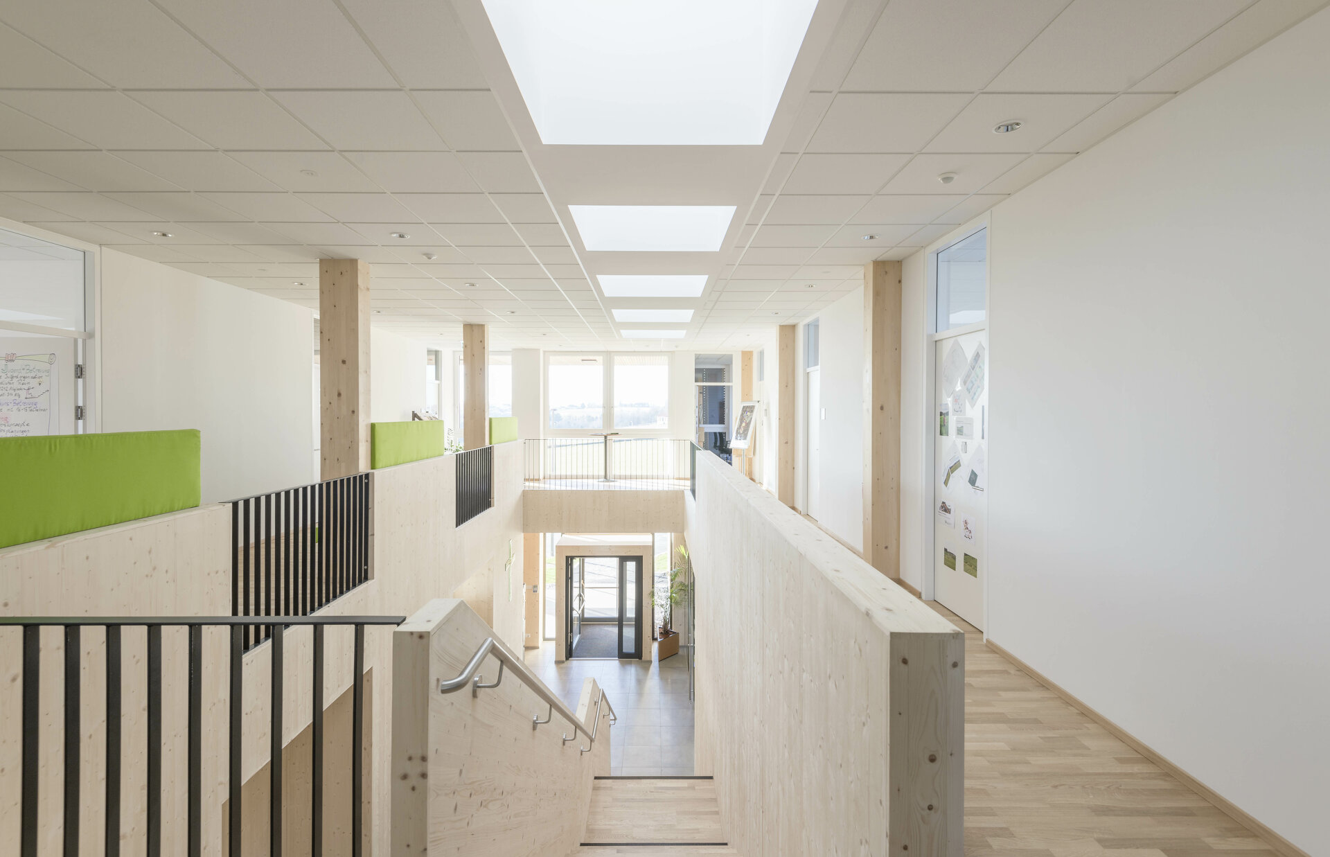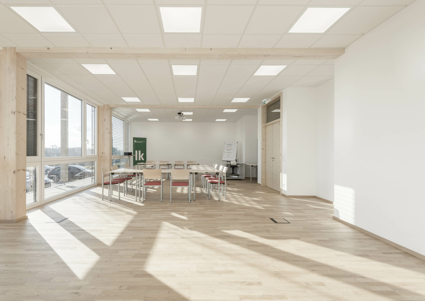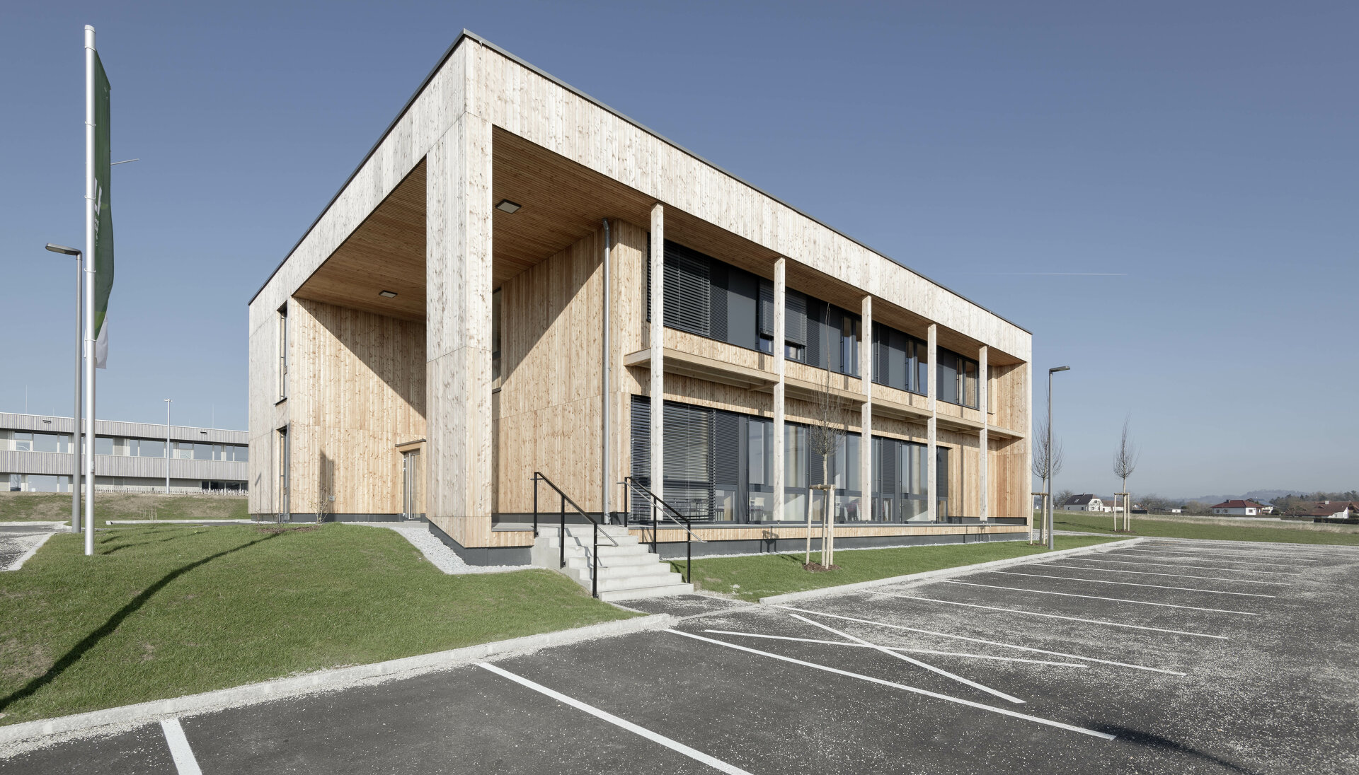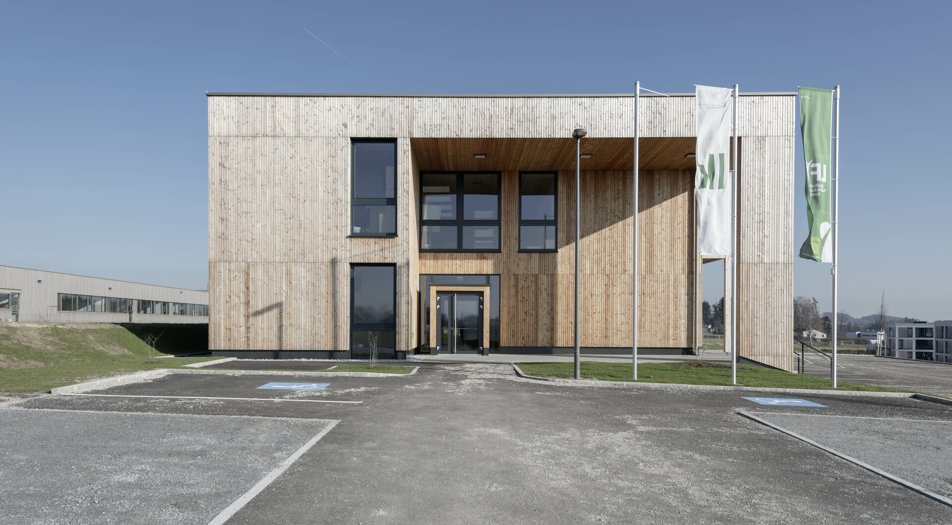 Das Gebäude ist als Holzriegelbau auf Stahlbetonplatte konzipiert und nach strengem Raster aufgebaut. Die natürlich gebeizte Holzverkleidung außen und Holzsichtflächen im Innenbereich machen den Holzbau als solchen erlebbar. Großzügige Fensterflächen sorgen nicht nur für Aussicht und Belichtung, sie sichern dem energieeffizienten Gebäude auch die nötigen solaren Einträge. Konstruktiven Schutz gegen die Südsonne bietet im Obergeschoß der Dachvorsprung über den Büros, im Erdgeschoß erfüllt der Wartungsgang diese Funktion. (Text: Architekten, bearbeitet)