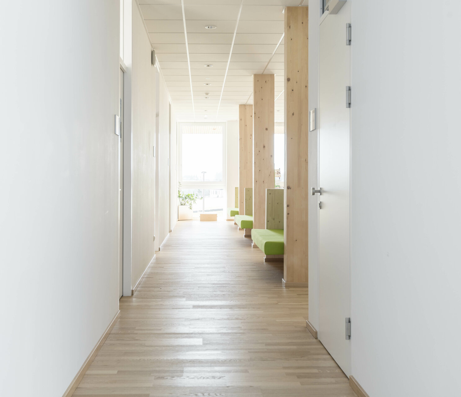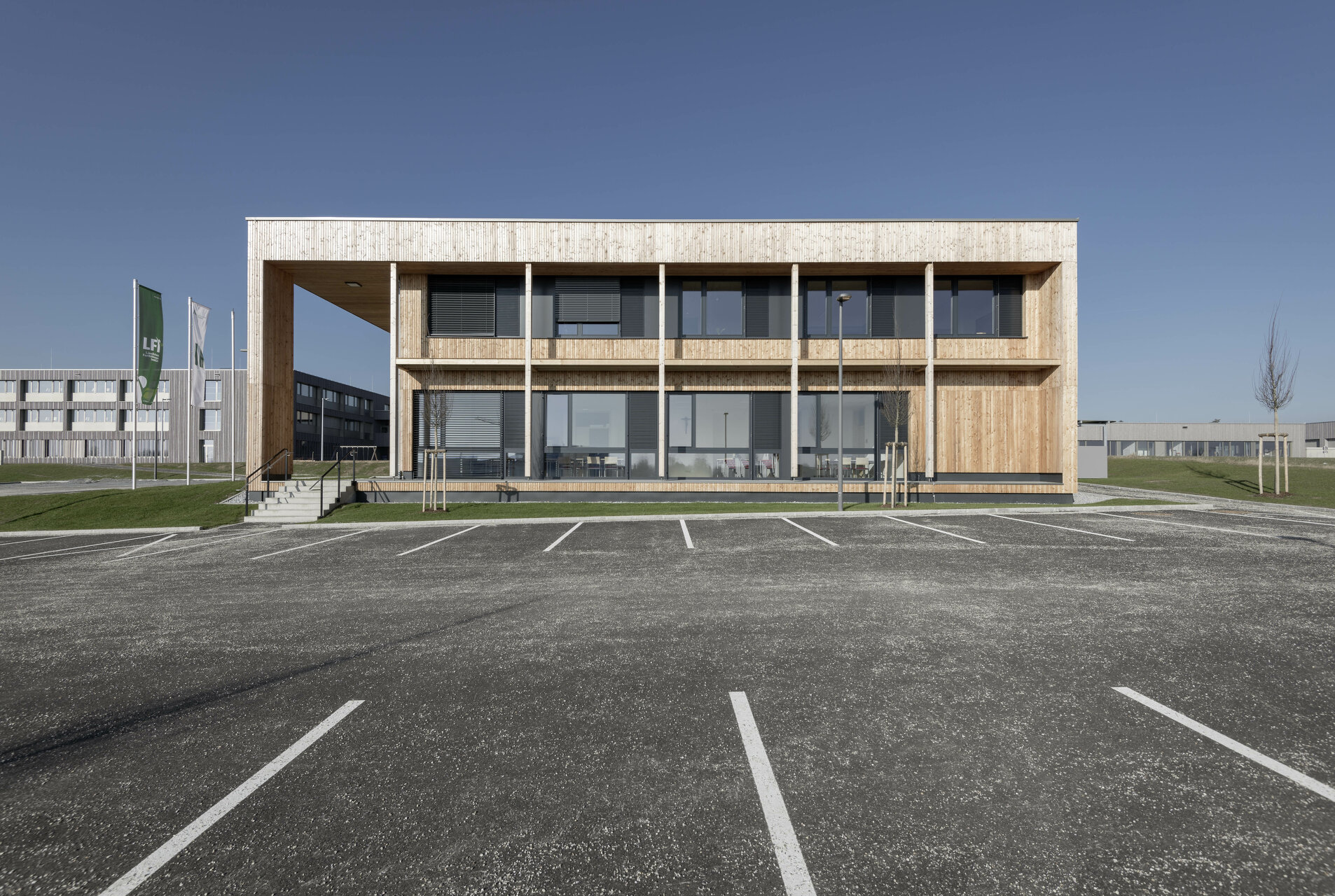 Über den westseitigen Haupteingang wird das zweigeschoßige Atriumfoyer der Landwirtschaftskammer erschlossen. Oberlichter versorgen diesen zentralen Raum mit Tageslicht. Zum Empfang der Kundinnen und Kunden wurde das Sekretariat unmittelbar neben dem Haupteingang positioniert. Gemeinsam mit den Leitungsbüros bildet es den erdgeschoßigen Verwaltungstrakt des Gebäudes, der bei Veranstaltungen vom Foyer abgetrennt werden kann. Der Seminarraum lässt sich mit den beiden Besprechungsräumen zu einem großen Veranstaltungsbereich zusammenfassen. Durch die großzügigen Öffnungen zum überdeckten Vorbereich und zur Terrasse entsteht eine multifunktionale Erdgeschoßzone.