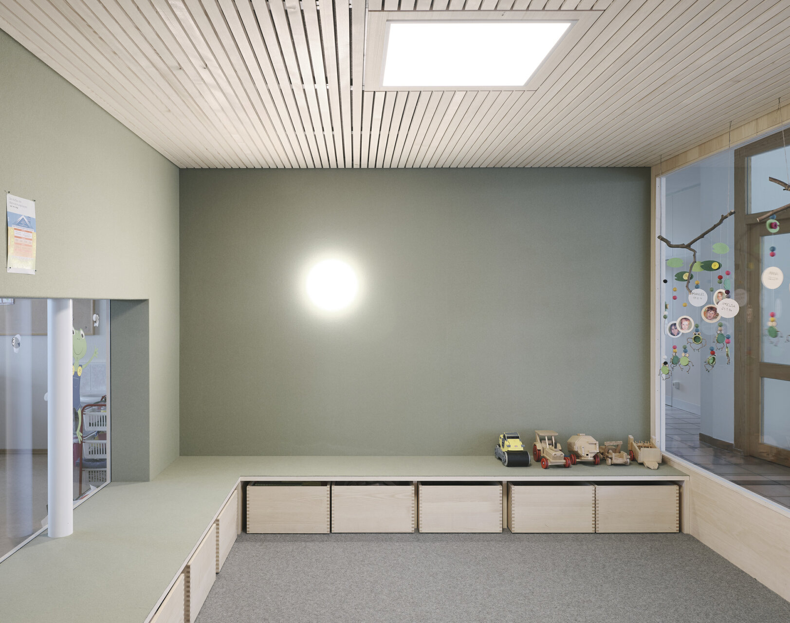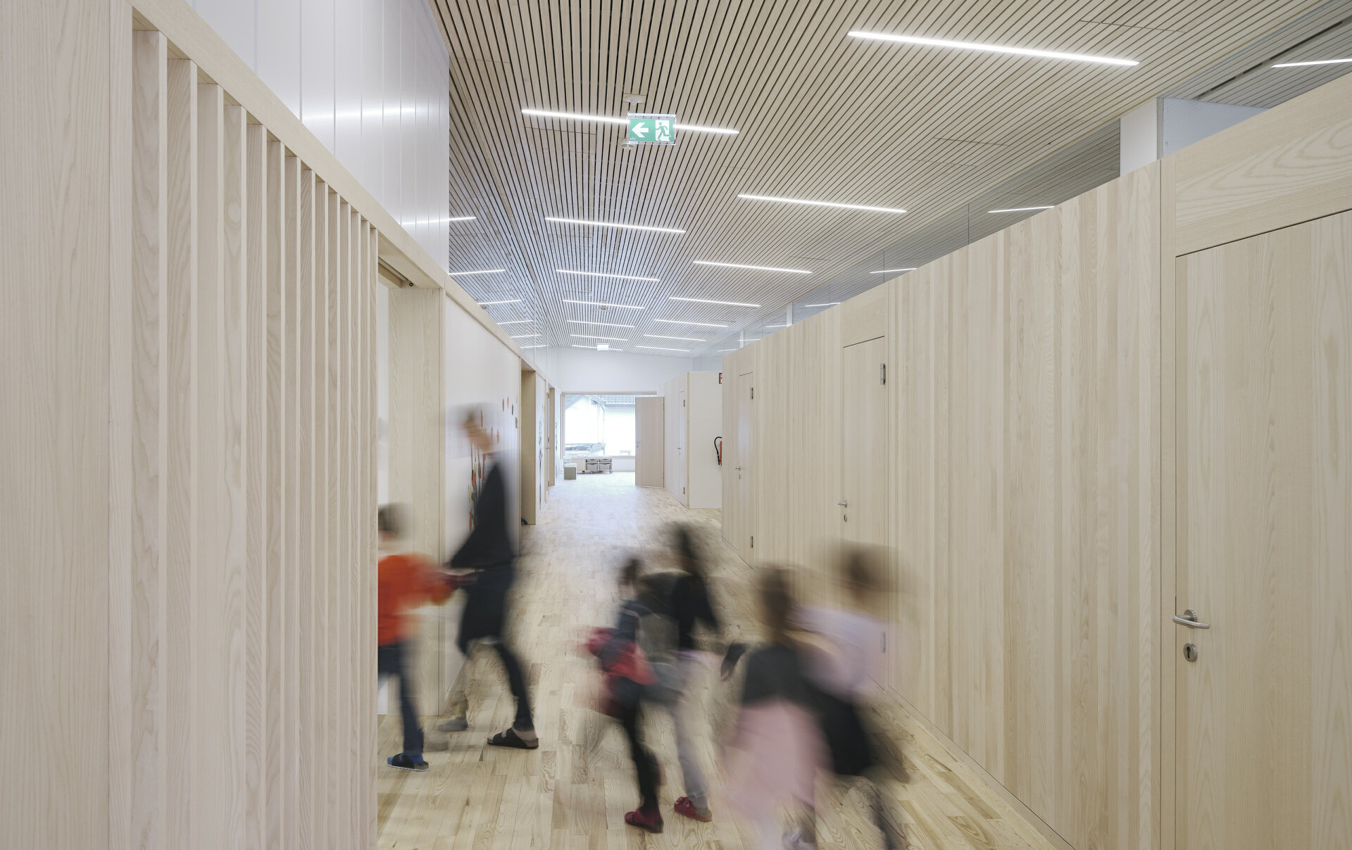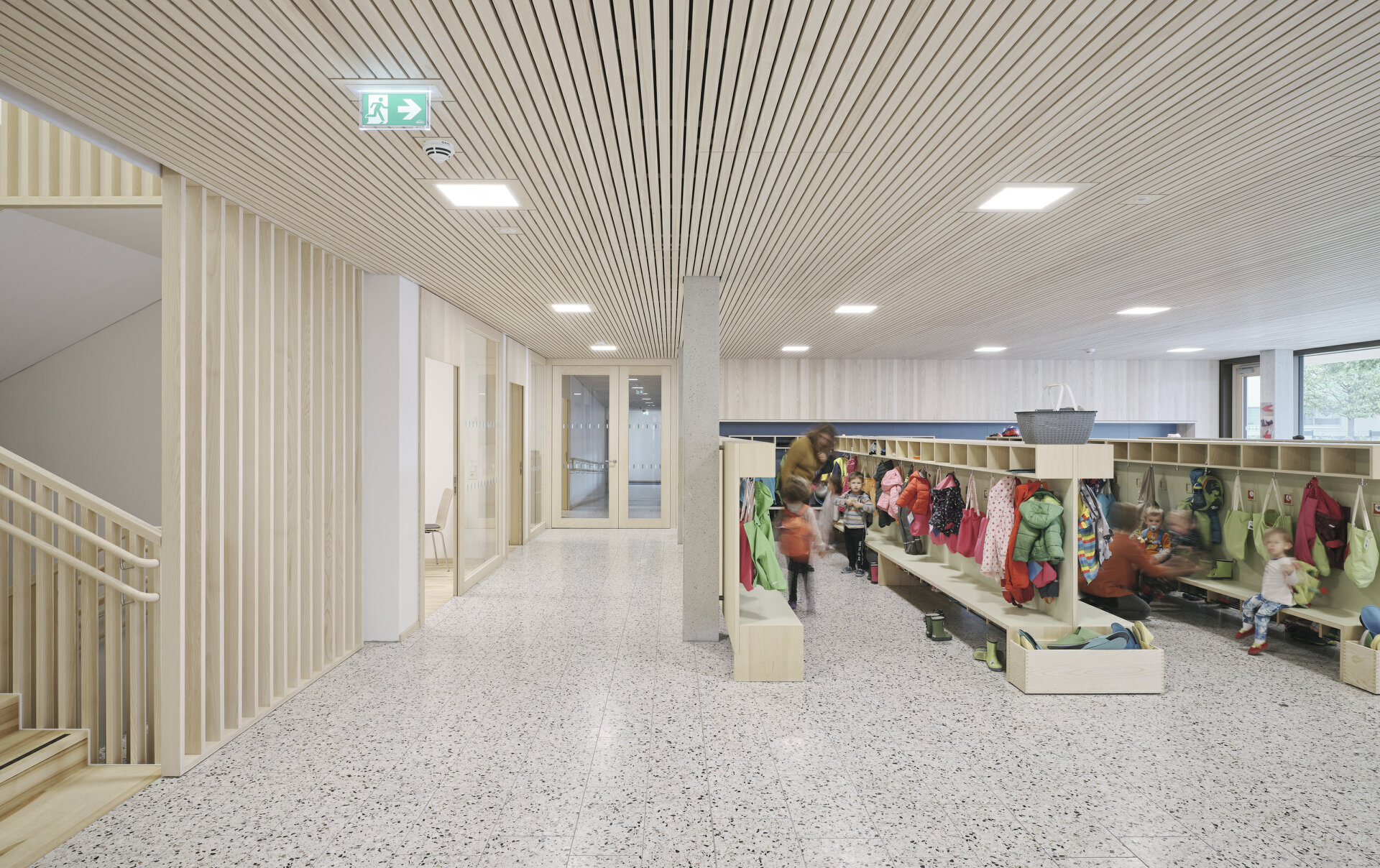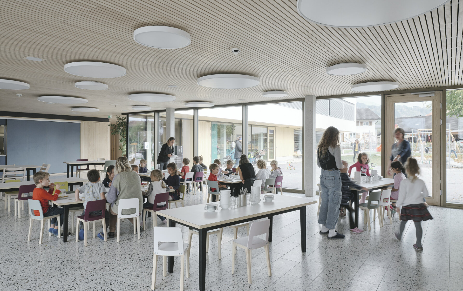 Die Kleinkindbetreuung ist auf rund 45 Kinder ausgelegt, befindet sich im ersten Obergeschoß des neuen Gebäudeteils, aufgeteilt in mehrere Gruppen. Im Erdgeschoß sind ein Bewegungsraum, Kreativraum sowie Räumlichkeiten für Verwaltung und Personal untergebracht, die von Kindergarten und Kinderbetreuung gemeinsam genutzt werden. Der Klassentrakt des Volksschulgebäudes aus den 1960er Jahren, das bereits vor einigen Jahren energietechnisch saniert wurde, konnte weitgehend belassen werden. Der Verwaltungstrakt mit Lehrer:innenzimmer, Direktion und Besprechungszimmer wurde neu errichtet. Der technische Werkraum wanderte vom Untergeschoß in den neuen Verbindungstrakt, und das gesamte Gebäude wurde barrierefrei adaptiert. (Text: Tobias Hagleitner)