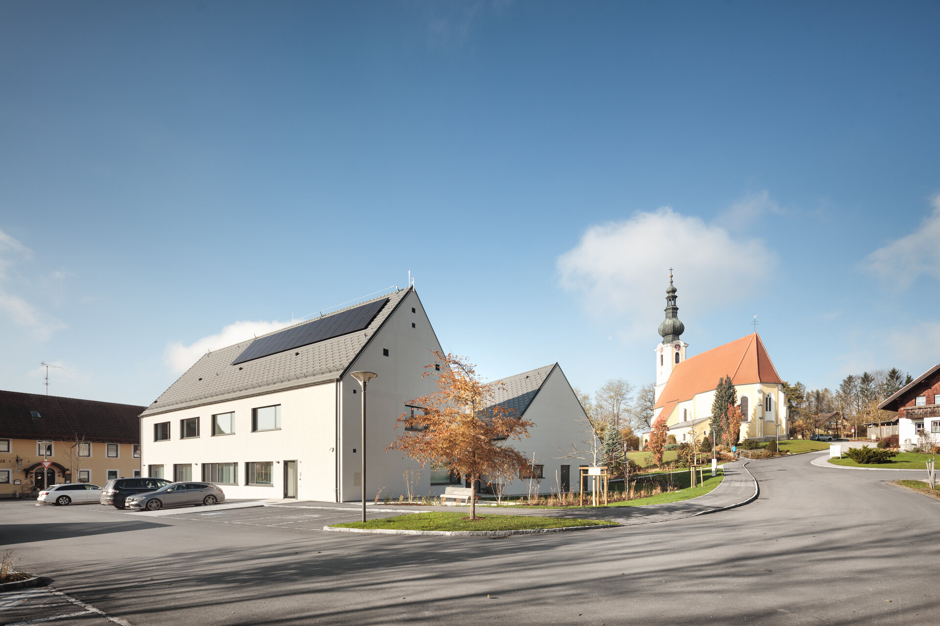 Der etwa 1.400 m² große Platz mit Kopfsteinpflasterung ist als multifunktionaler „shared space“ für Märkte, Festakte, Feierlichkeiten u. ä. konzipiert. Im Alltag ist er als Parkplatz für zumindest 16 Fahrzeuge verwendbar. Die Straße wurde geringfügig versetzt und in das Fünfeck des Platzes eingebunden, wobei der Materialwechsel eine gestalterische Zäsur setzt – Bäume, Info-Point und Sitzbänke bestimmen diese Zone, die auch Wartebereich für den Bus ist. Eine Sitzstufe im Hang zur Kirche bildet den Platzabschluss im Norden. Vor dem Amtsgebäude wurde ein Natursteinbrunnen mit Wasserspiel realisiert.