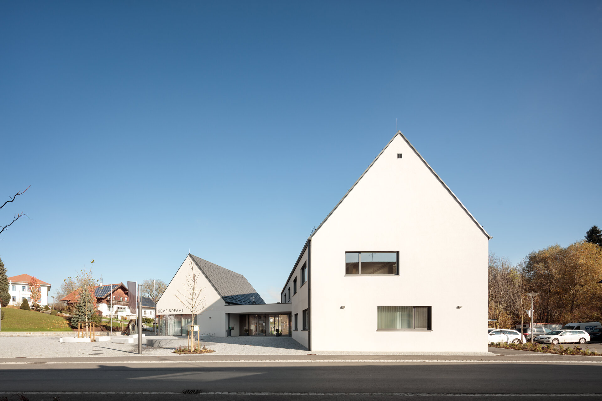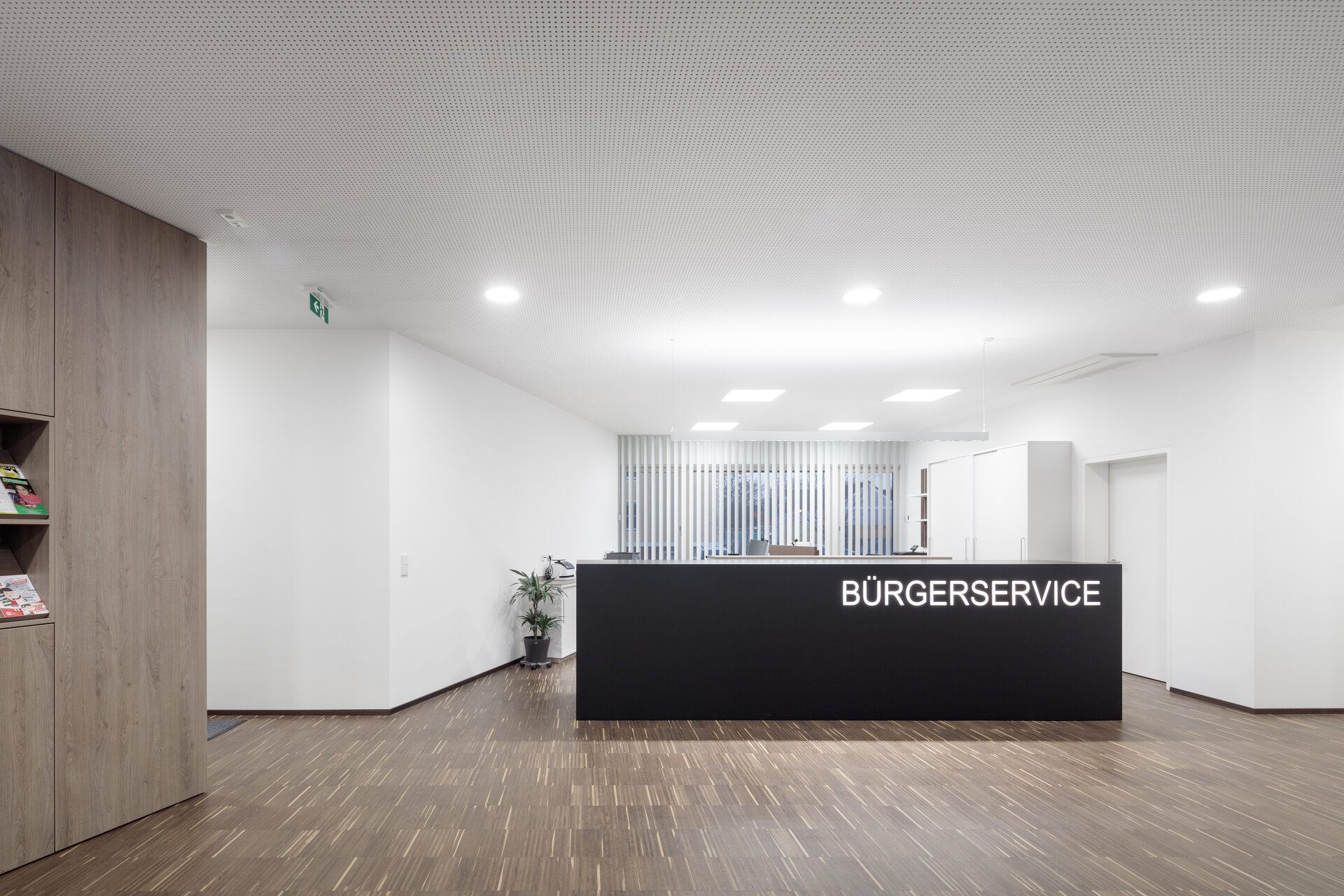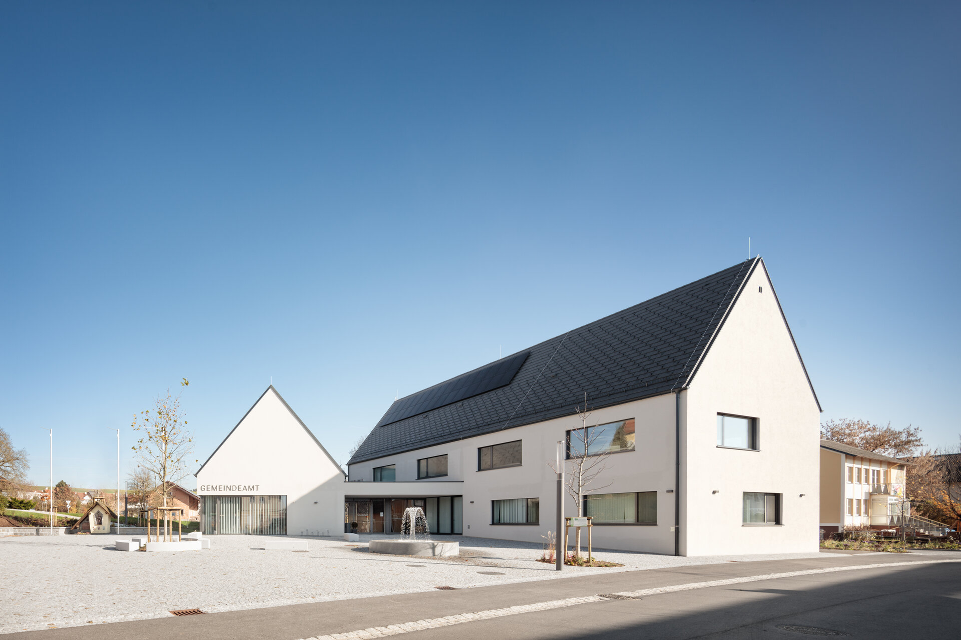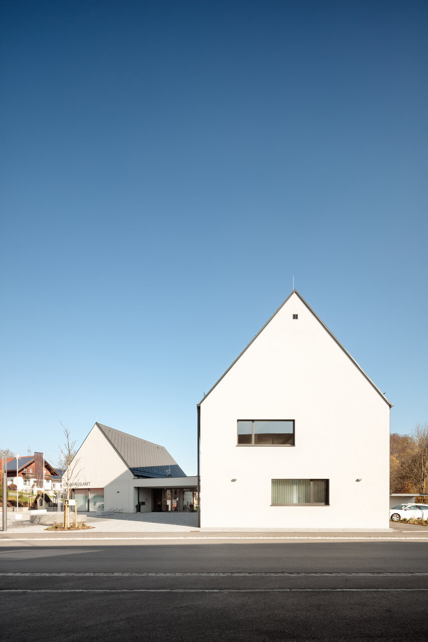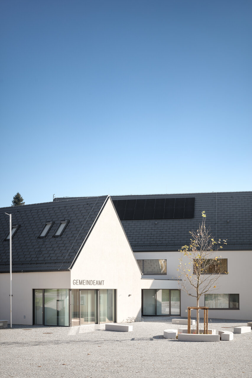 Der überdachte Vorbereich führt ins Foyer. Von hier sind der Sitzungssaal im westlichen Bauteil und östlich das Bürgerservice mit den angeschlossenen Büroräumlichkeiten erschlossen. Vom Parkplatz im Osten gelangt man in den Eingangsbereich für die Gewerbeflächen im Obergeschoß. Durch die räumliche Verbindung zum Bürgerservice kann das Obergeschoß auch als Erweiterung des Amtsgebäudes dienen. Der Bereich mit Sitzungssaal und Fraktionsraum inklusive Nebenräume kann abgetrennt werden und funktioniert so auch als Veranstaltungszentrum außerhalb der Amtszeiten. (Text: Architekten, bearbeitet)