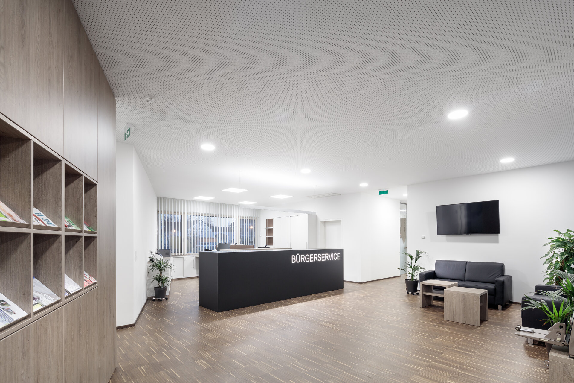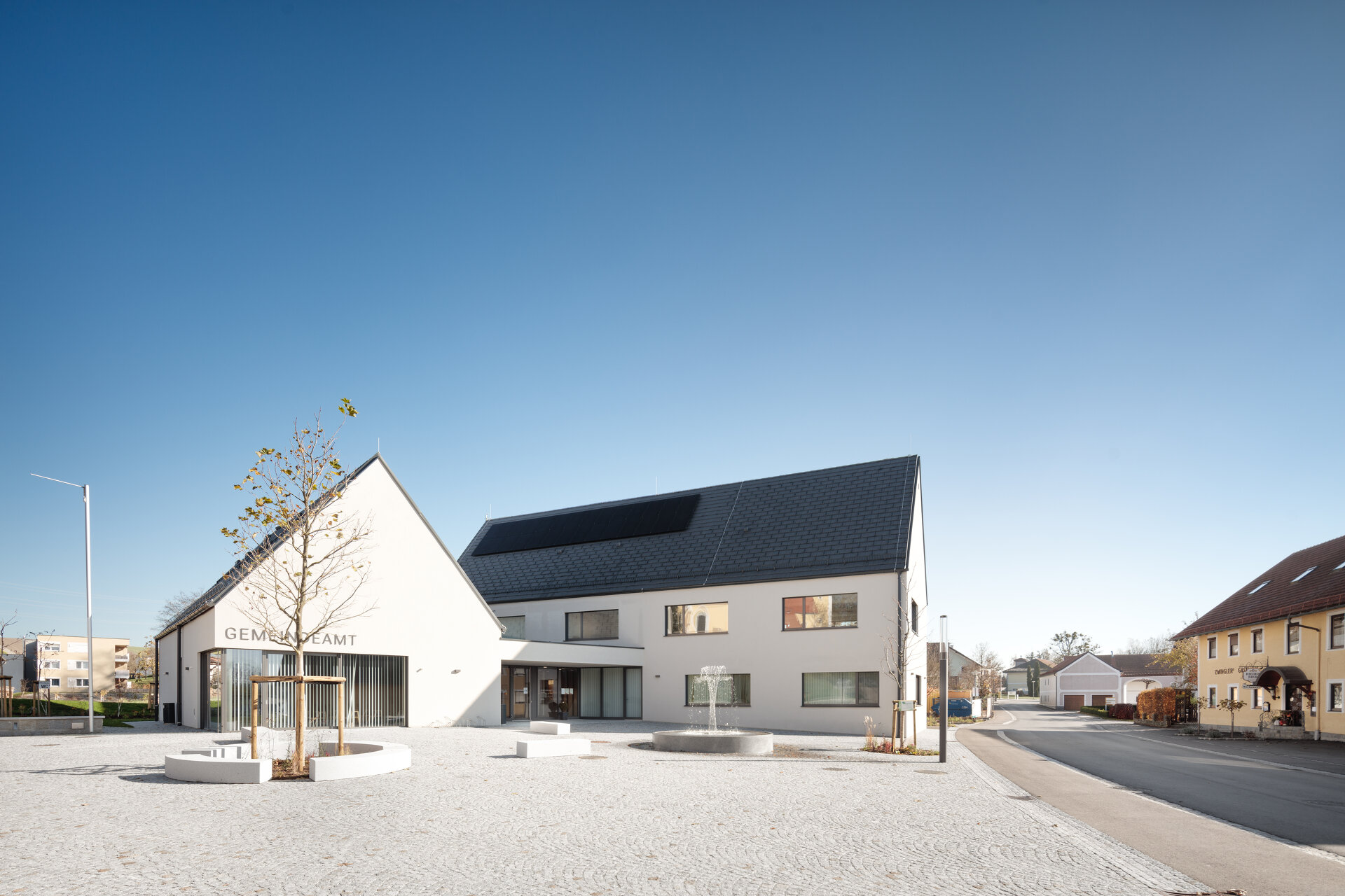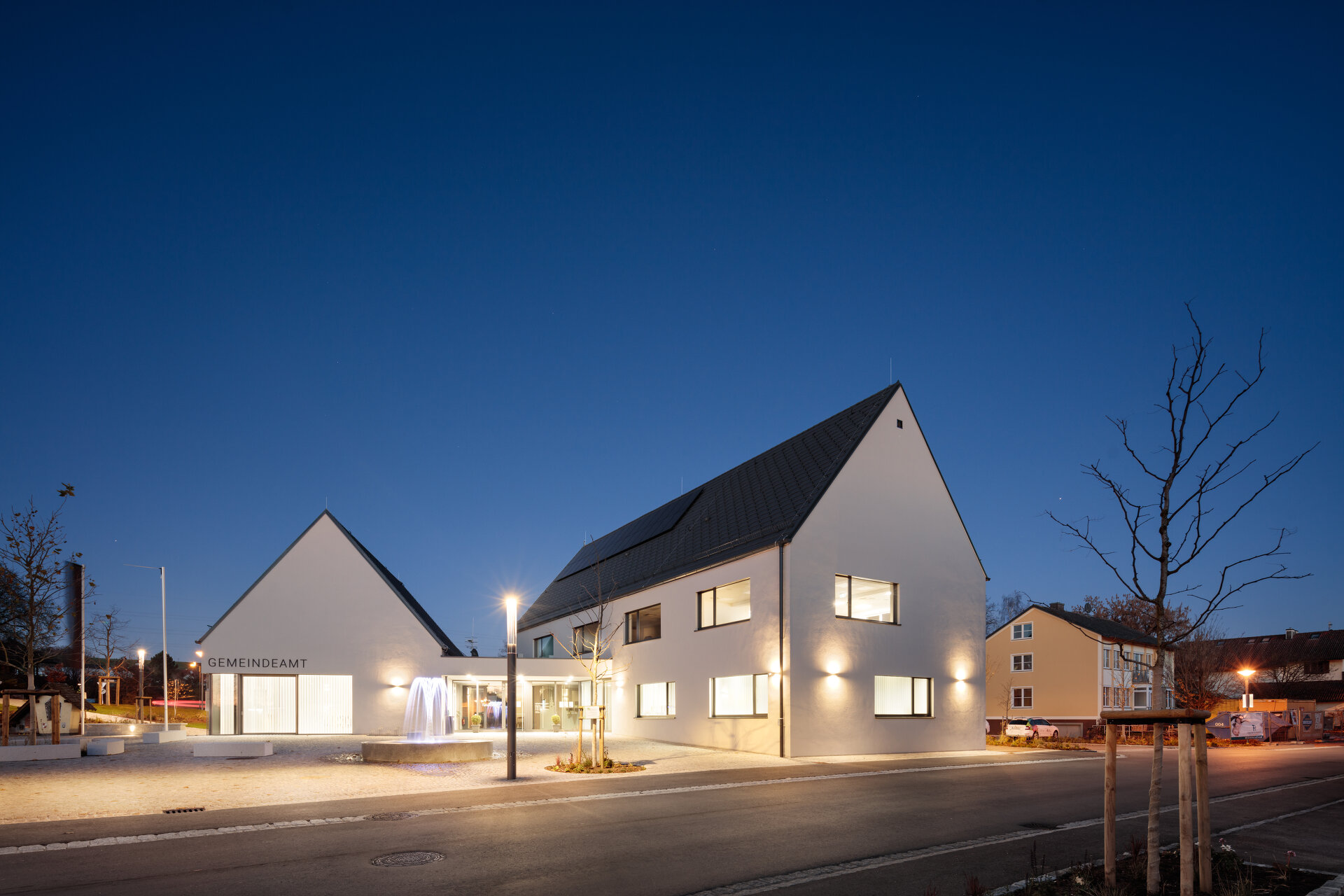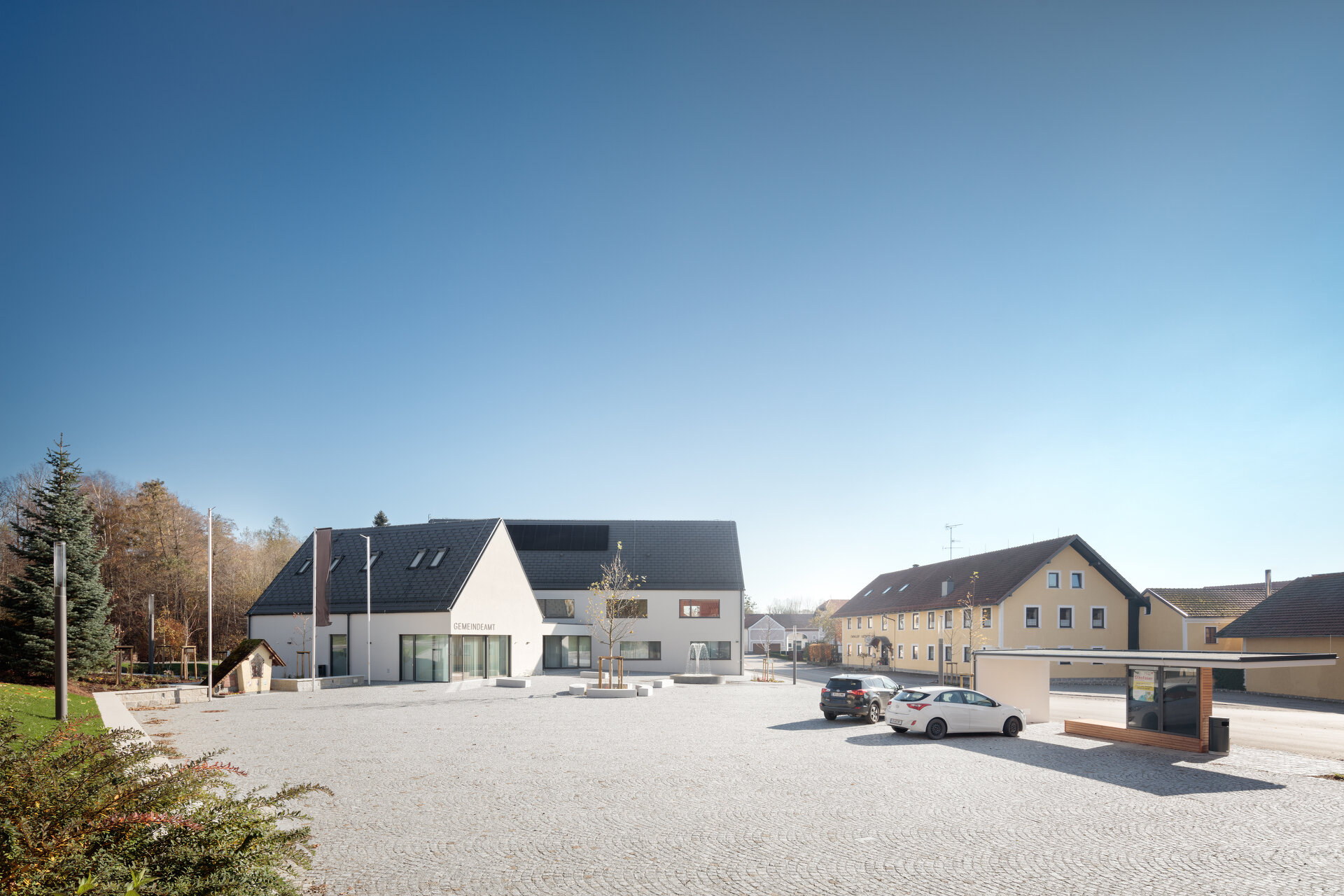 Der überdachte Vorbereich führt ins Foyer. Von hier sind der Sitzungssaal im westlichen Bauteil und östlich das Bürgerservice mit den angeschlossenen Büroräumlichkeiten erschlossen. Vom Parkplatz im Osten gelangt man in den Eingangsbereich für die Gewerbeflächen im Obergeschoß. Durch die räumliche Verbindung zum Bürgerservice kann das Obergeschoß auch als Erweiterung des Amtsgebäudes dienen. Der Bereich mit Sitzungssaal und Fraktionsraum inklusive Nebenräume kann abgetrennt werden und funktioniert so auch als Veranstaltungszentrum außerhalb der Amtszeiten. (Text: Architekten, bearbeitet)