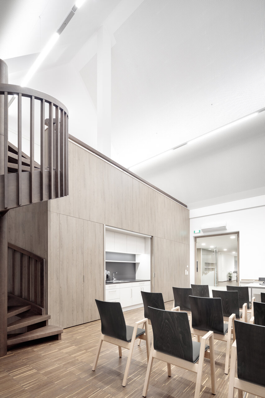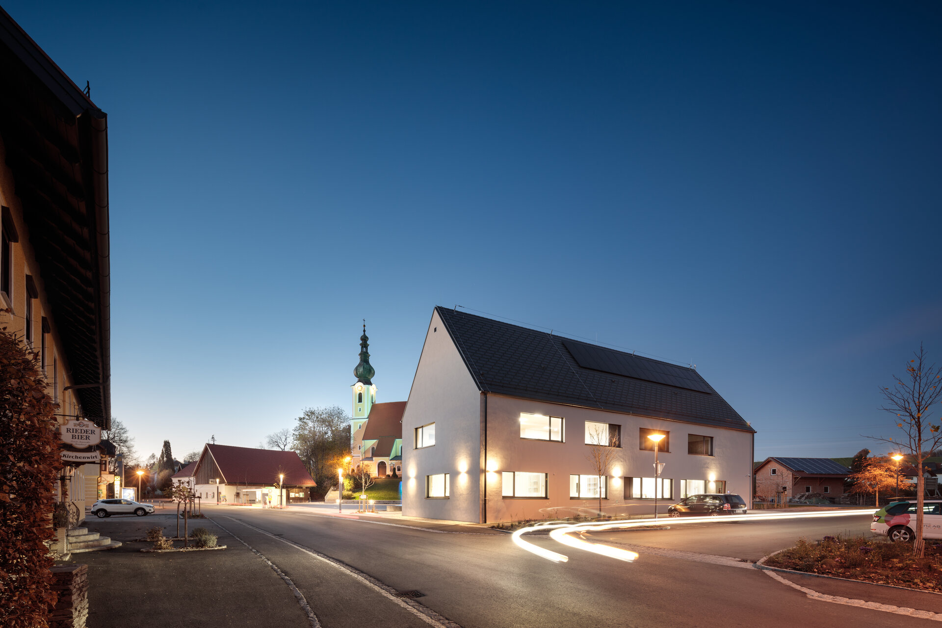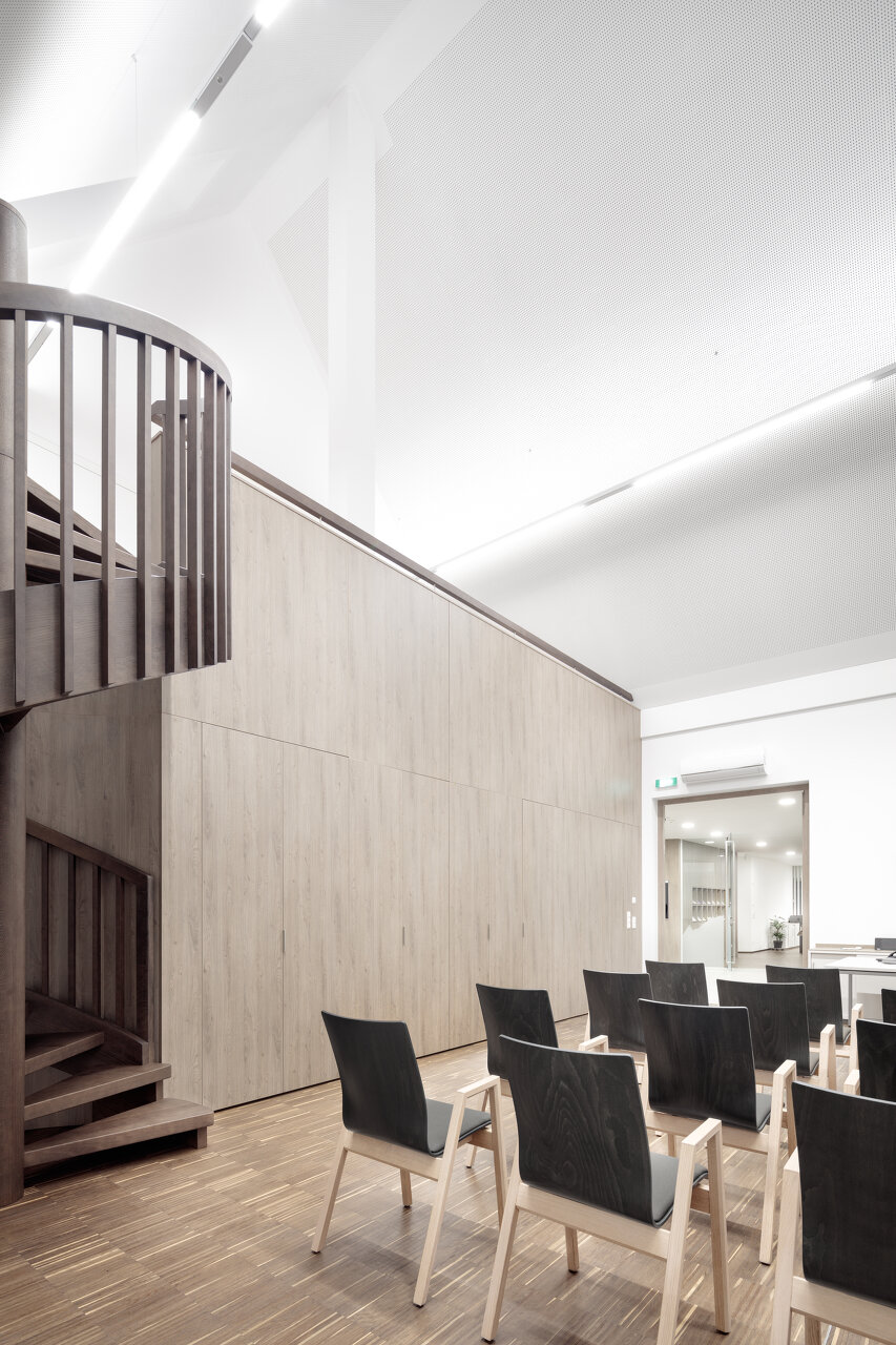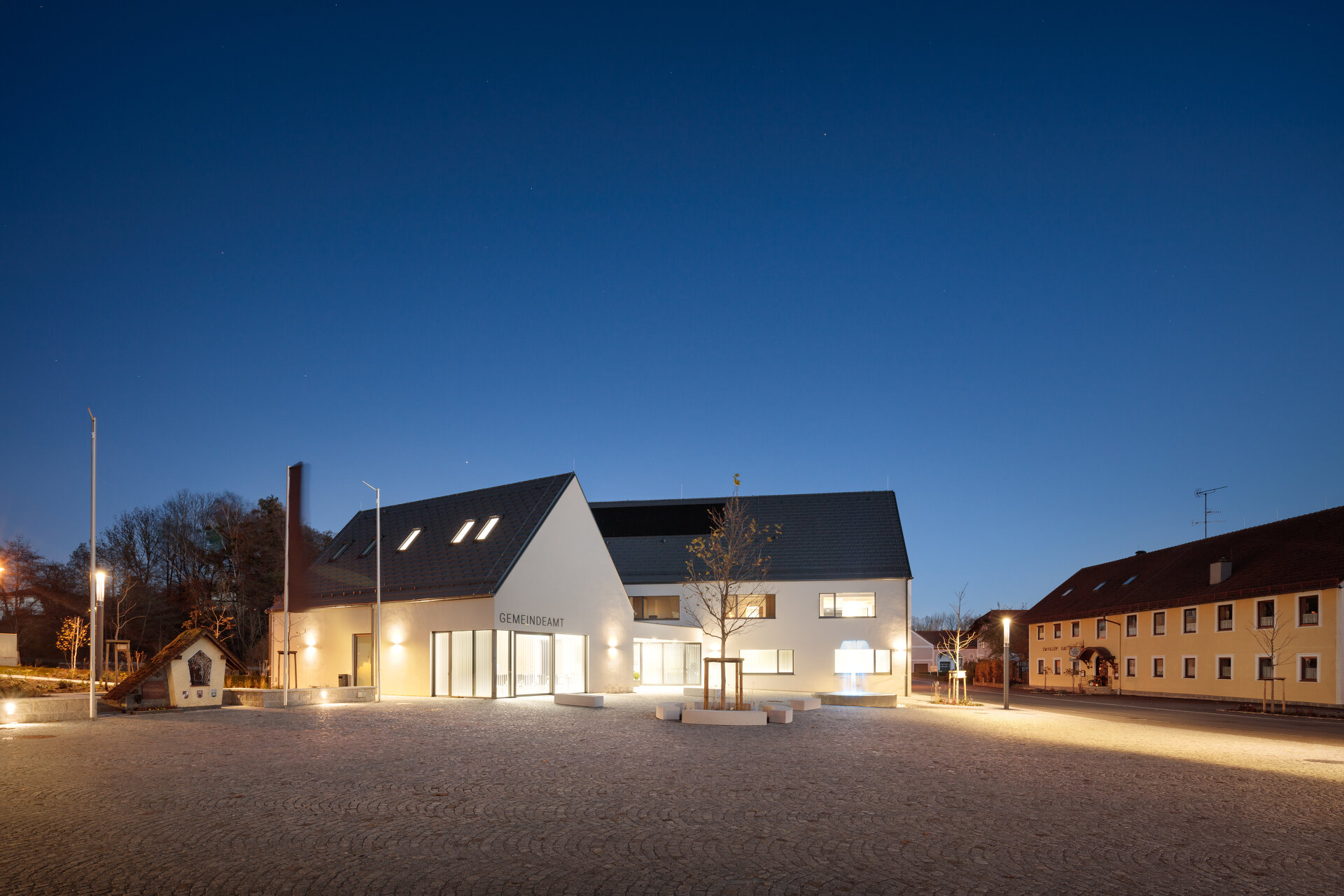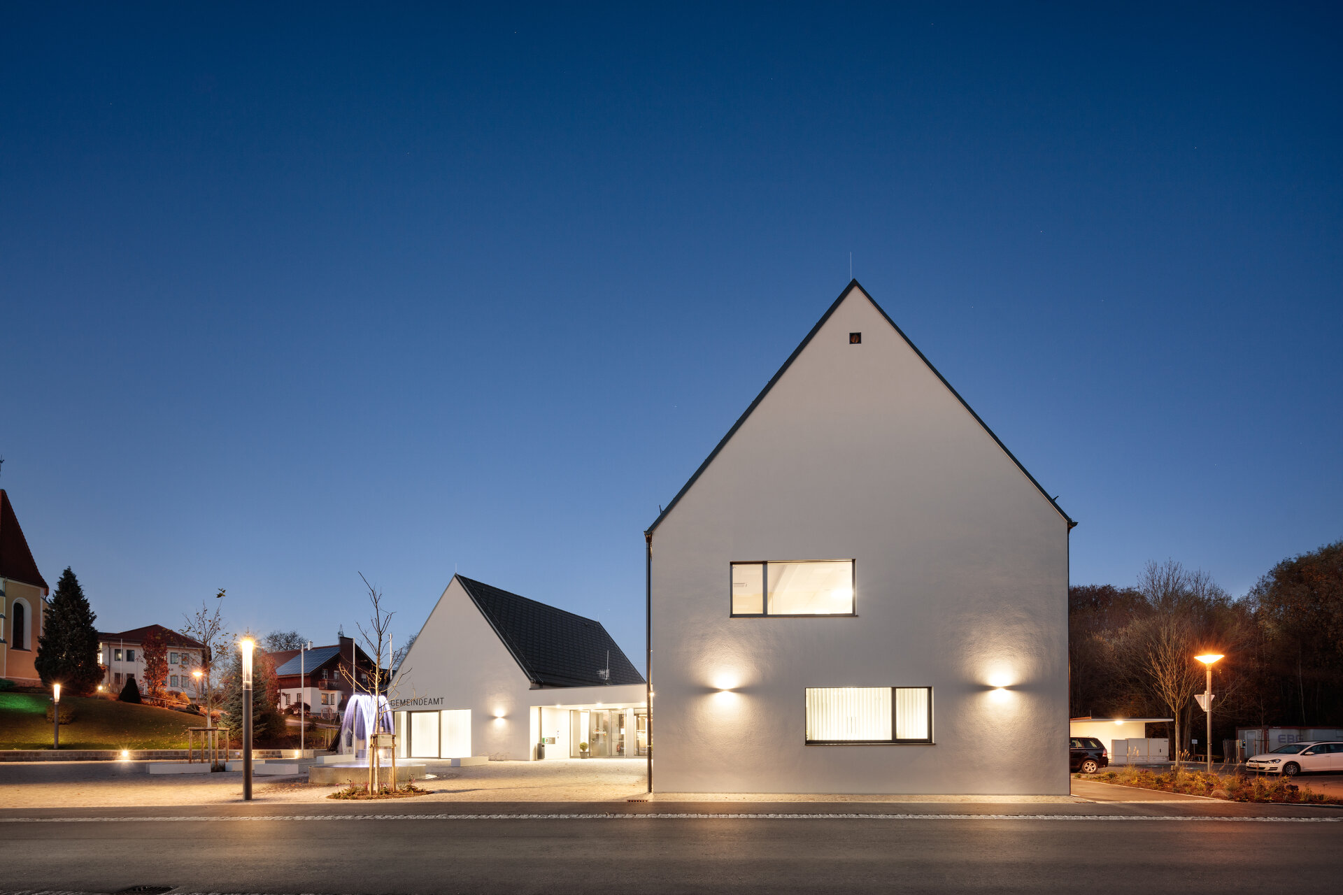 Der überdachte Vorbereich führt ins Foyer. Von hier sind der Sitzungssaal im westlichen Bauteil und östlich das Bürgerservice mit den angeschlossenen Büroräumlichkeiten erschlossen. Vom Parkplatz im Osten gelangt man in den Eingangsbereich für die Gewerbeflächen im Obergeschoß. Durch die räumliche Verbindung zum Bürgerservice kann das Obergeschoß auch als Erweiterung des Amtsgebäudes dienen. Der Bereich mit Sitzungssaal und Fraktionsraum inklusive Nebenräume kann abgetrennt werden und funktioniert so auch als Veranstaltungszentrum außerhalb der Amtszeiten. (Text: Architekten, bearbeitet)