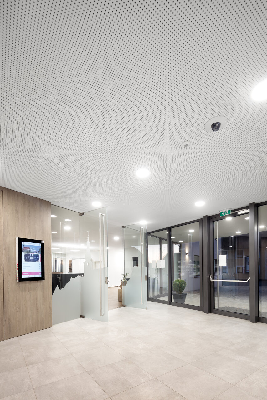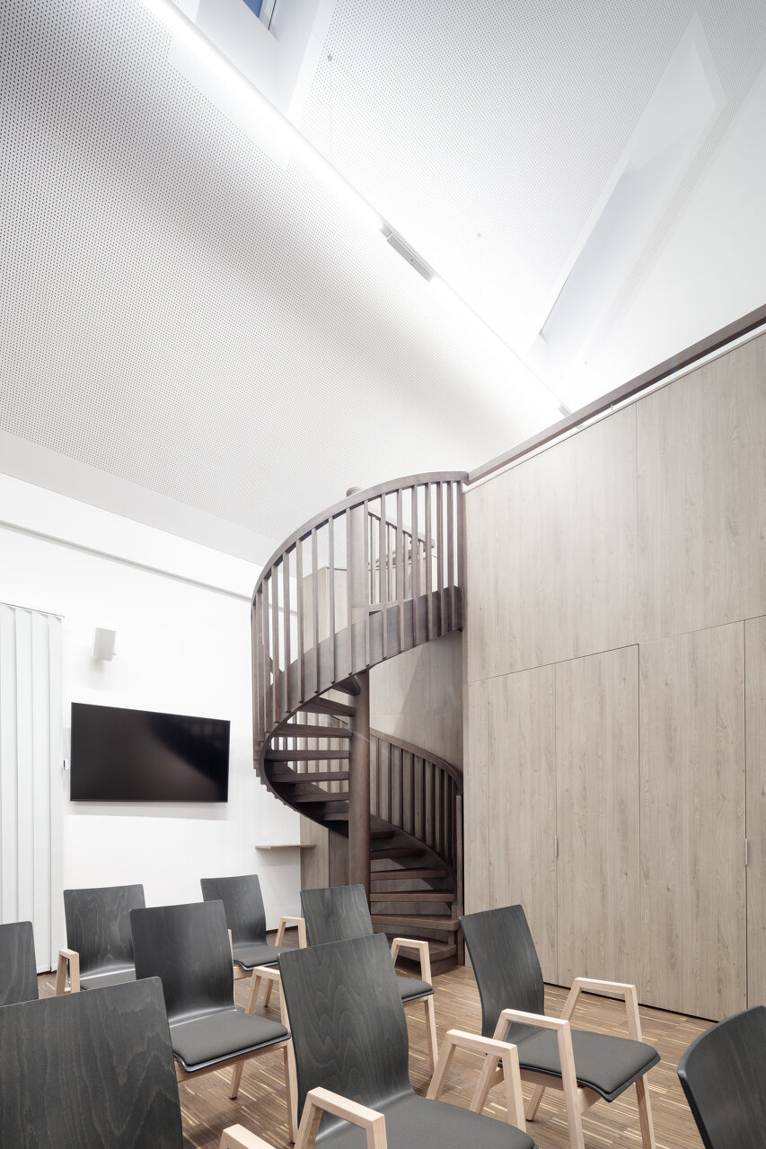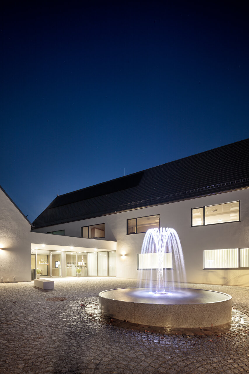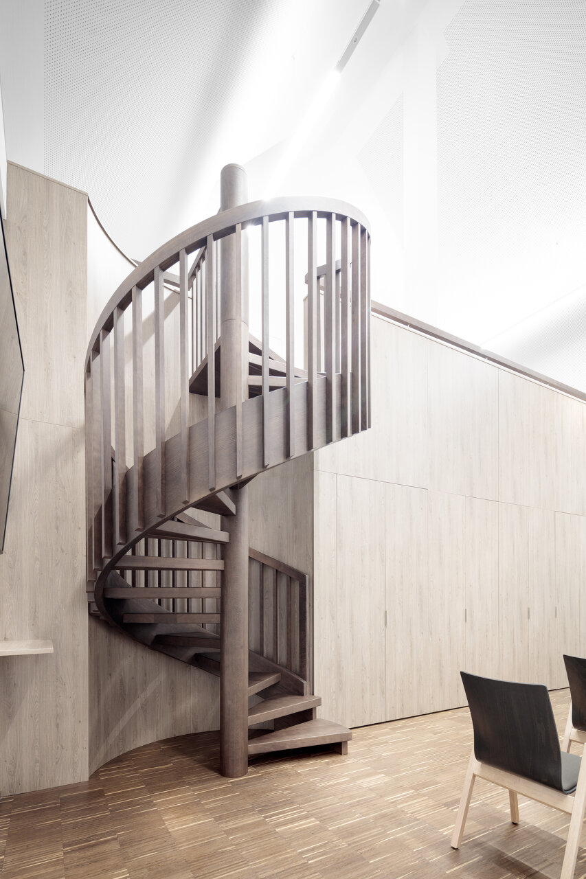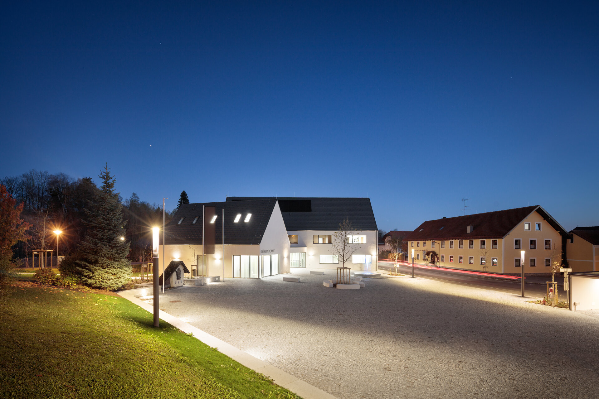 Der überdachte Vorbereich führt ins Foyer. Von hier sind der Sitzungssaal im westlichen Bauteil und östlich das Bürgerservice mit den angeschlossenen Büroräumlichkeiten erschlossen. Vom Parkplatz im Osten gelangt man in den Eingangsbereich für die Gewerbeflächen im Obergeschoß. Durch die räumliche Verbindung zum Bürgerservice kann das Obergeschoß auch als Erweiterung des Amtsgebäudes dienen. Der Bereich mit Sitzungssaal und Fraktionsraum inklusive Nebenräume kann abgetrennt werden und funktioniert so auch als Veranstaltungszentrum außerhalb der Amtszeiten. (Text: Architekten, bearbeitet)