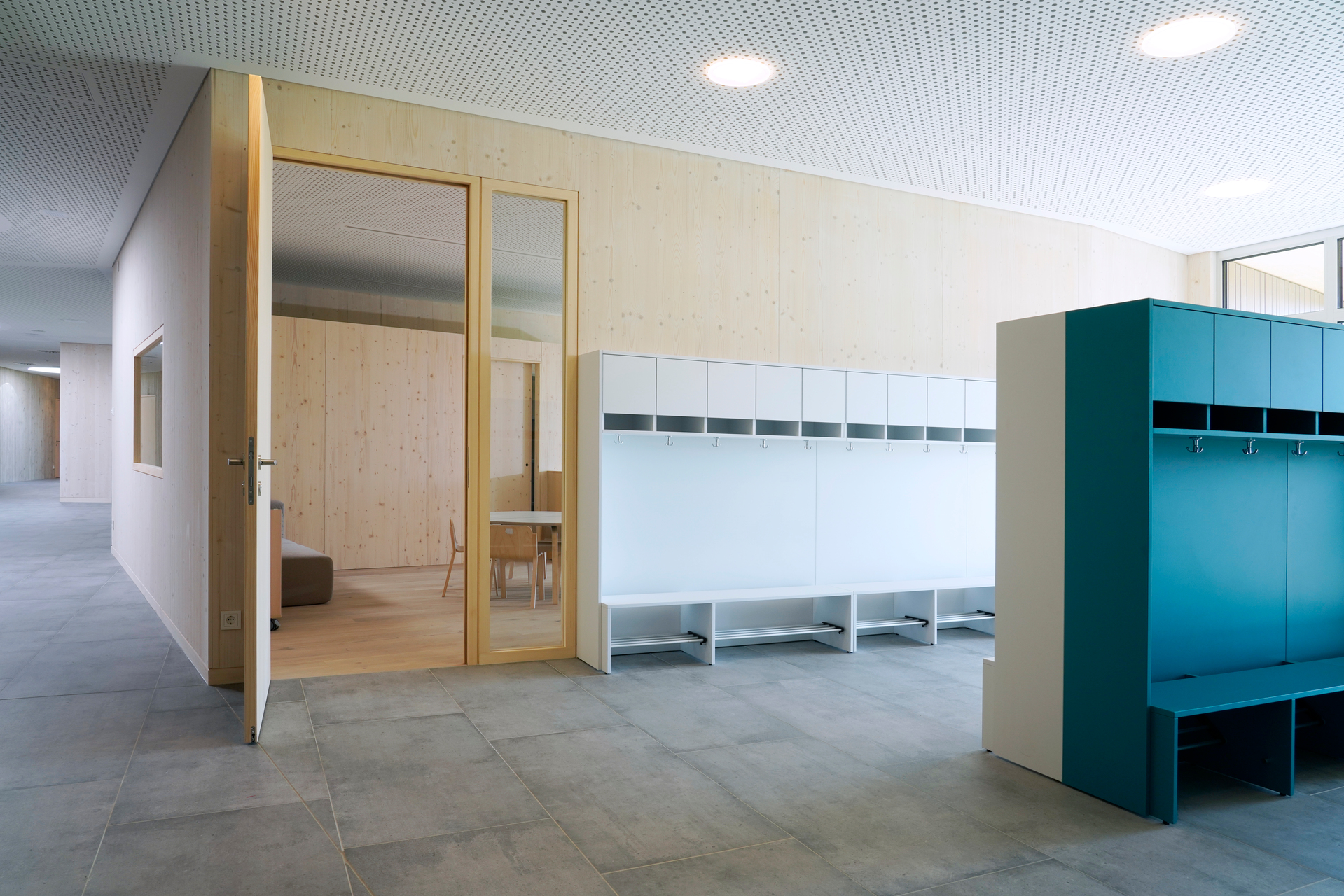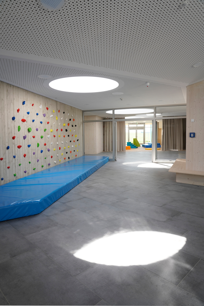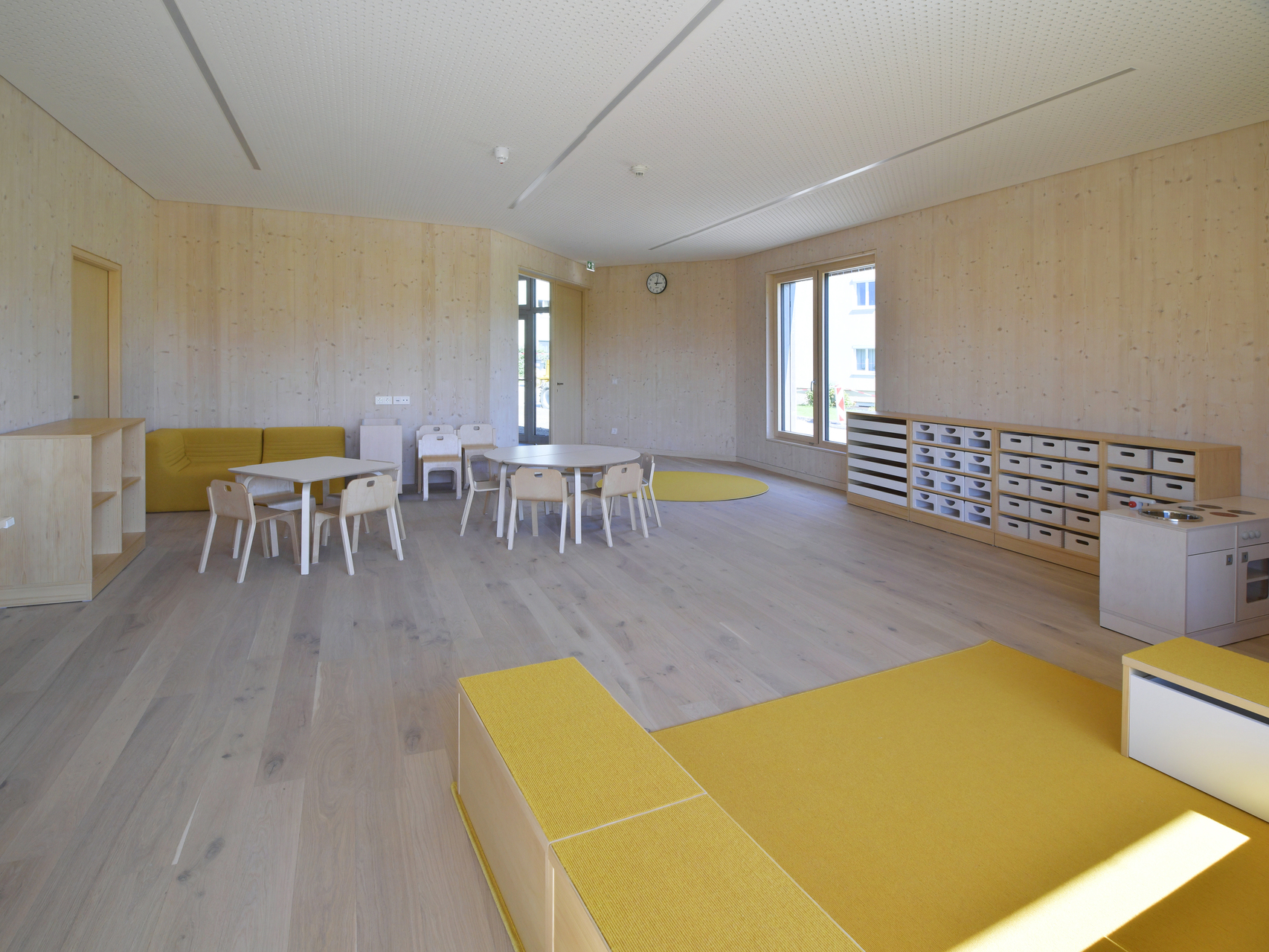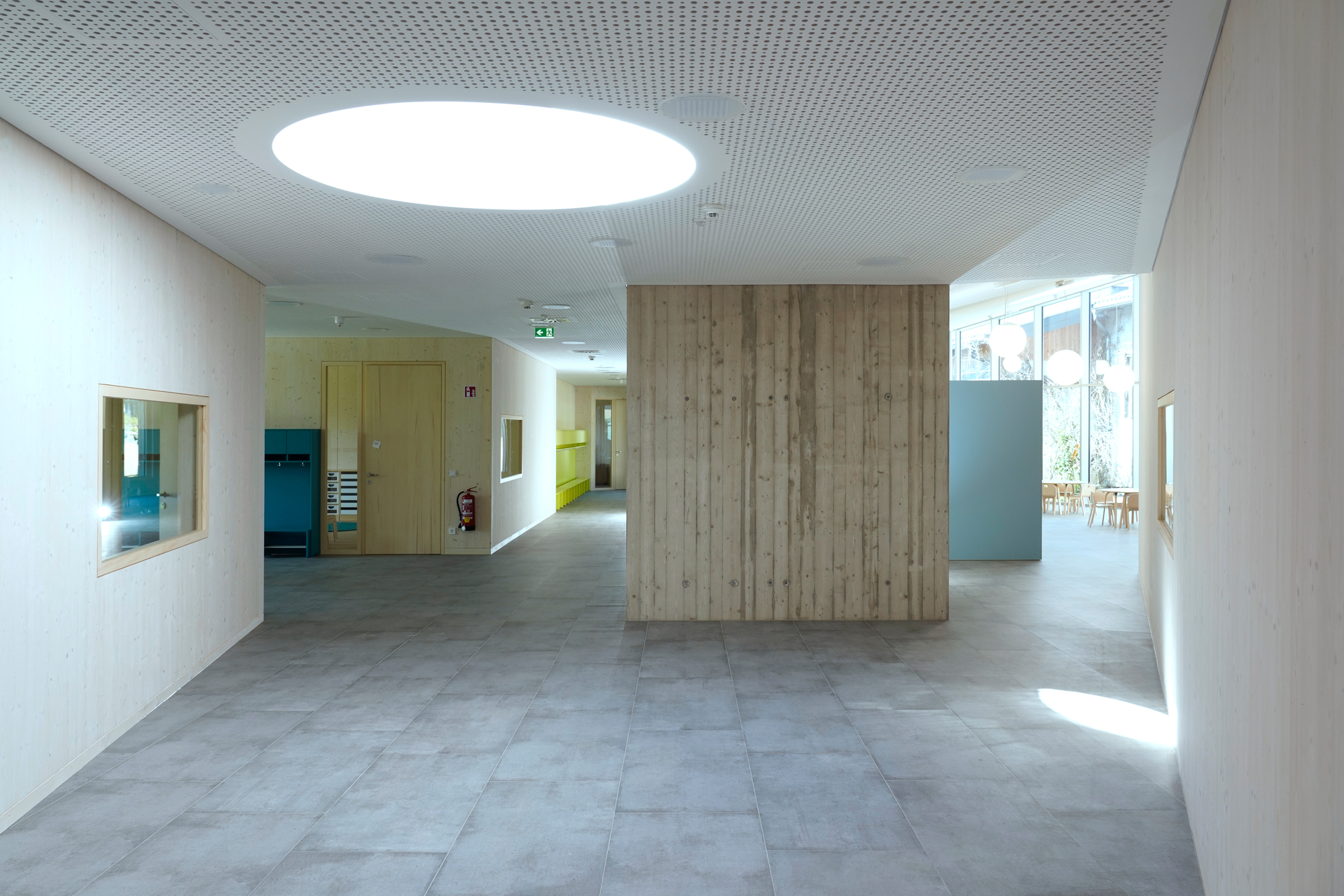Im Eingangsbereich und im Speisesaal führen überdurchschnittliche Raumhöhen zu einem großzügigen Raumeindruck. Das Farbkonzept ordnet den Gruppen- und Bewegungsräumen jeweils eine Farbe zu, die sich in Garderoben, Möbeln, Fliesen und Teppichen wiederfindet. Diese farbliche Codierung erleichtert den Kindern, dem Vorschulalter entsprechend, eine einfache, kindgerechte Orientierung im Haus. Jeder der zehn Gruppen wurde eine Farbe aus dem Spektrum des Regenbogens zugeordnet.