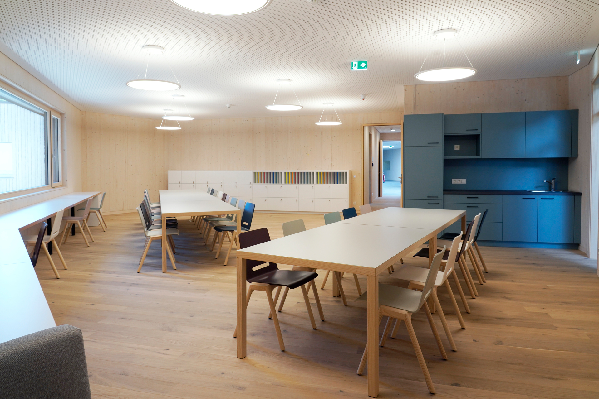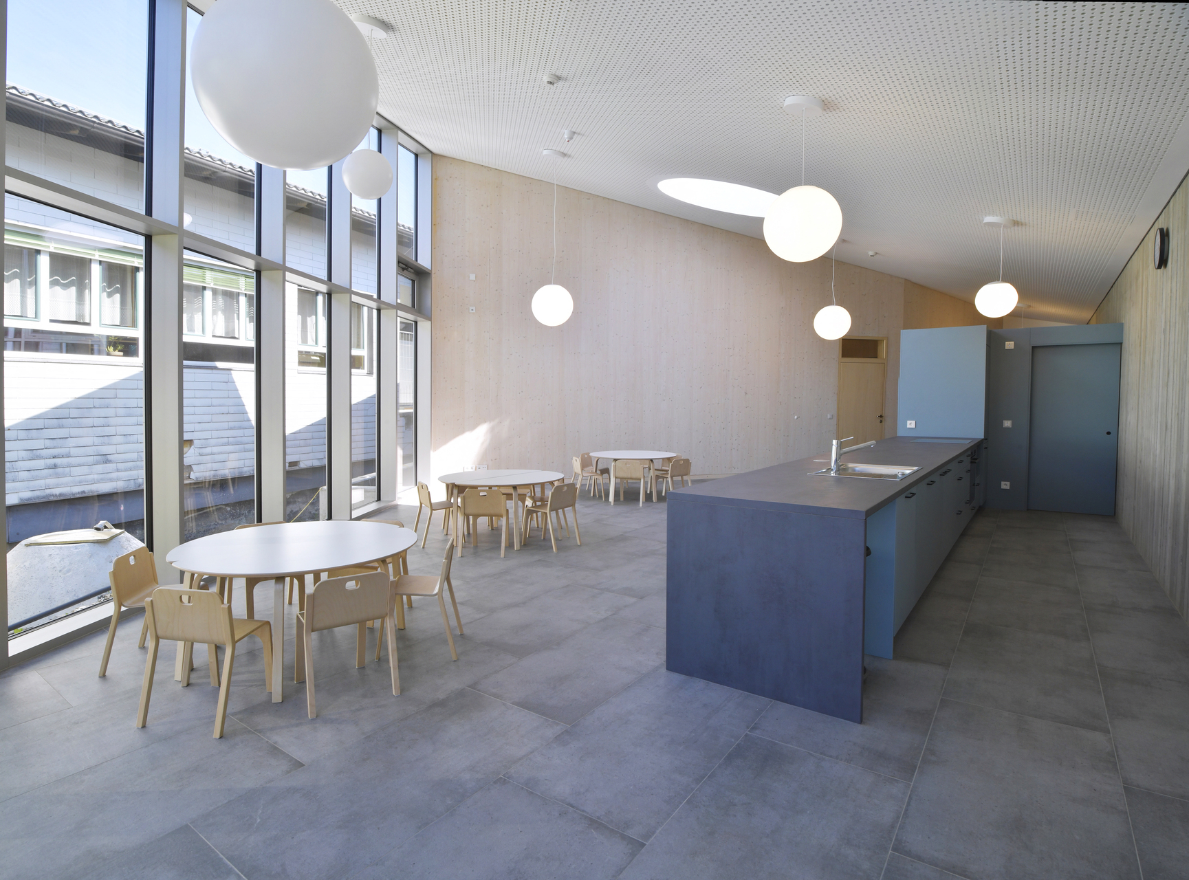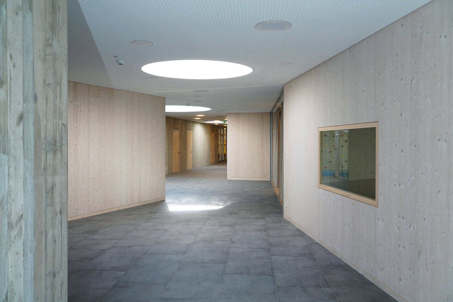 Im Eingangsbereich und im Speisesaal führen überdurchschnittliche Raumhöhen zu einem großzügigen Raumeindruck. Das Farbkonzept ordnet den Gruppen- und Bewegungsräumen jeweils eine Farbe zu, die sich in Garderoben, Möbeln, Fliesen und Teppichen wiederfindet. Diese farbliche Codierung erleichtert den Kindern, dem Vorschulalter entsprechend, eine einfache, kindgerechte Orientierung im Haus. Jeder der zehn Gruppen wurde eine Farbe aus dem Spektrum des Regenbogens zugeordnet.