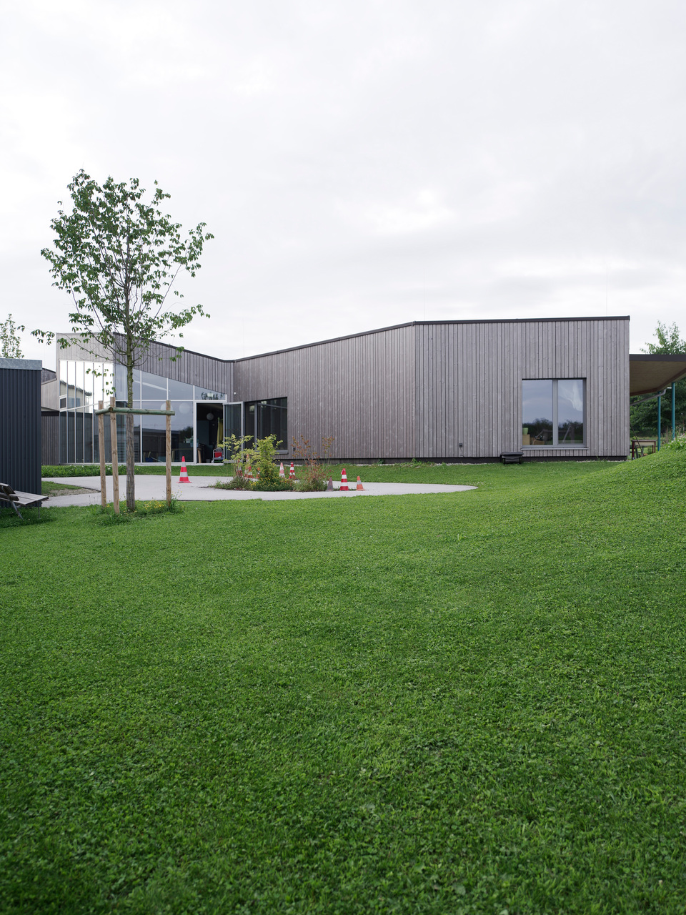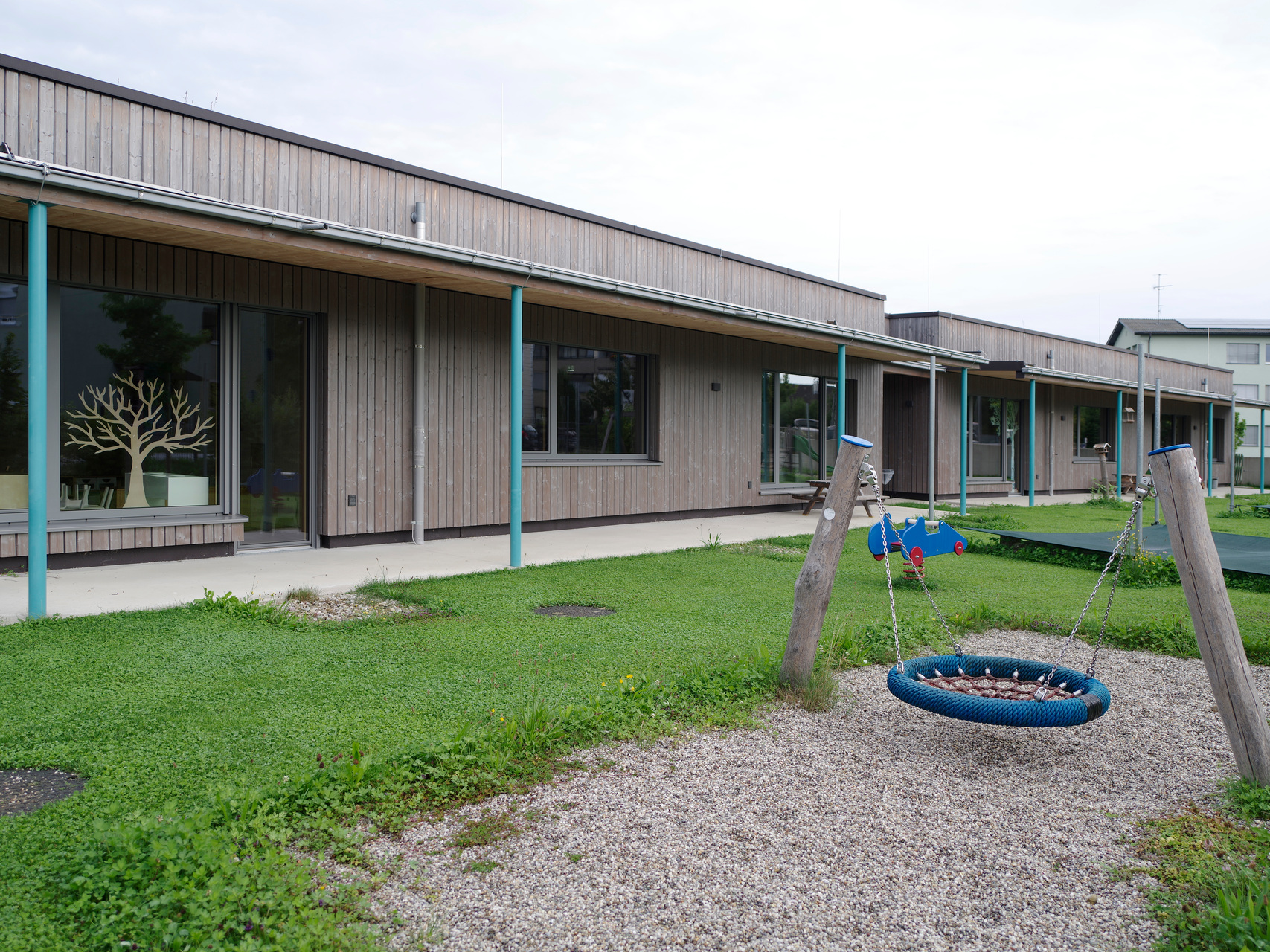 Das Gebäude wurde weitgehend mit Holzwerkstoffen errichtet und erfüllt hohe Energiestandards. Die lasierten und sichtbar belassenen massiven Holzwände und die mit strukturierten Oberflächen versehenen Sichtbetonwände der Sanitärkerne schaffen eine angenehme und beruhigende Raumatmosphäre. Die den Gruppen- und Bewegungsräumen vorgelagerten überdachten Terrassen bieten Sonnen- und Witterungsschutz sowie viel Platz zum Spielen im Freien. Extensiv begrünte Dachflächen verbessern das Mikroklima, schaffen die Einbindung in den Landschaftsraum und gewährleisten einen verzögerten Abfluss des Niederschlags. Die ebenfalls auf dem Dach situierte Photovoltaikanlage sorgt, in Kombination mit der Luftwärmepumpe, für einen, dem Stand der Technik entsprechenden Energiehaushalt. Mit der Errichtung des Hauses der Vereine (siehe: https://www.nextroom.at/building.php?id=41043) nördlich der „Kinderstadt“ wurde ein gemeinsamer Vorplatz mit hochwertigen Oberflächen und Bepflanzung geschaffen. (Text: Roman Höllbacher, nach einem Text der Architekten)