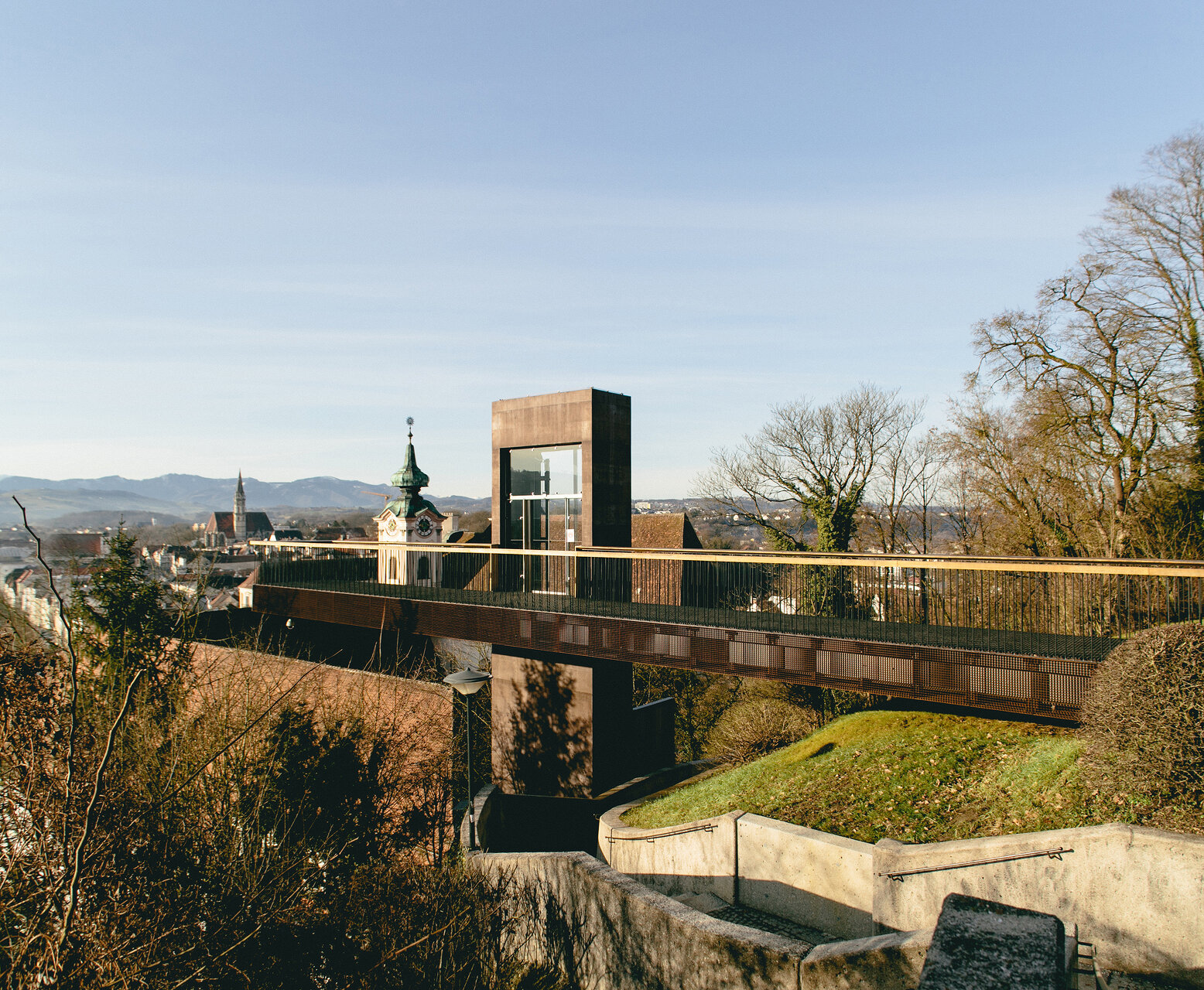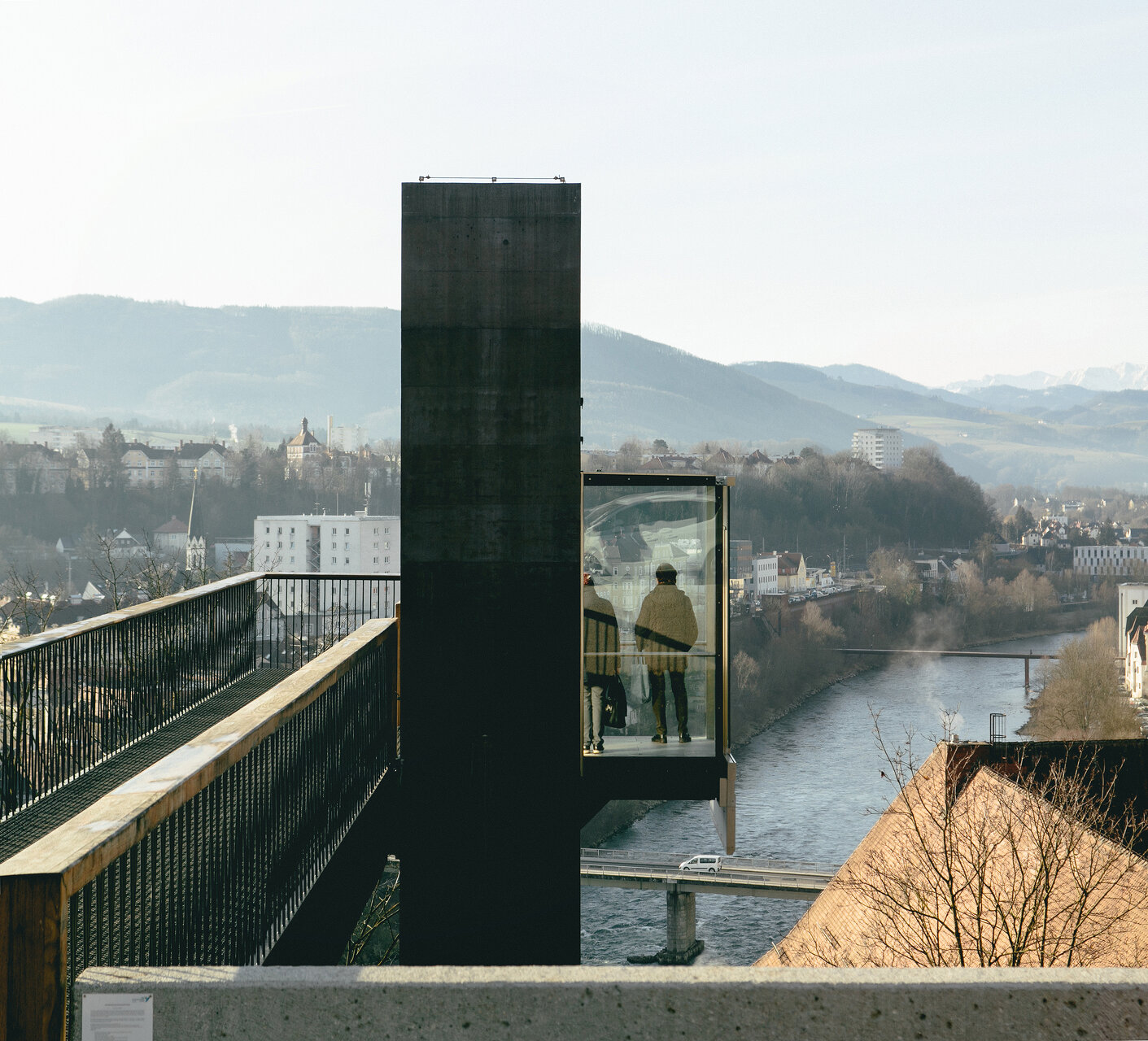 An einem der sensibelsten Standorte Steyrs, geprägt von historischer, größtenteils denkmalgeschützter Bebauung, war die Erwartungshaltung hinsichtlich anspruchsvoller Architektur sehr hoch. Aufgrund der harmonischen städtebaulichen Konfiguration Michaelerkirche-Taborturm-Bürgerspital wurde besonderes Augenmerk auf die Stadtbildverträglichkeit gelegt. Die umgebende Bebauung verlangte einerseits eine zurückhaltende, reduzierte Gestaltung, andererseits sollte dennoch ein Zeichen zeitgenössischer Architektur im Ensemble gesetzt werden. Zu berücksichtigen war außerdem, dass der Panoramalift das natürliche Felskonglomerat weitgehend schont. Der Liftzugang im Berg sollte hervorgehoben werden, ohne den einzigartigen Charakter des Stollens zu entfremden. (Text: Architekten, bearbeitet)