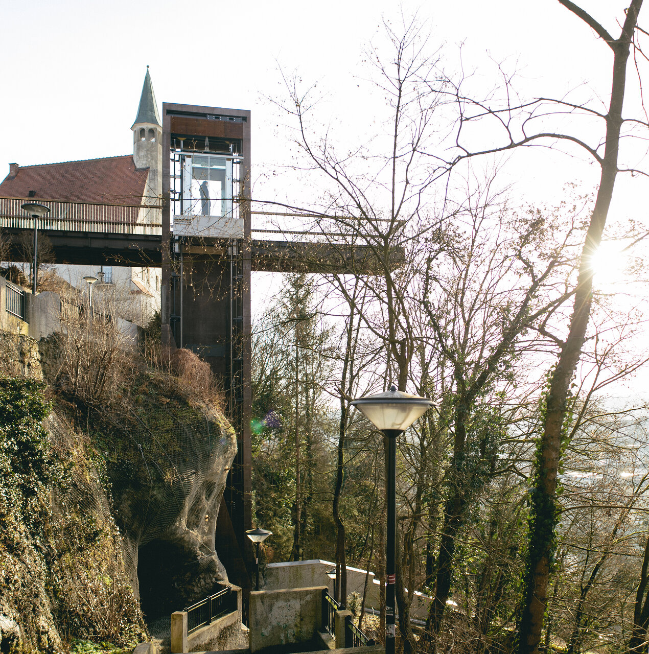 Aus Gründen des Denkmalschutzes sollte der Verlauf der Taborstiege möglichst unangetastet bleiben und die Zugänglichkeit zum weit verzweigten Stollensystem aus dem Zweiten Weltkrieg musste gewährleistet werden. So liegt die talseitige Einstiegsstelle etwa 15 Meter im Berginneren, am Ende des Zugangsstollens zum denkmalgeschützten Fluchtstollen. Der Vertikalaufzug wird teils im Berg und teils im Freien geführt, durchdringt in einer Höhe von 18 Metern den Berg und fährt entlang einer Felswand weiter bis zur Ausstiegsstelle, wo ein Steg Ausstiegsstelle und Weg miteinander verbindet.
