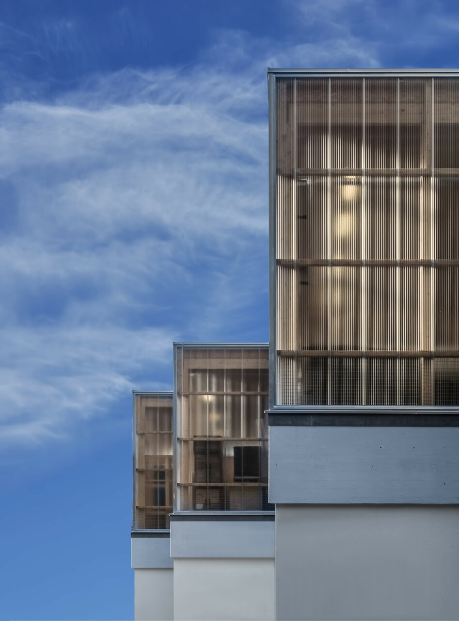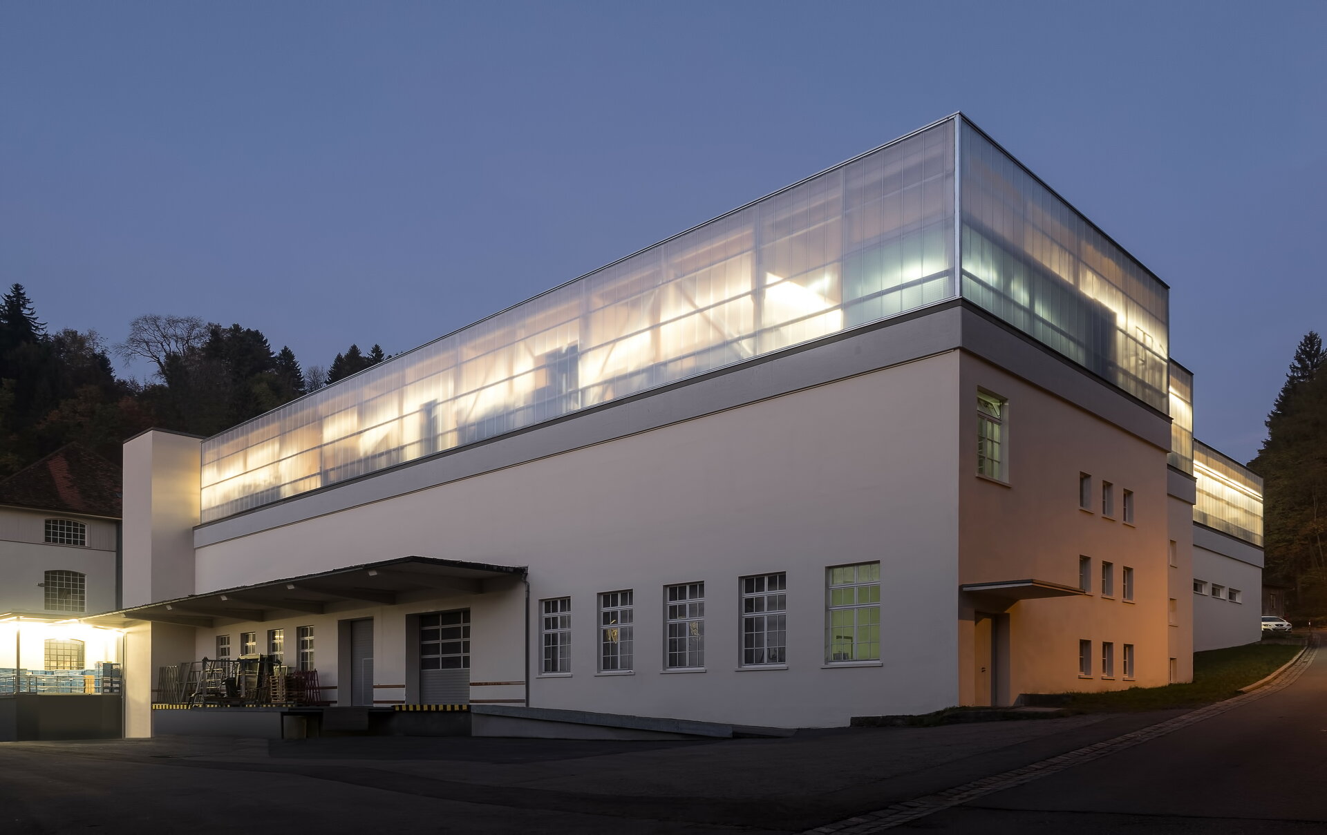 Ausgeführt wurde die Aufstockung in leichter Holzbauweise, als Leimbinderkonstruktion, die nach oben hin von einem Flachdach abgeschlossen wird. Da die Statik des Bestandsbaus auf diese zusätzlichen Lasten nicht ausgelegt war, mussten die vorhandenen Fundamente und Stützen in Teilen verstärkt werden. Zur Fassadengestaltung des neuen, dritten Obergeschoßes kamen semitransparente Polycarbonat-Platten zum Einsatz, wodurch die Höhe des aufgestockten Gebäudes optisch verringert wurde. Durch den baulichen Eingriff verfügt die Zwirnerei heute über mehr als tausend Quadratmeter zusätzlicher Lagerfläche. (Text: Architekten, bearbeitet)