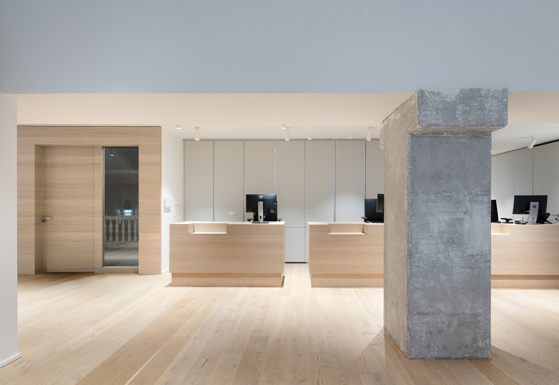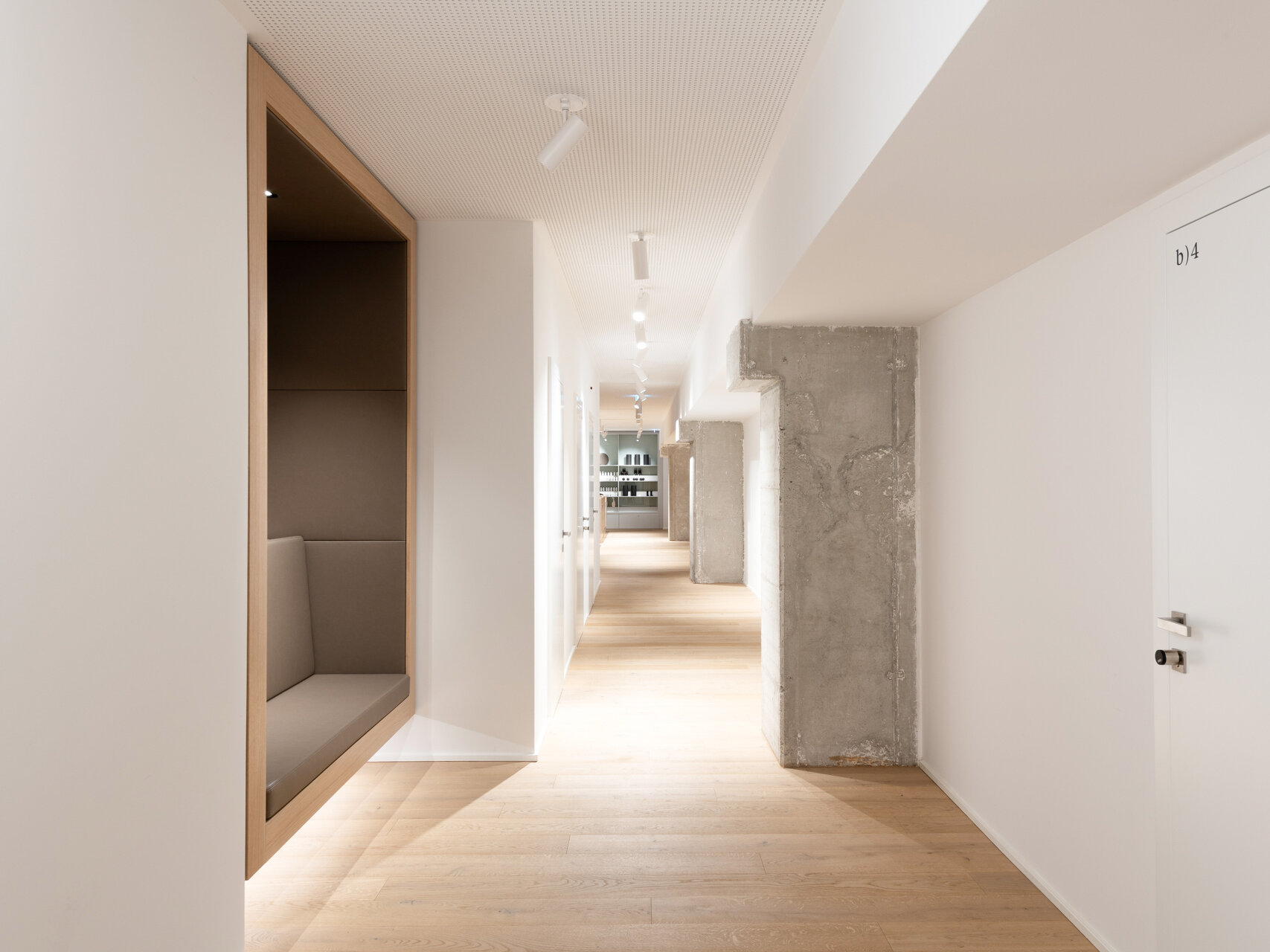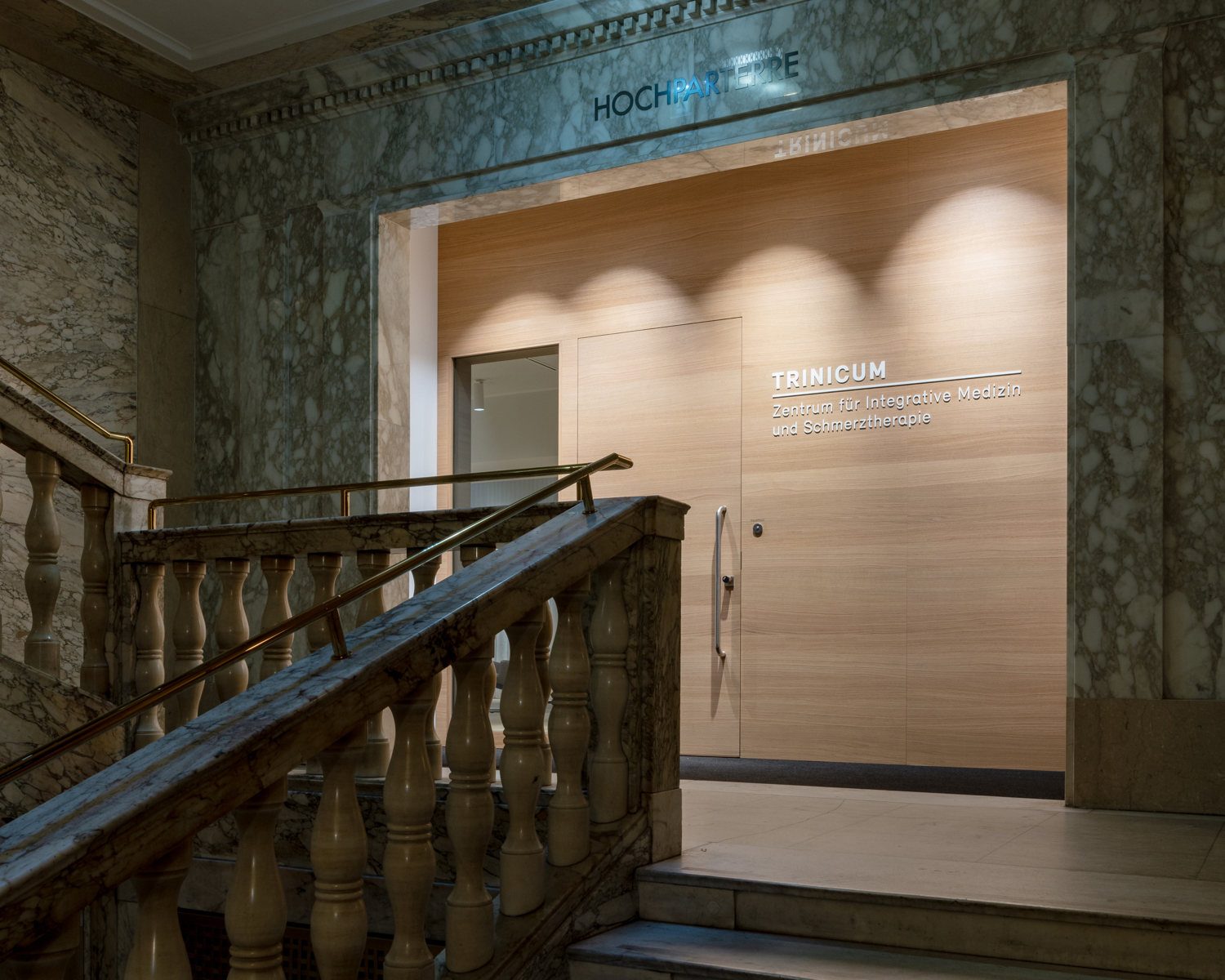 Beim neuen Standort handelt es sich um das prominente Palais Fanto am Schwarzenbergplatz, das zu den prächtigsten Beispielen des Neoklassizismus in Wien zählt. Während die komplexe architektonische Konzeption des 1917 errichteten Gebäudes mit seiner markanten dreieckigen Grundform noch intakt und auch von außen ablesbar ist, war das Innere durch zahlreiche kleinteilige Einbauten aus den 1980er Jahren teilweise stark verändert und in Mitleidenschaft gezogen. Die erste Maßnahme bestand daher in der Zusammenlegung der ehemaligen Kleinbüros zu einer einheitlichen, im Hochparterre gelegenen Etage und in der Aushöhlung der bestehenden Einbauten. Nur die Träger der historischen Skelettkonstruktion blieben erhalten und setzen - nun freigelegt - starke, beinahe skulpturale Akzente in einem sonst bewusst zurückhaltenden Ambiente, das neben Stein von weiteren natürlichen Materialien wie Eiche für Böden und Türen und Leder für die eigens entworfen Sitzbänke und -kojen geprägt wird. Sämtliche Behandlungs- und Trainingsräume sind so ausgerichtet, dass sie über natürliches Licht verfügen und die warmen Eigenfarben der Materialien zur Geltung kommen. Mitten in der hektischen Innenstadt gelegen, bietet das Trinicum ein modernes, helles Refugium jenseits jeglicher Form von Sterilität, in dem Besucher und Behandler ideale Bedingungen für ihre gemeinsame Arbeit vorfinden. (Text: Architekt:innen)