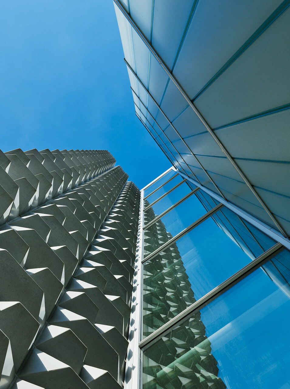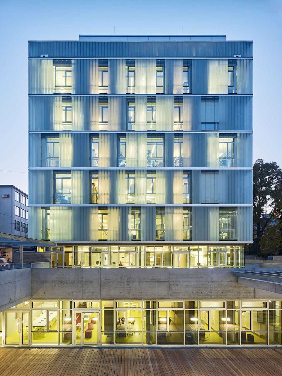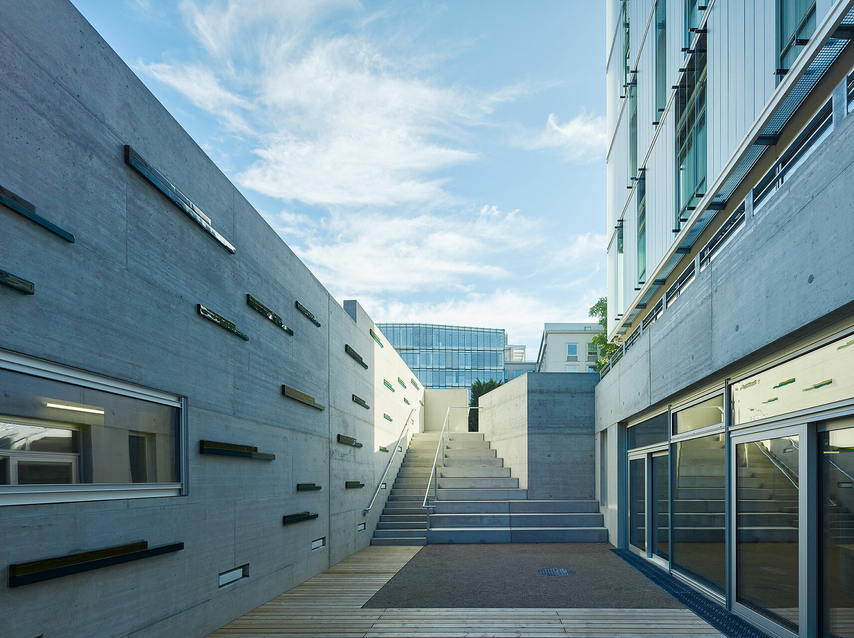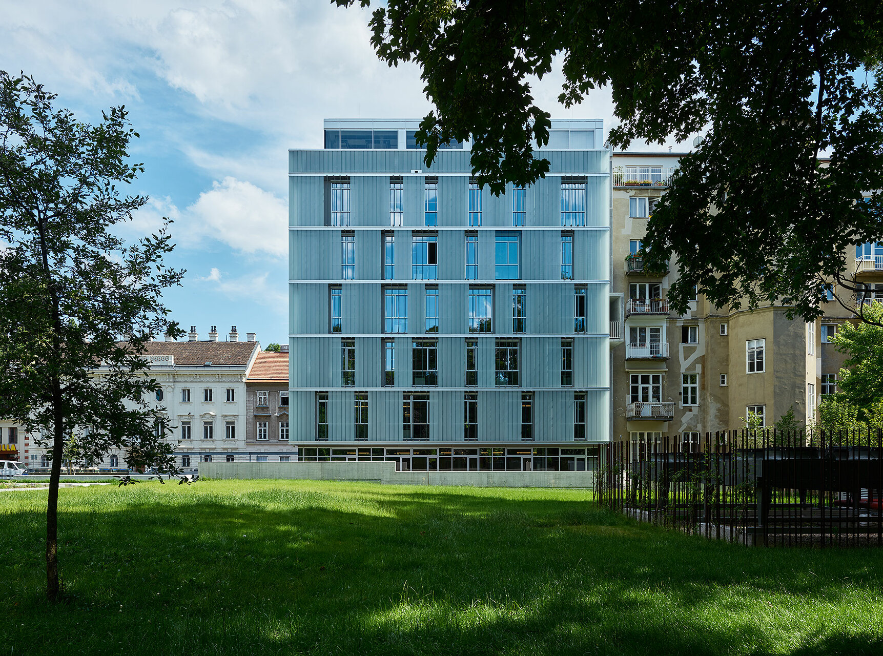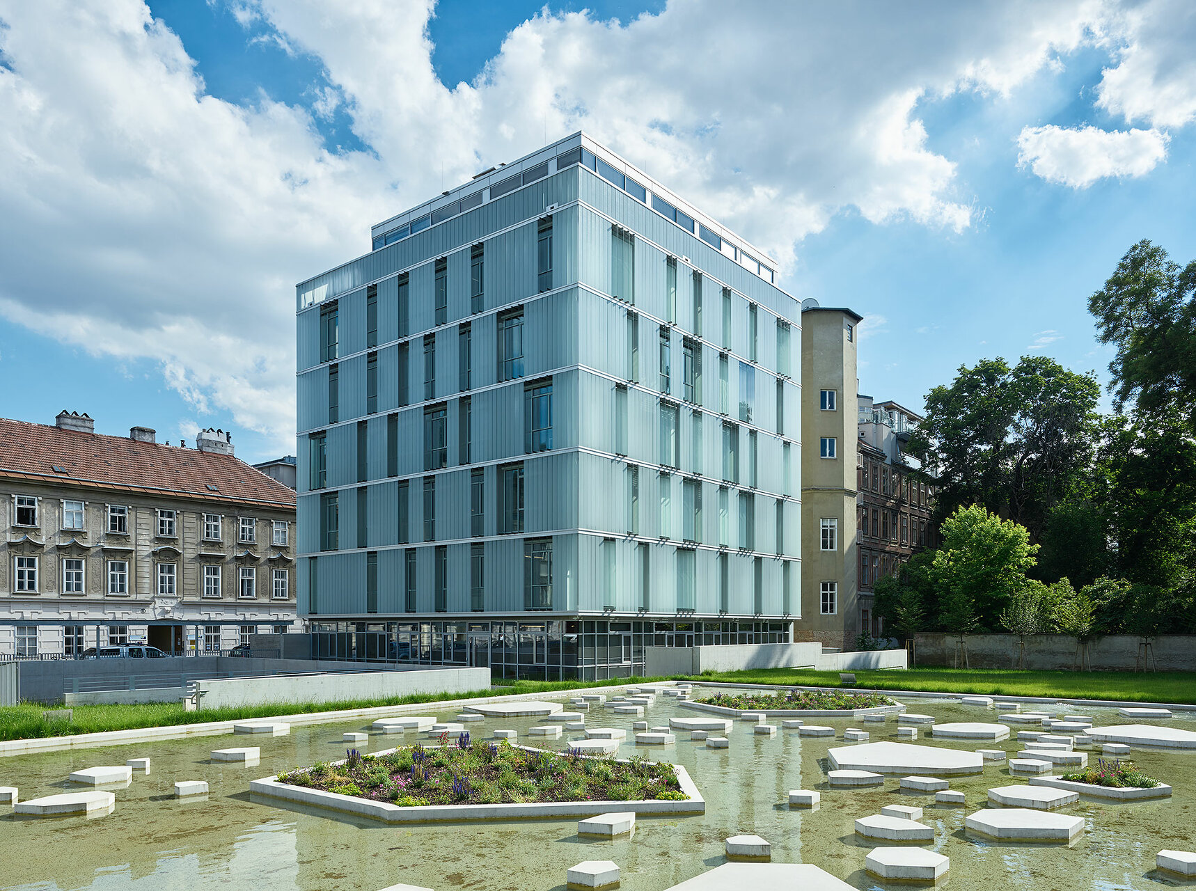 Der neue Baukörper ist durchgängig orthogonal gegliedert, die Kopfsituation wird durch eine Fuge zum Bestand und die grundverschiedene Fassadengestaltung artikuliert. Bezug zum umgebenden Garten schaffen die zwei abgesenkten Lichthöfe und die für Belichtung im ersten Untergeschoß sorgen. Die Fassade ist zweischichtig mit einer Außenhaut aus Profilglas und punktuell eingefügten Flachglas-Drehlamellen, welche die Überwärmung des Zwischenraums verhindern. Die Innenhaut besteht aus geschlossenen Paneelen und Fensterelementen mit Öffnungsflügeln und Fixverglasung.