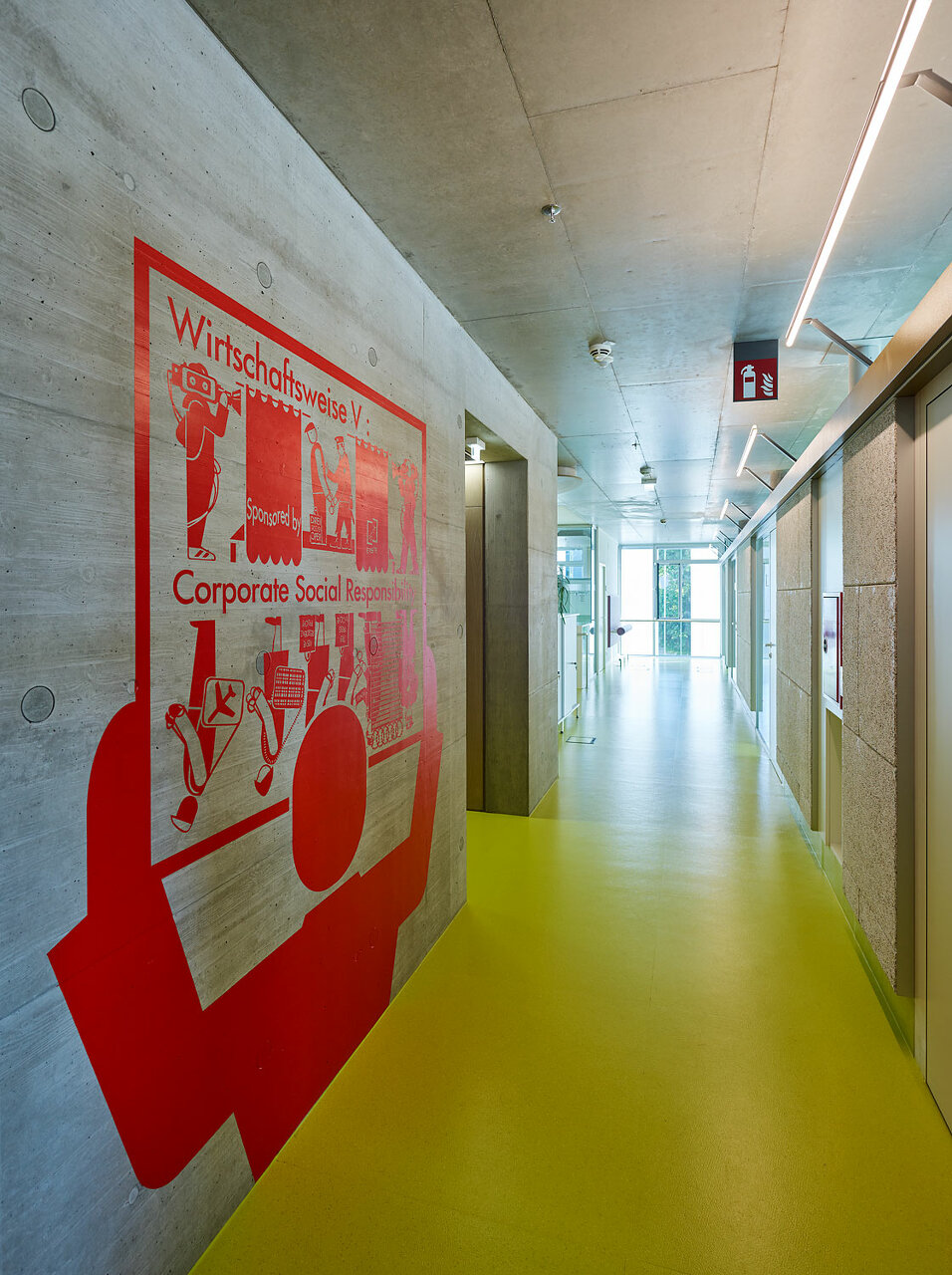 Andreas Siekmann gestaltete im Inneren des Hauses mehrere Sichtbetonwände mit pointierten Grafiken zu Themen der Wirtschaftswelt. (Text: Architekt:innen, bearbeitet)