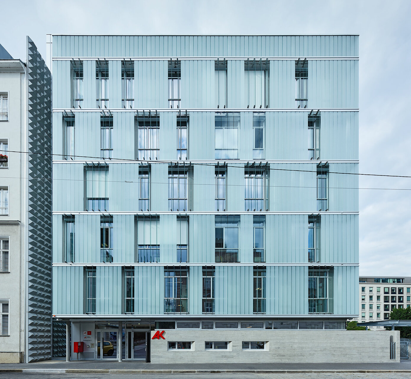 Peter Sandbichler gestaltete die Feuermauer zu den Nachbarbauten als Bossenwand plastisch, im Stiegenhaus als Grafik im Sichtbeton. Dies betont die Absetzung des Kopfbaues von der Häuserzeile und thematisiert die gestalterische Distanz zur Gründerzeitarchitektur.
