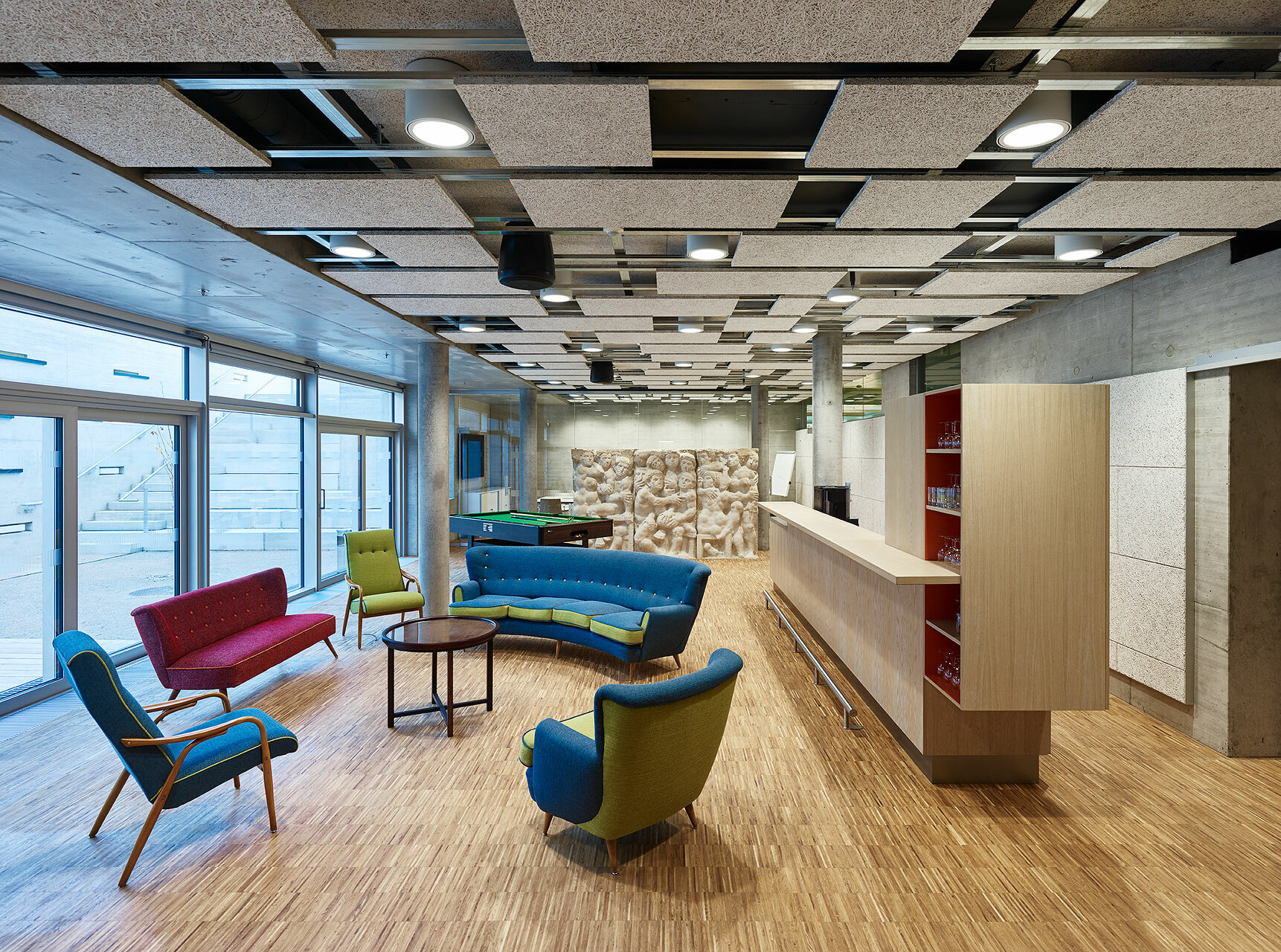 Dem Wunsch nach kleinteiligen, transparenten Büros wurde mit differenzierten Trennwänden und großem Glasanteil entsprochen. Der Kranz von Büroräumen umschließt eine großzügige, kommunikative Mittelzone. Innerhalb der Abteilung öffnet sich diese Mittelzone mit internen Verbindungstreppen und Lufträumen über drei Geschosse. Das Materialkonzept bleibt möglichst einfach und unbehandelt: Profilglas ist eine Reminiszenz an industrielle Bauten, Beton wird generell als Sichtbeton gezeigt, Akustikelemente sind unverkleidete Herakustik-Dämmplatten, Metallteile aus natur-eloxiertem Aluminium. Einziger farblicher Akzent ist der gelbgrüne Kautschuk-Bodenbelag.