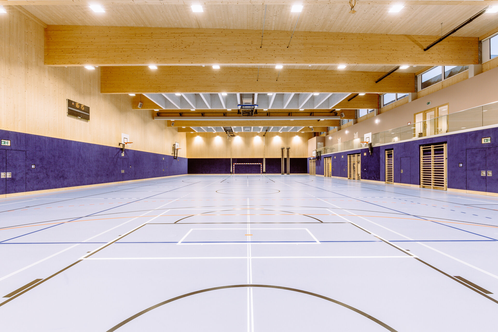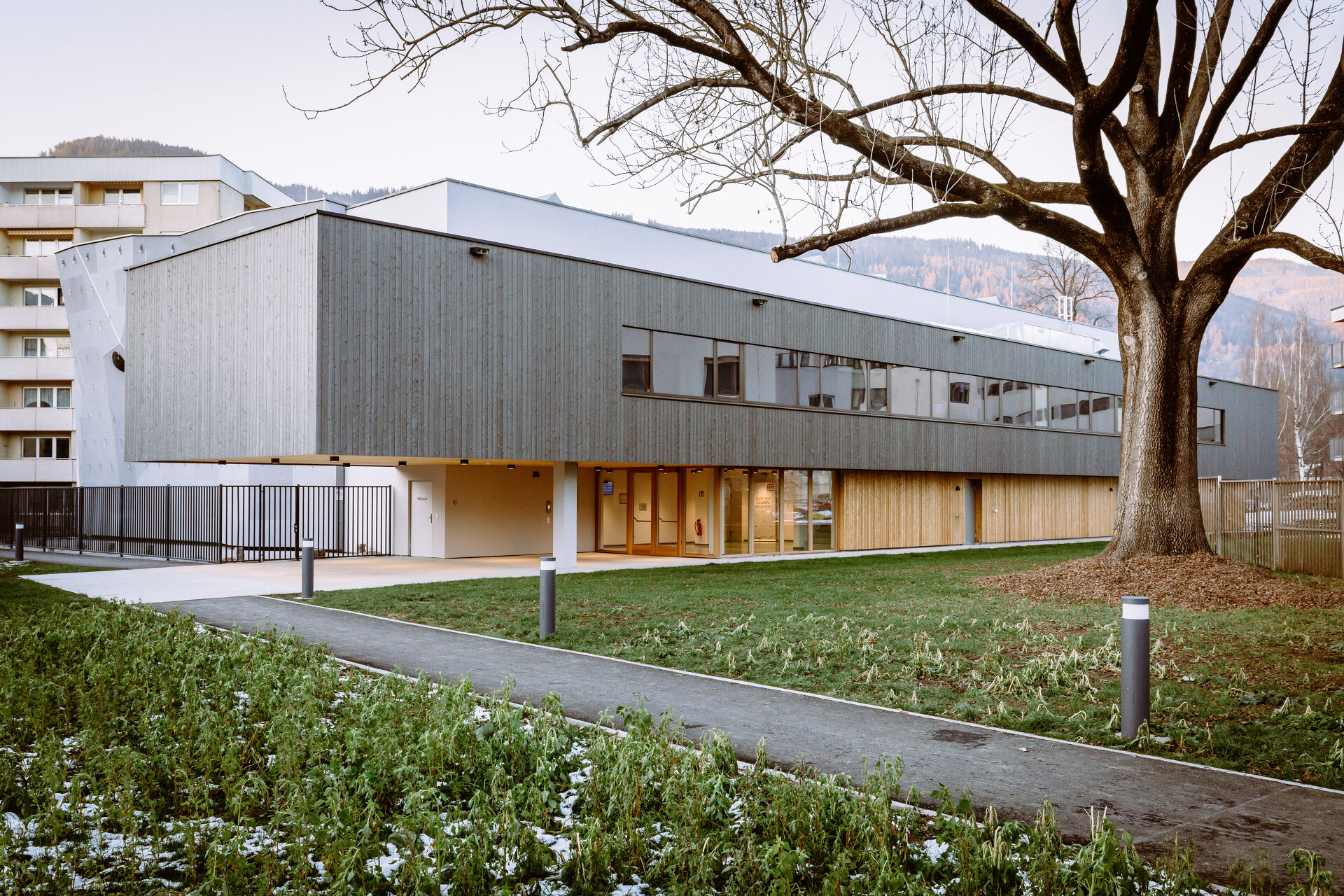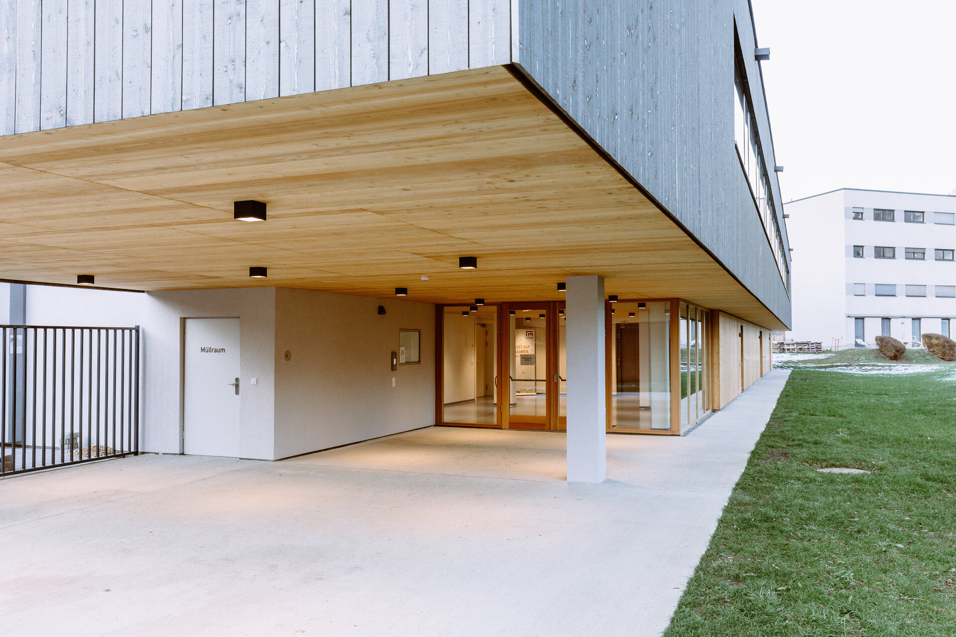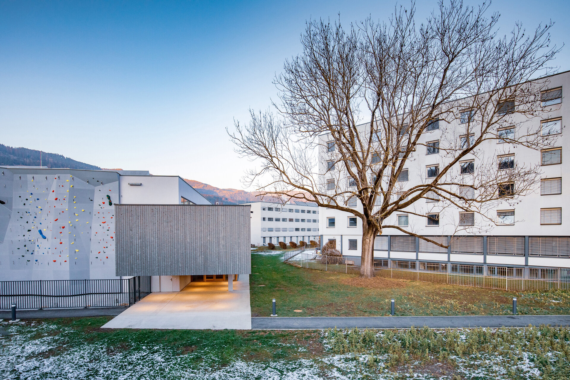 Ballsporthalle und Umkleidetrakt unterscheiden sich außerlich deutlich durch ihre Fassadenoberflächen: Während die Halle verputzt bzw. an ihrer Südseite mit Holzwerkstoffplatten bekleidet ist, erhielten die Fassaden des Umkleidetrakts unterschiedliche Holzschalungen. (Text: Architekten, bearbeitet)