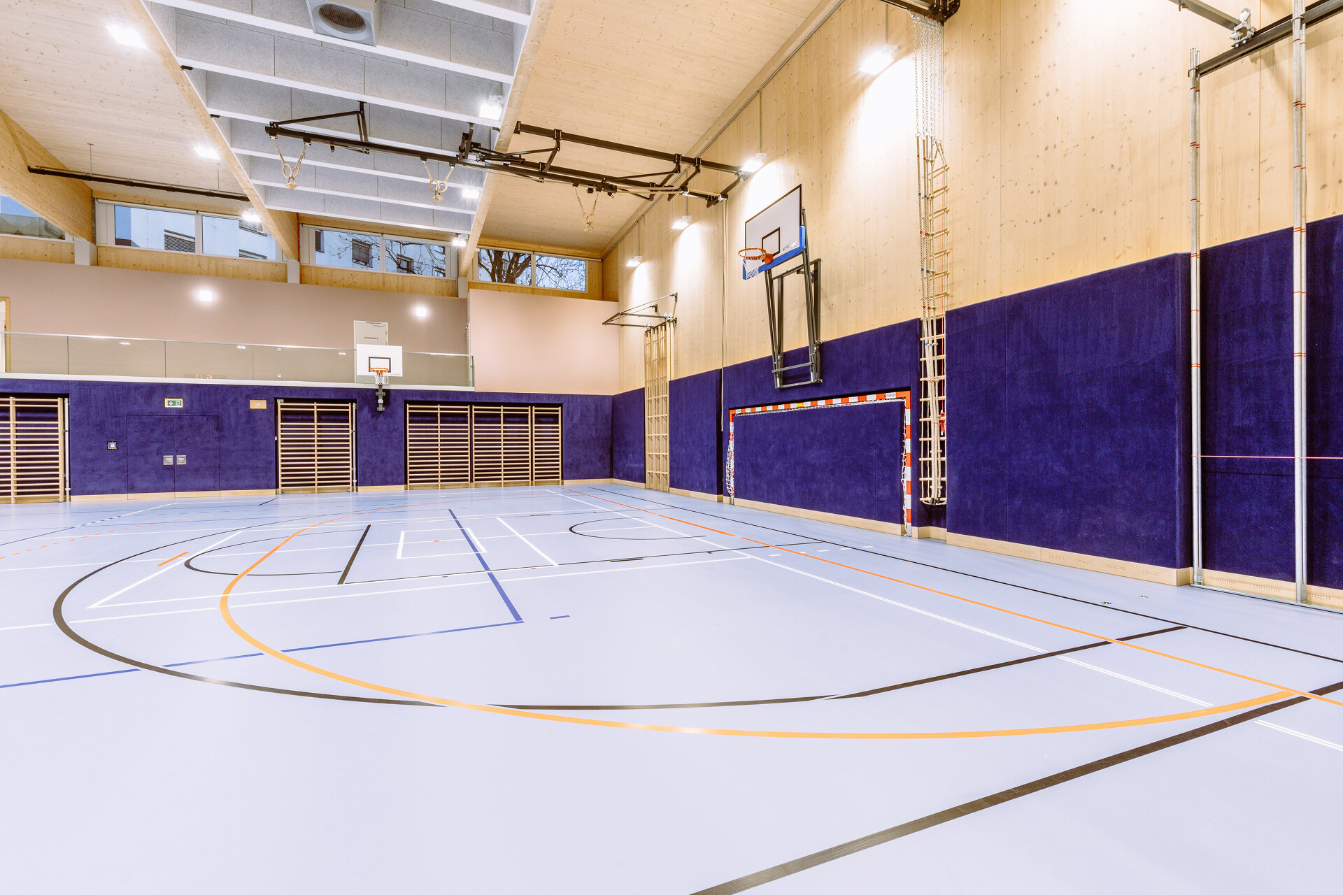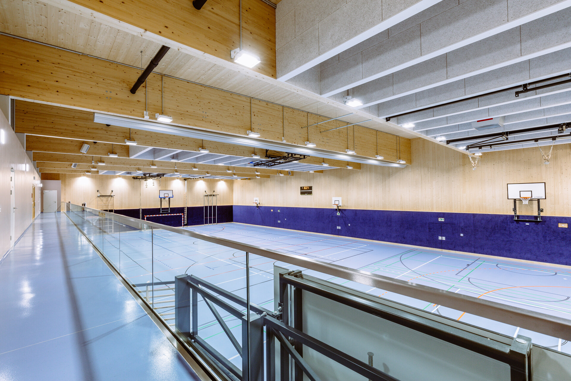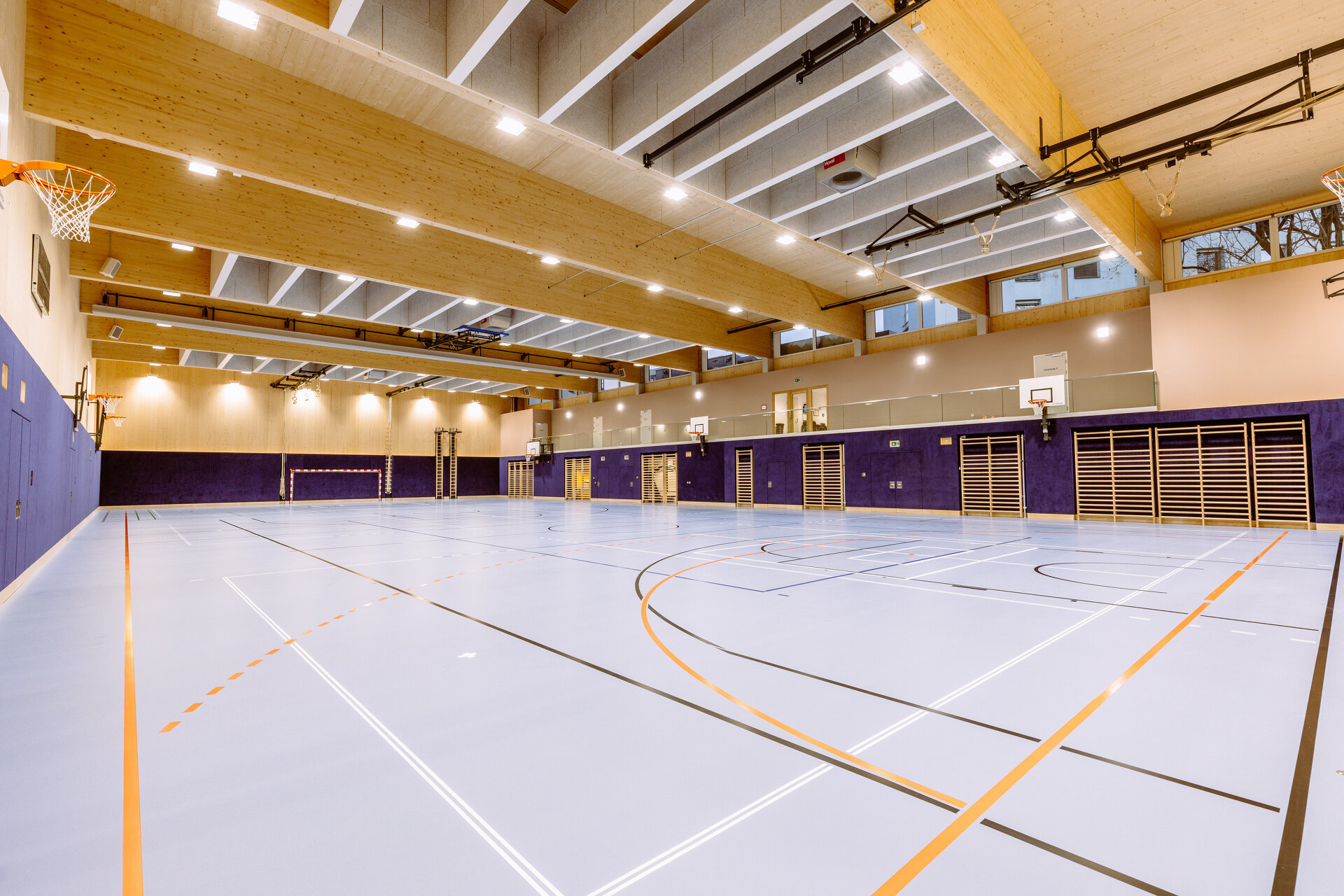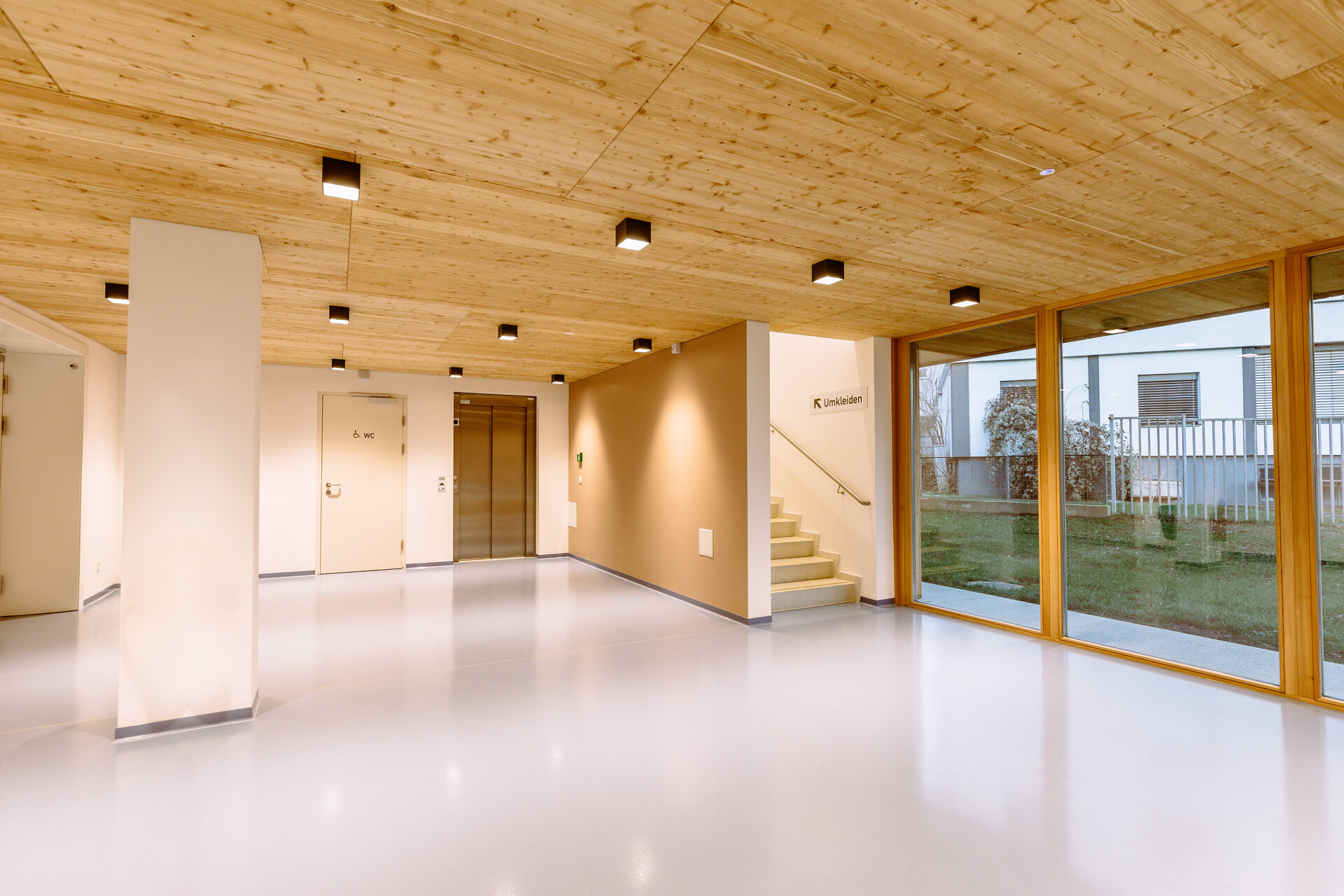 Ballsporthalle und Umkleidetrakt unterscheiden sich außerlich deutlich durch ihre Fassadenoberflächen: Während die Halle verputzt bzw. an ihrer Südseite mit Holzwerkstoffplatten bekleidet ist, erhielten die Fassaden des Umkleidetrakts unterschiedliche Holzschalungen. (Text: Architekten, bearbeitet)