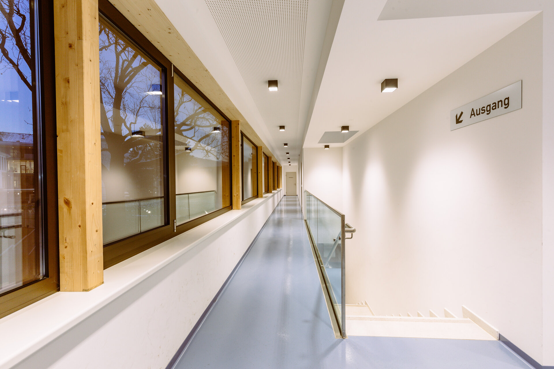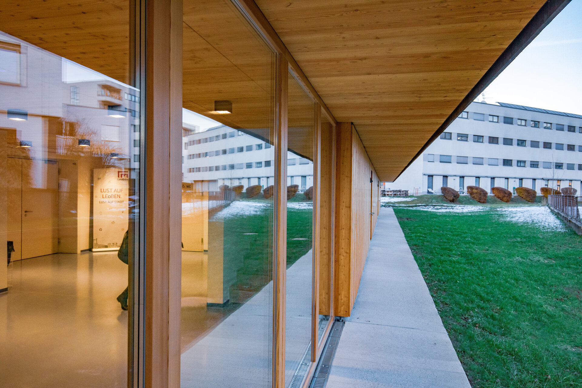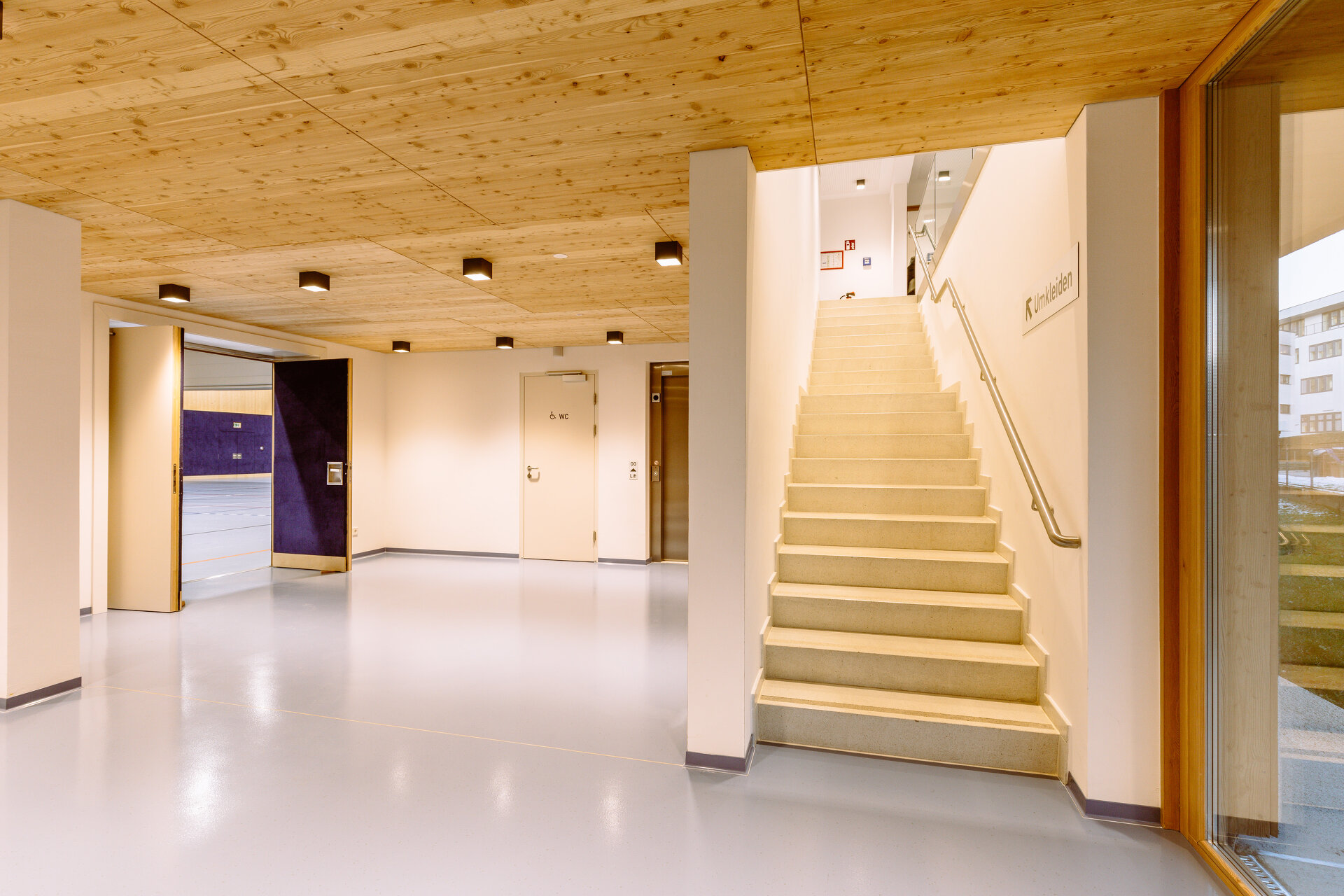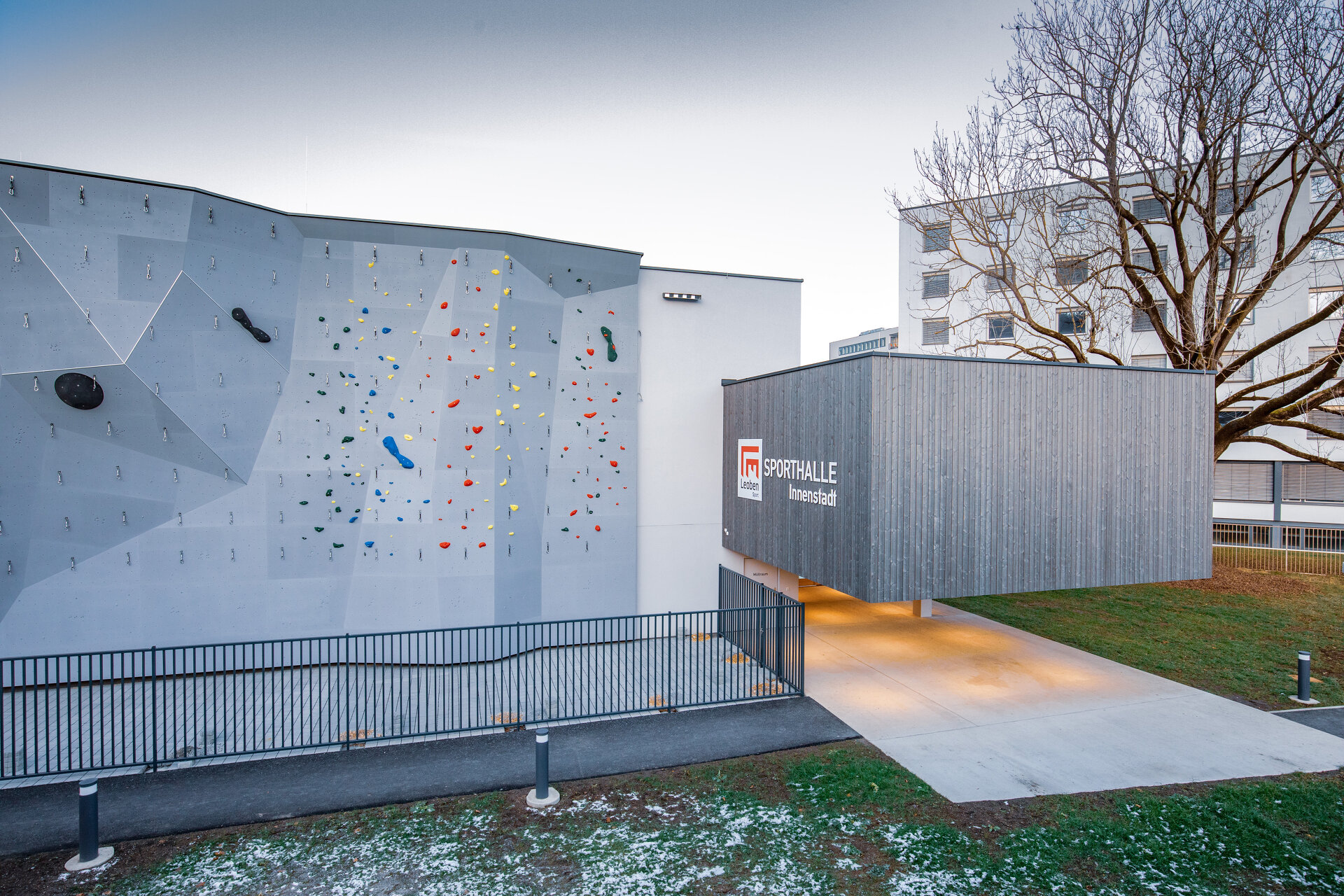 Ballsporthalle und Umkleidetrakt unterscheiden sich außerlich deutlich durch ihre Fassadenoberflächen: Während die Halle verputzt bzw. an ihrer Südseite mit Holzwerkstoffplatten bekleidet ist, erhielten die Fassaden des Umkleidetrakts unterschiedliche Holzschalungen. (Text: Architekten, bearbeitet)