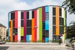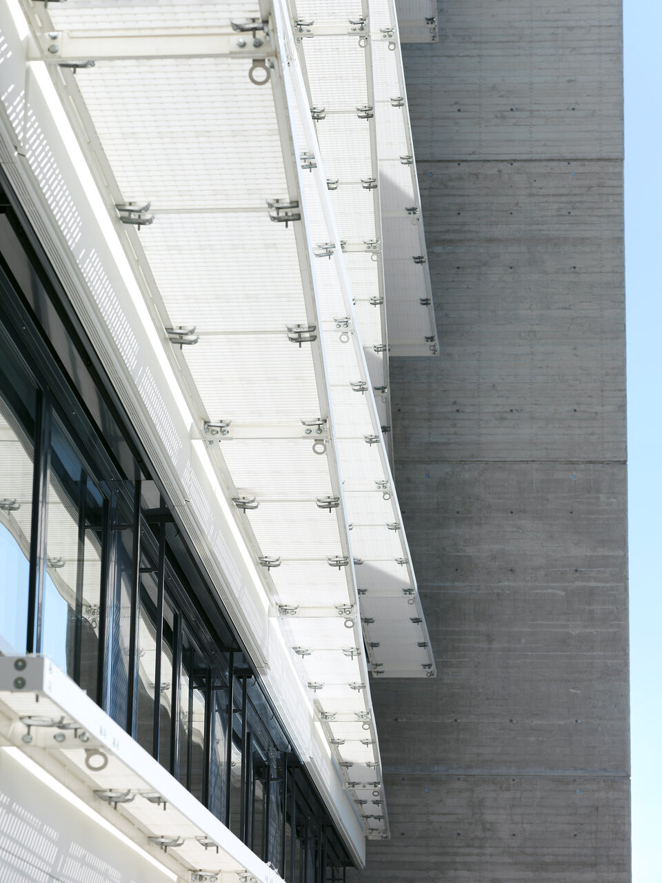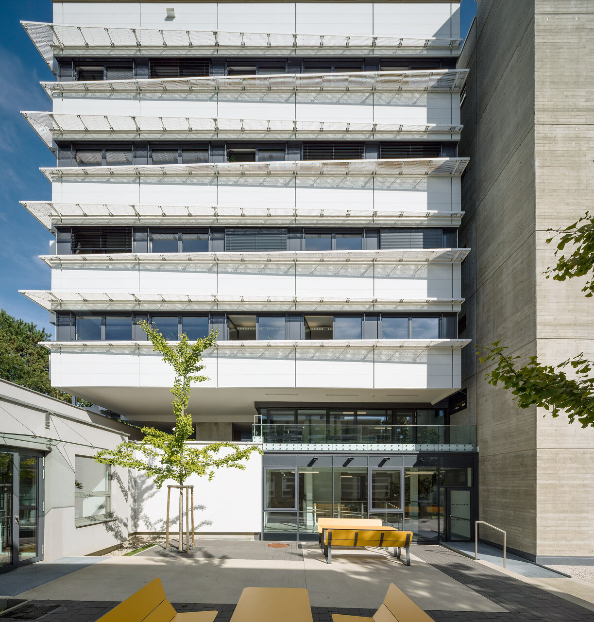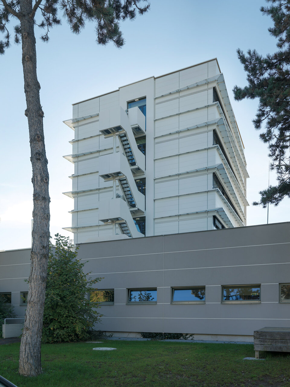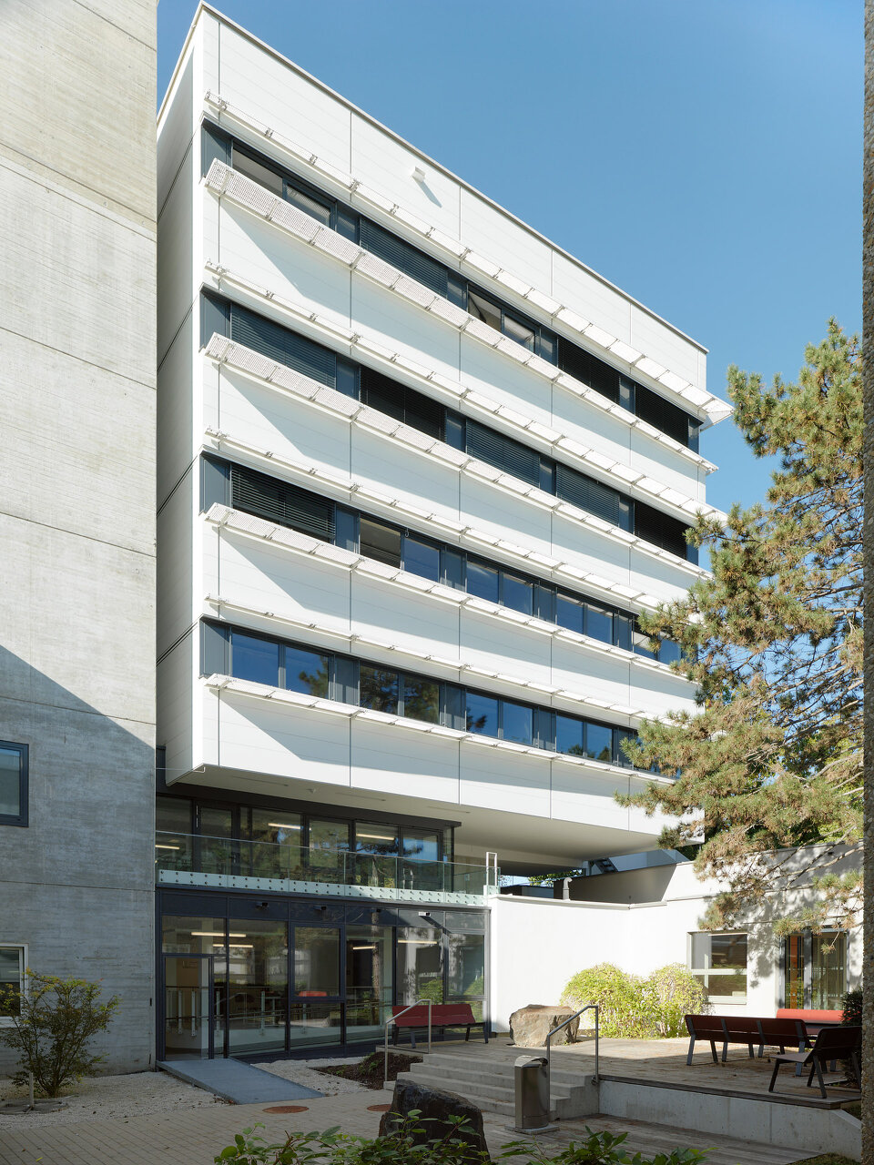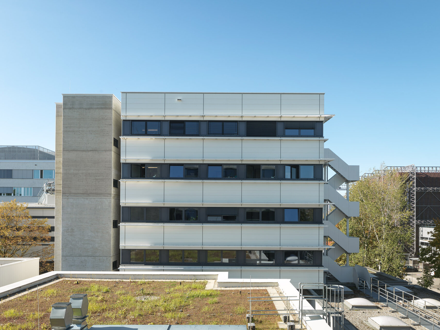Die Bürotürme und die dazugehörigen Erschließungsbauteile erhielten eine vorgehängte, hinterlüftete Fassade aus gekanteten Blechkassetten, die eine gefaltete Fassade erzeugen, in der die Fensteröffnungen unregelmäßig ausgespart werden. Die Verschränkung der Fassade wird zu einem gestalterischen Mittel, welche die Signifikanz und Raffinesse der Fassade hervorhebt und das Erscheinungsbild der Maschinentechnischen Institute unverwechselbar macht. (Text: Architekten, bearbeitet)