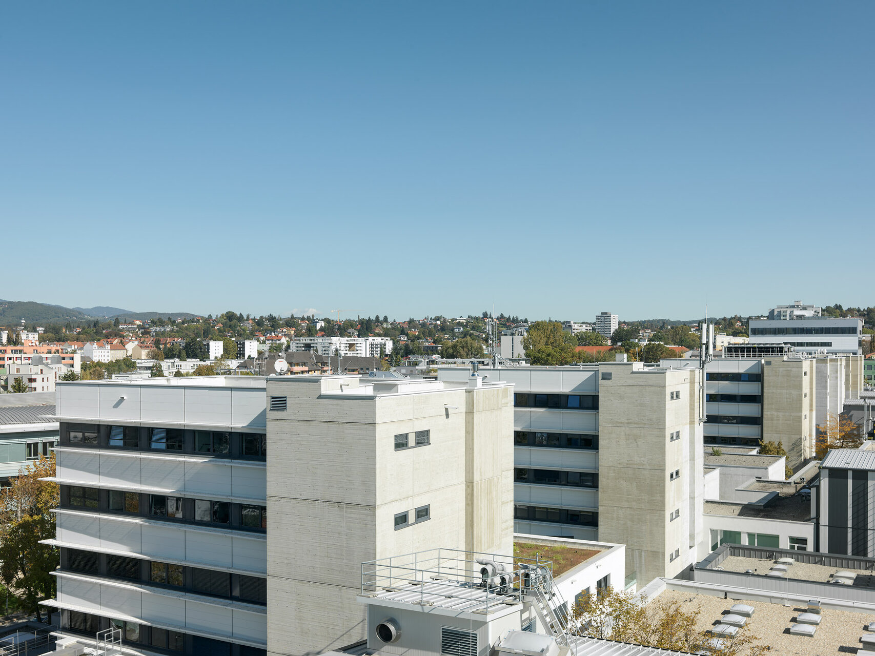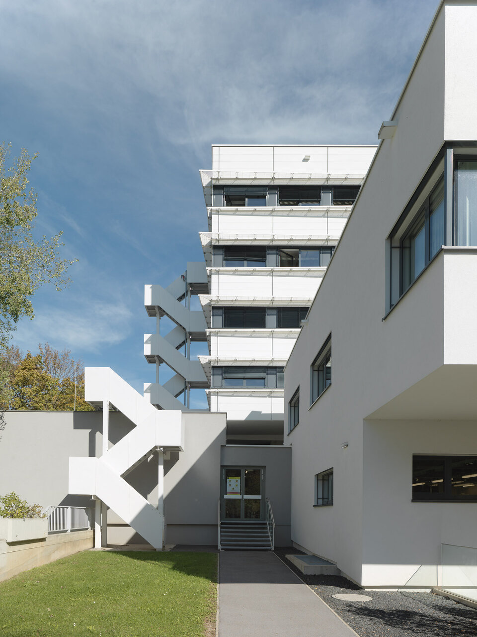 Um einer „Verhüttelung“ durch kleinteilige Zu- und Anbauten entgegenzuwirken, soll mit diesem Projekt längerfristig der benötogte Raumbedarf gesichert werden. Das geschieht durch die Aufstockung aller fünf Bürotürme auf dieselbe Höhe von vier Obergeschossen. Die in Leichtbauweise erfolgten Baumaßnahmen wurden bei laufendem Betrieb durchgeführt.