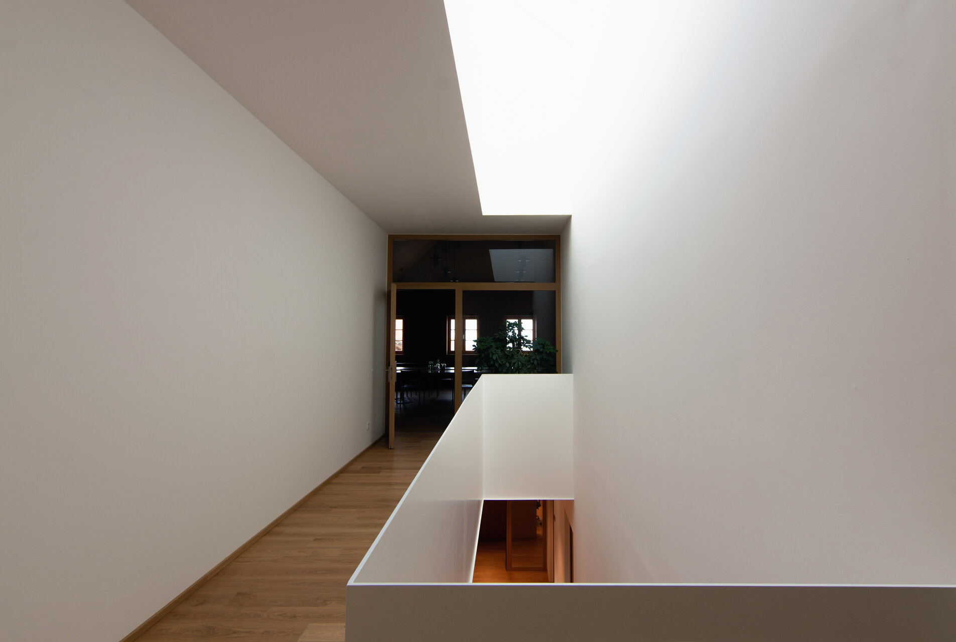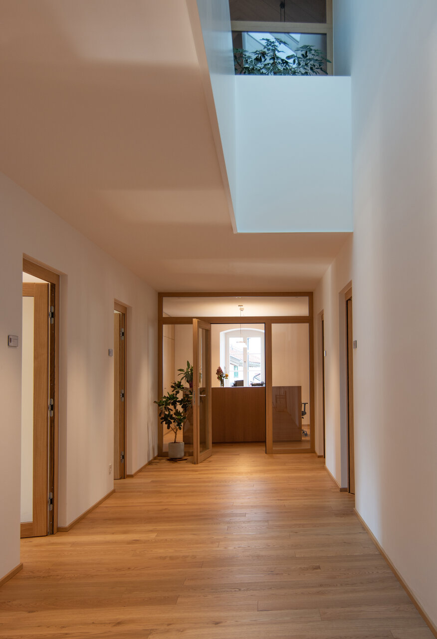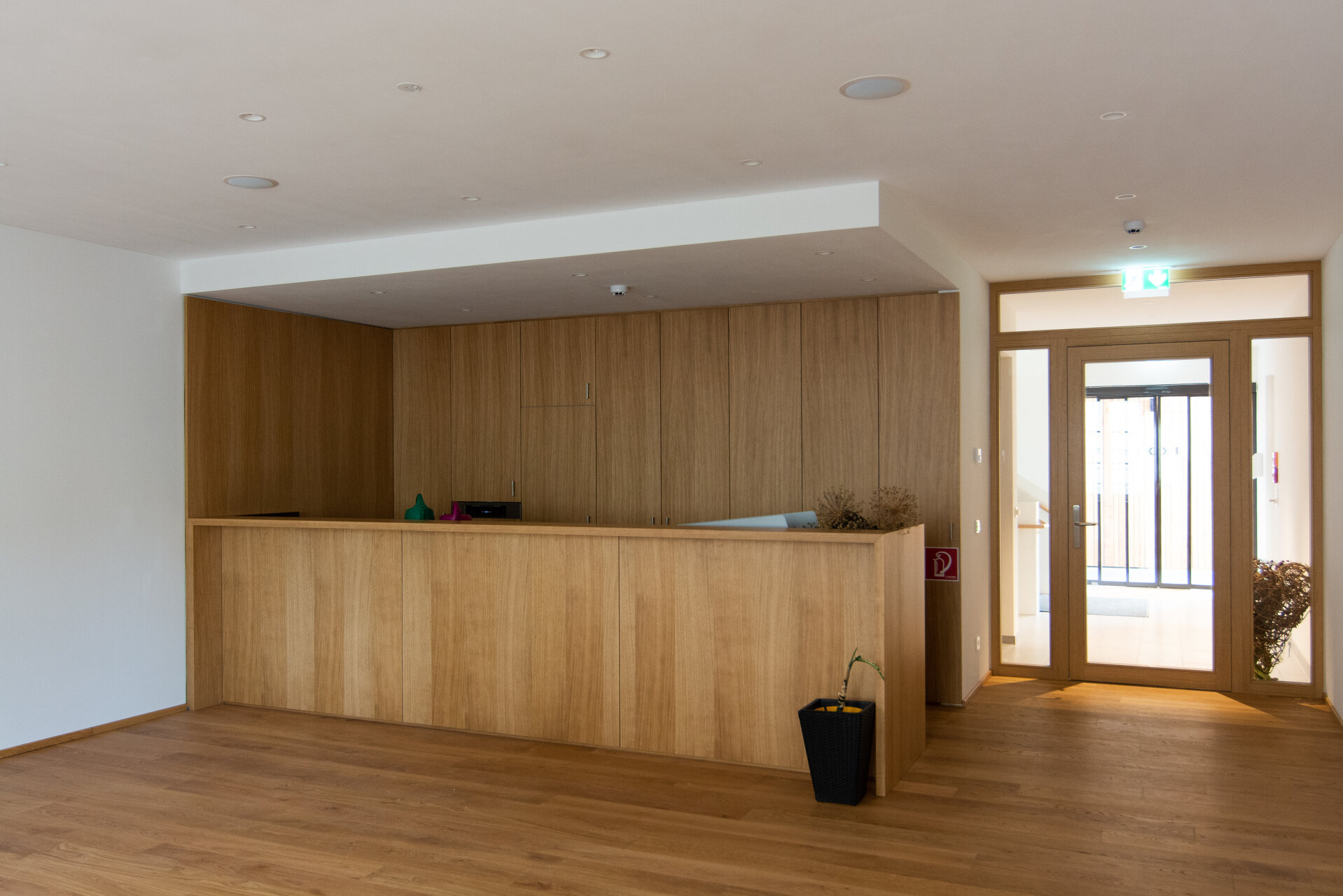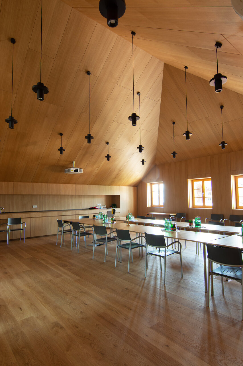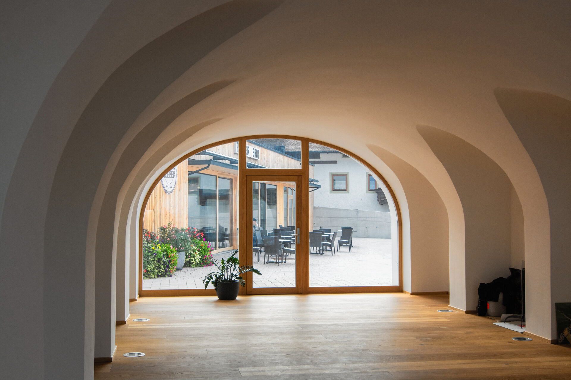 Neben dem Gemeindeamt sind im neuen Dorfzentrum auch mehrere Einrichtungen wie Bürgerservice, Tourismusverband und Postservice sowie Dienstleistungsbetriebe untergebracht. Kernstück im Erdgeschoß ist der alte Gewölberaum, der ost- und westseitig großflächig geöffnet wurde und nun als kleiner Saal für Kulturveranstaltungen und Ausstellungen dient. Das Gemeindeamt selbst befindet sich im Obergeschoß und ist wie in einem traditionellen Bauernhaus über einen zentralen Mittelflur erschlossen. Im Dachgeschoß liegt der Gemeinderatssaal, der über mobile Schiebeelemente mit der vorgelagerten Saalgalerie zusammengeschlossen werden kann. Eine neue vertikale Erschließung verbindet alle Ebenen barrierefrei mit der Tiefgarage, die im Zuge der hinter dem Gemeindehaus errichteten Wohnanlage realisiert wurde. Im Norden des Mauracher-Hauses wurde ein eingeschoßiger Zubau errichtet, der sich aufgrund der Leichtigkeit der verwendeten Materialien dezidiert gegenüber dem historischen Gebäude zurücknimmt. Die hier angesiedelte Bäckerei mit Cafébetriebt trägt gemeinsam mit drei im Gemeindehaus untergebrachten Dienstleistungsbetrieben zur Revitalisierung des Ortskerns bei.