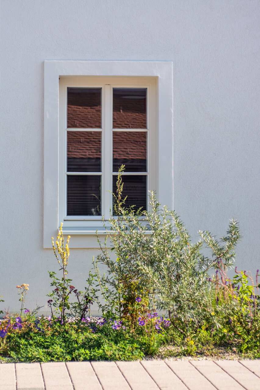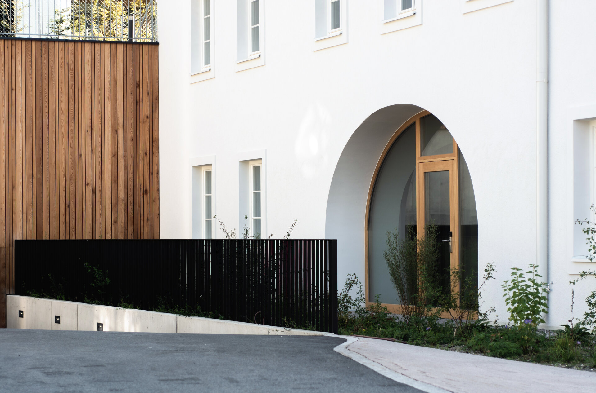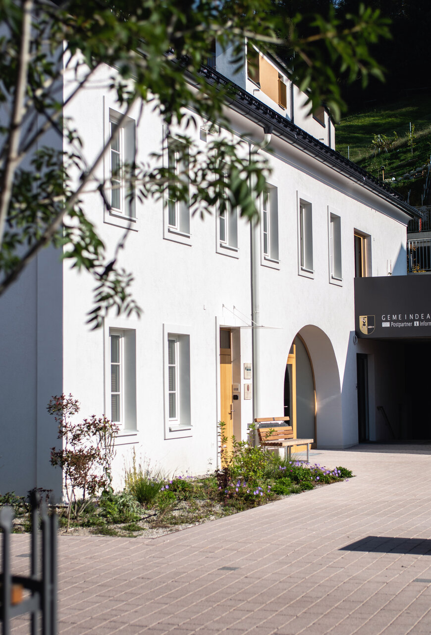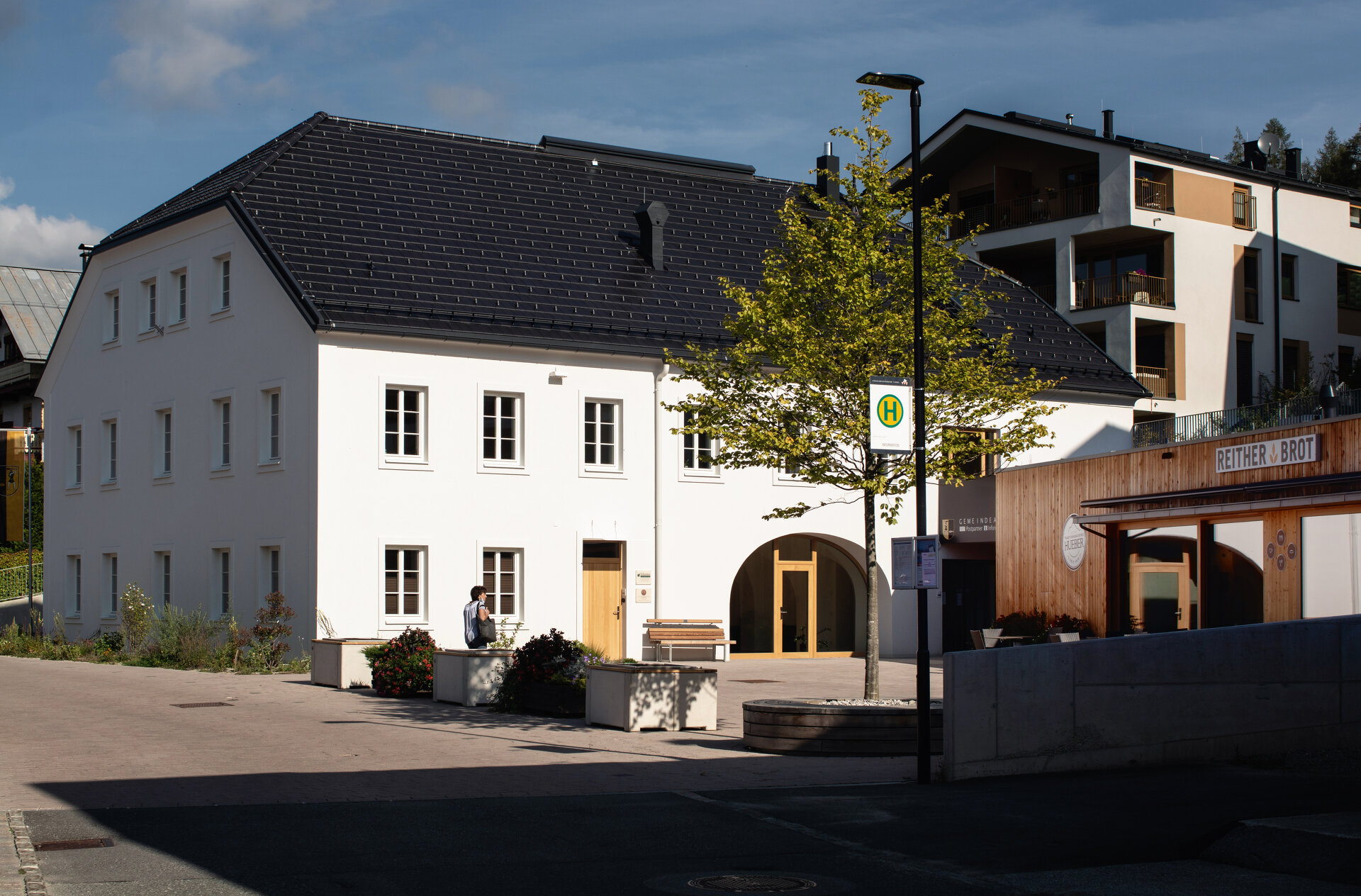 Zentrales Element des neuen Dorfzentrums ist der vom Bestand und Zubau umschlossene Vorplatz, der als Drehscheibe aller Einrichtungen fungiert. Für die Dorfgemeinschaft entstand hier ein öffentlicher Raum mit hoher Aufenthaltsqualität, in dem ein Miteinander gelebt werden kann. Die im Dorf bestehende Pflasterung wurde am Platz selbst und auch über die Straße fortgesetzt, wodurch die Bereiche vor dem hier liegenden Kindergarten und dem Raiffeisengebäude zu einer neuen Einheit zusammengeführt wurden. (Text: Claudia Wedekind)