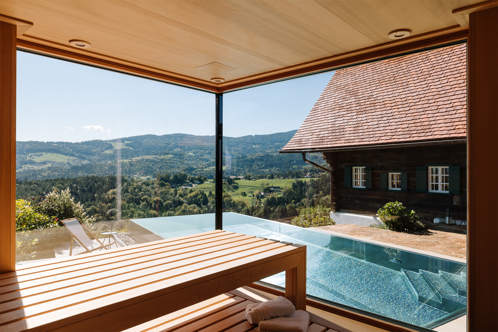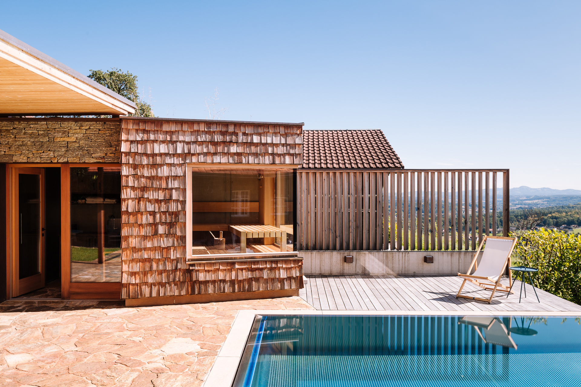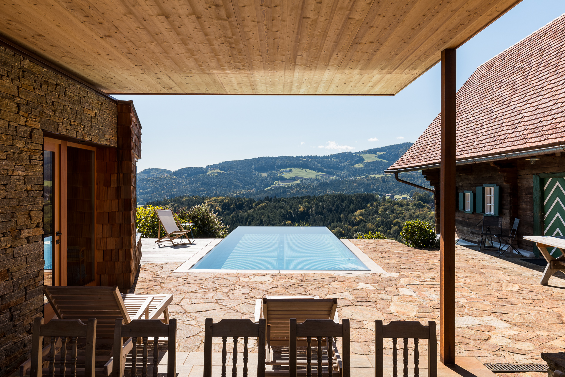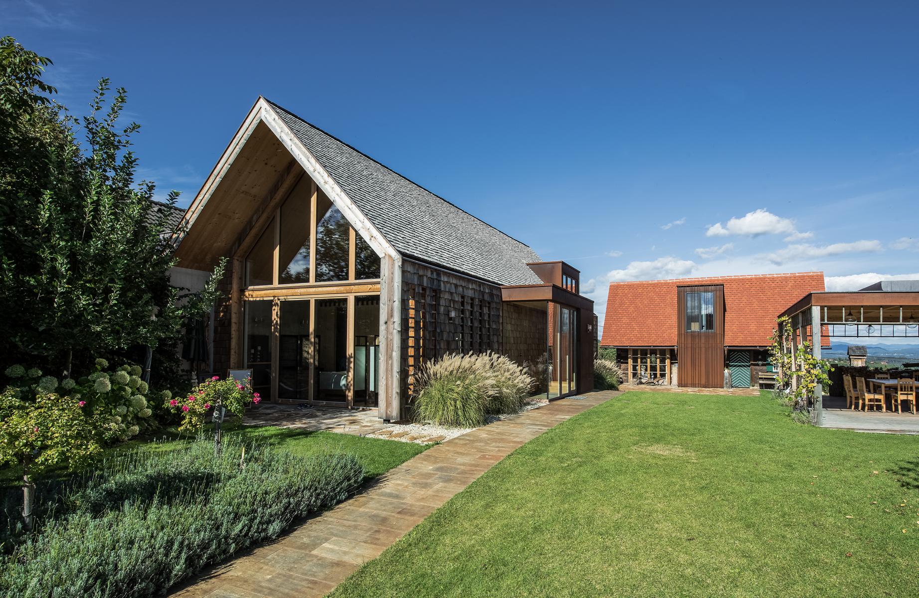 Das Weinstöckel „Resi“ wurde als Bestandsobjekt ökologisch auf den Ursprung in allen Details zurückgeführt, „Liese-Lotte“ vom Wirtschaftstrakt zu einem Zwei-Apartment-Haus ausgebaut und „Mitzi“ in seiner traditionellen Art eines Schilcherhauses mit Weinkeller wiedererrichtet. Der männliche Zuwachs in der Familie ist „Hias“, das Saunahaus mit Infinity-Pool. Alle "Geschwister" und Geschichten verbinden die, in unterschiedlicher Art und Weise, eingesetzten Materialien: