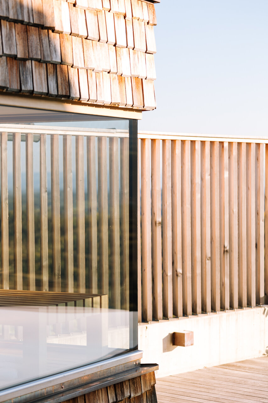 Cortenstahl – Ein Baumaterial, das genauso wie Holz oder Stein seine Patina entwickelt, als weiteres verbindendes Element der vier Häuser eingesetzt: klar, linear, markant, aber nicht dominierend als zeitgenössische und doch zeitlose Architektursprache.