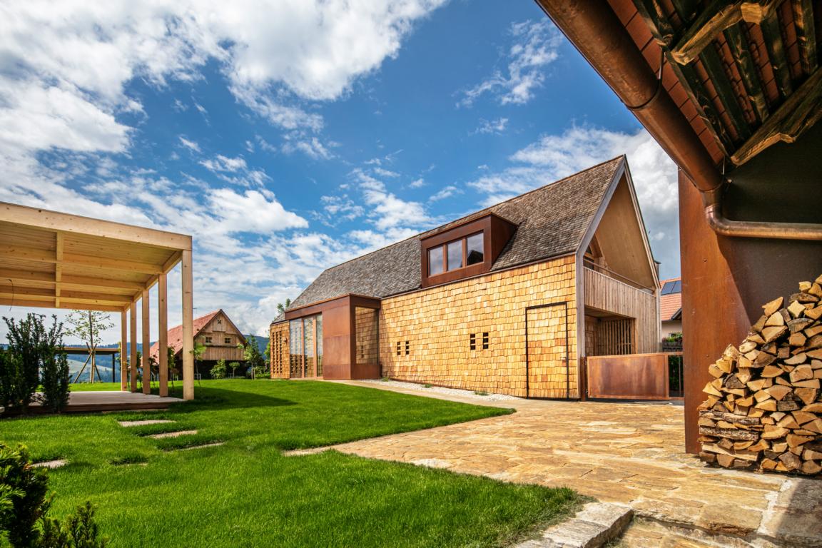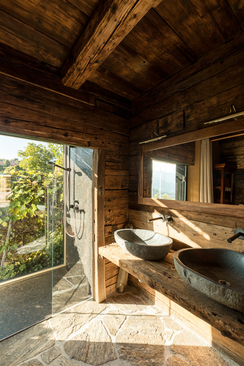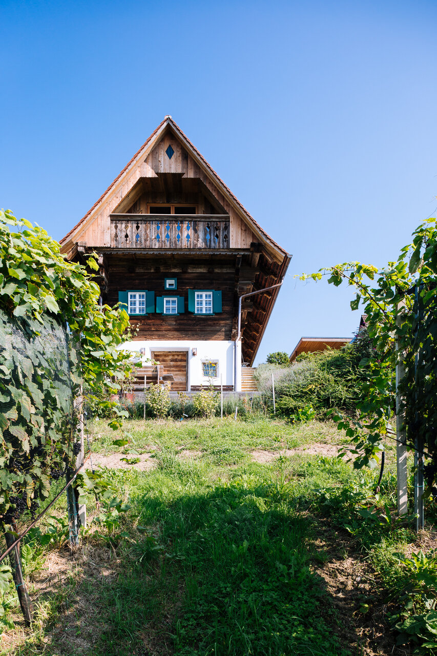 So wurden "Resi", das Weinstöckl am Kamm und "Mitzi", das Schilcherhaus am Weinhang, diffusionsoffen errichtet, innen die Holzblockwand mit Lehmschlämme abgedichtet, mit Holzfaserdämmplatten gedämmt und mit Lehmputz verkleidet. Die alten Zwischendecken teilweise abgebürstet oder mit Trockeneis behandelt, um die Oberflächen für ihre weiteren 200 Jahre aufzubereiten. Ergänzt, durch geradlinigen Cortenstahl verkleidet, das Stiegenhaus bzw. Bad und Dusche.