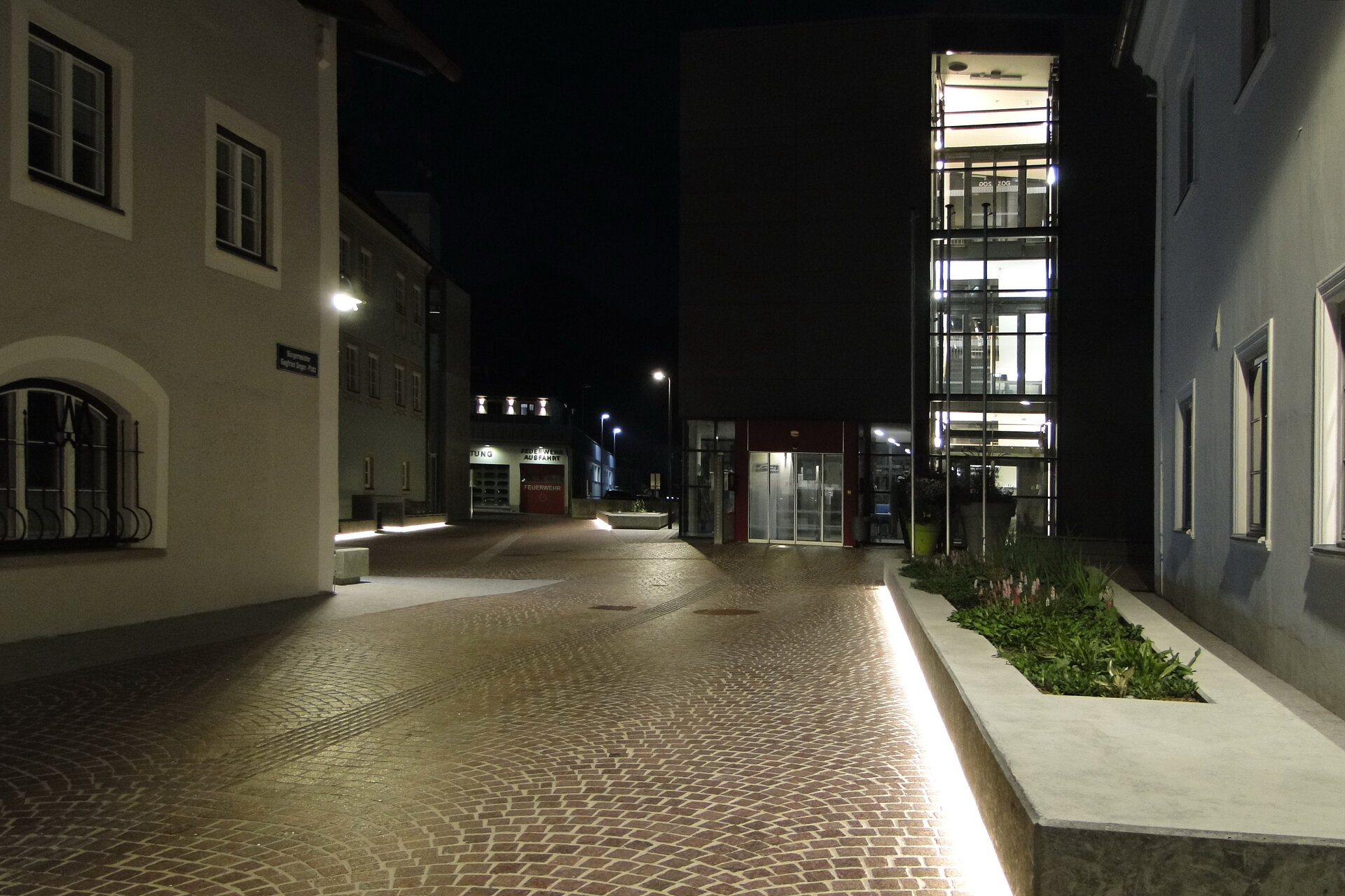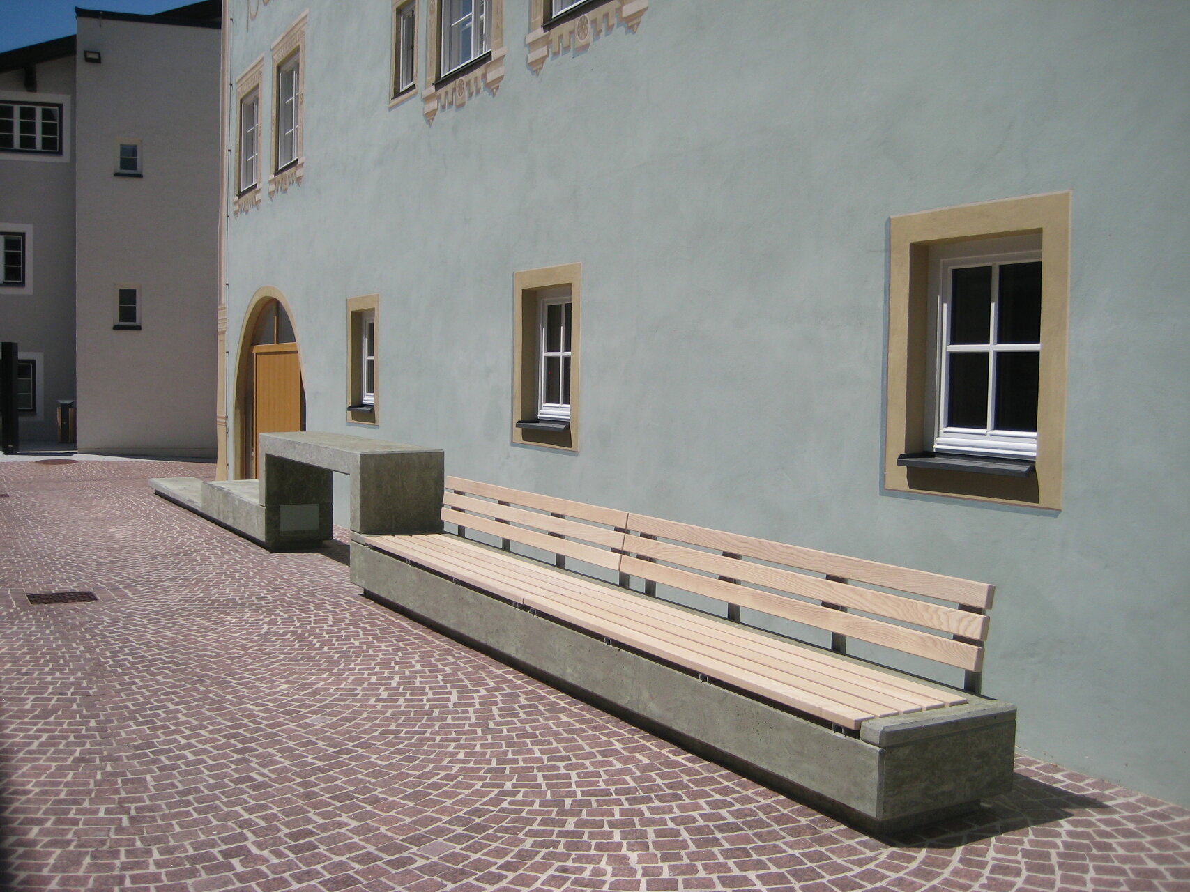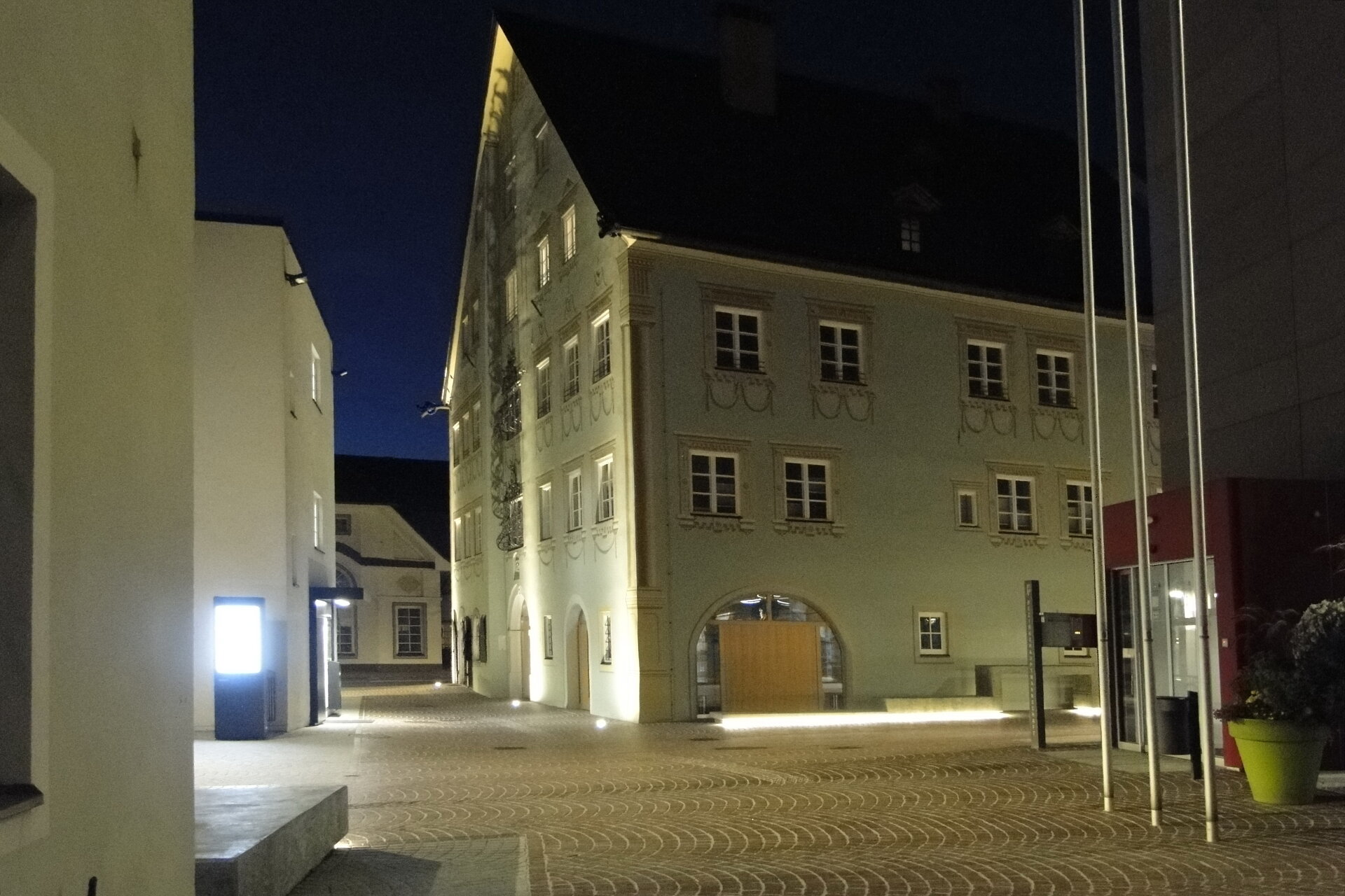 Ein einheitliches Gestaltungskonzept fasst die unterschiedlichen Bereiche des Platzes zu einer homogenen Einheit zusammen. So wurde das rötliche Granitsteinpflaster, das bereits um Gemeindeamt und Bezirkshauptmannschafts-Altbau verlegt war, aufgegriffen und als roter Teppich ins Zentrum geführt. Kontrastierend dazu wurde als Umfassung der Grüninseln, Sitzbänke und Fahrradabstellplätze hellgraues Granitsteinpflaster eingesetzt. Die Sitzbänke, Wasserbecken und Grüninseln wurden analog zum Dengelhaus-Zubau in grün durchgefärbtem Sichtbeton ausgeführt, wobei die Betoneinfassungen der mit bunt blühenden und immergrünen Sträuchern und Stauden bepflanzten Grüninseln so breit dimensioniert wurden, dass sie auch als Sitzgelegenheit genutzt werden können. Präzis gesetzte Pfeilerleuchten, lineare LED-Beleuchtungen in den Sockelzonen und Bodenscheinwerfer akzentuieren die einzelnen Platzbereiche und setzen das sanierte Dengelhaus in Szene. (Text: Claudia Wedekind, nach einem Text der Architekt:innen)