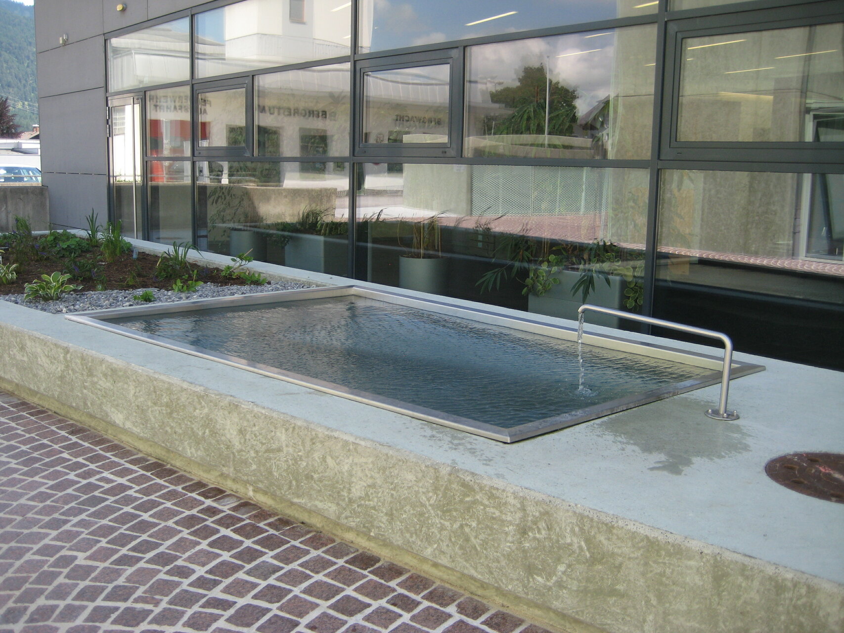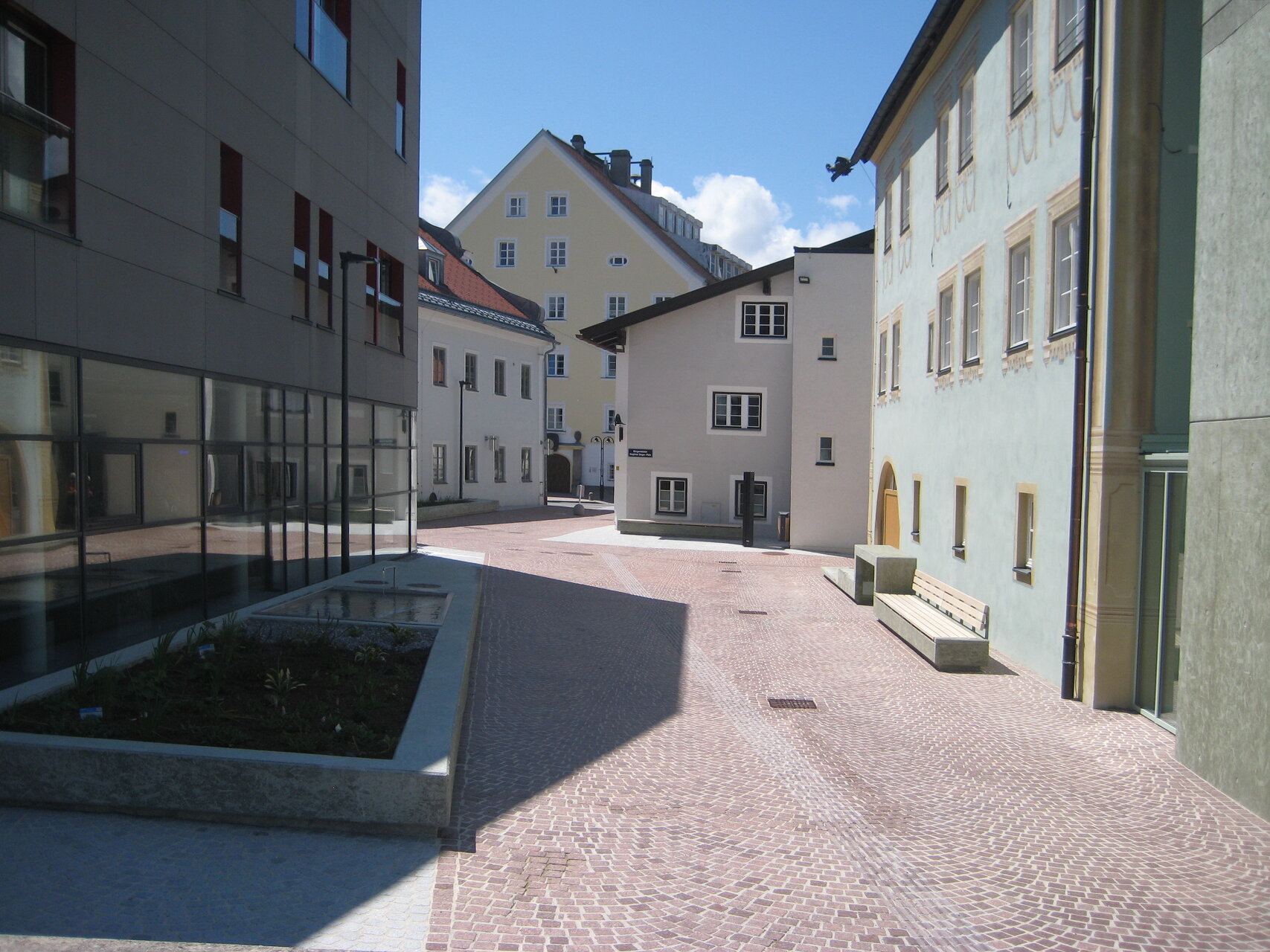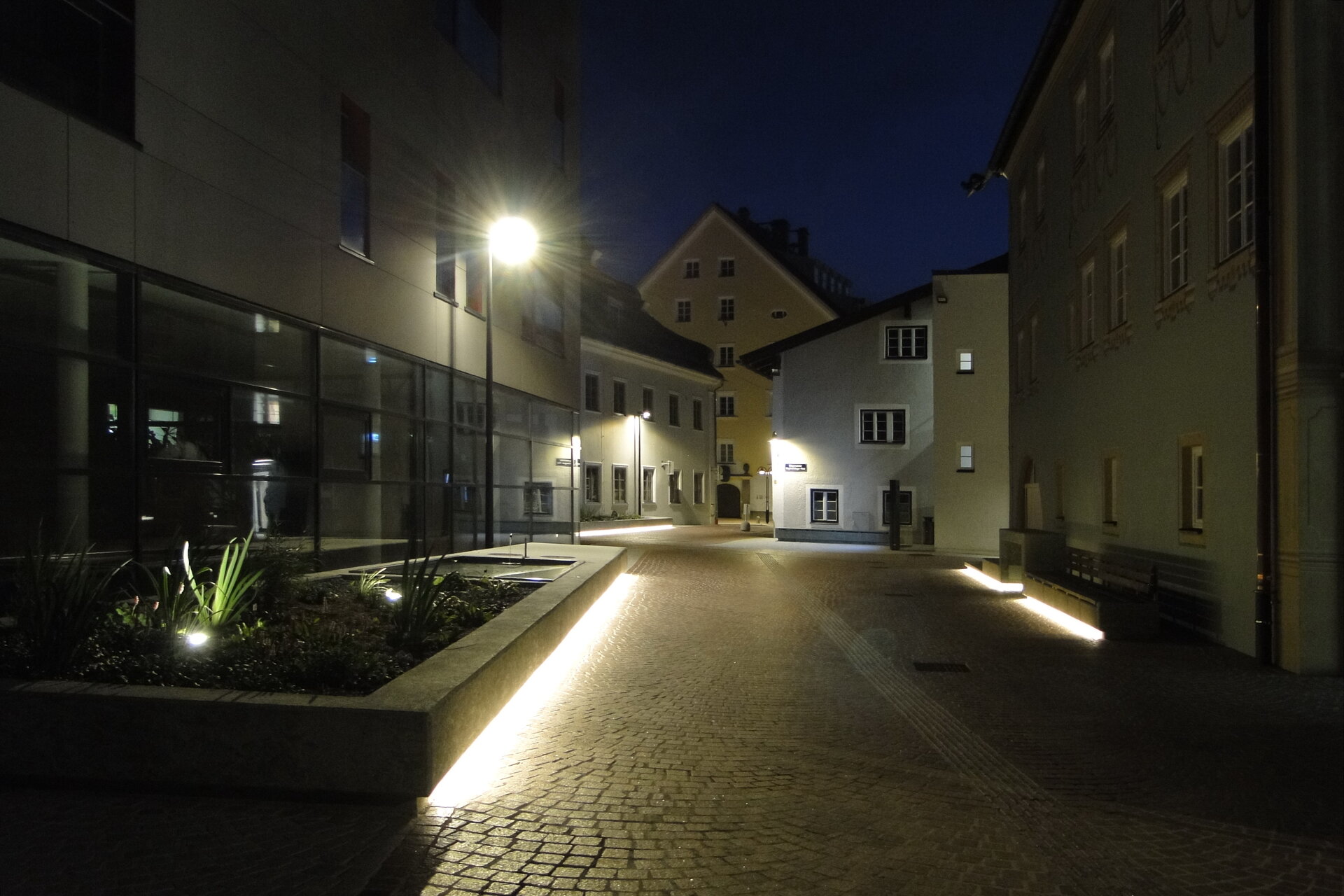 Ein einheitliches Gestaltungskonzept fasst die unterschiedlichen Bereiche des Platzes zu einer homogenen Einheit zusammen. So wurde das rötliche Granitsteinpflaster, das bereits um Gemeindeamt und Bezirkshauptmannschafts-Altbau verlegt war, aufgegriffen und als roter Teppich ins Zentrum geführt. Kontrastierend dazu wurde als Umfassung der Grüninseln, Sitzbänke und Fahrradabstellplätze hellgraues Granitsteinpflaster eingesetzt. Die Sitzbänke, Wasserbecken und Grüninseln wurden analog zum Dengelhaus-Zubau in grün durchgefärbtem Sichtbeton ausgeführt, wobei die Betoneinfassungen der mit bunt blühenden und immergrünen Sträuchern und Stauden bepflanzten Grüninseln so breit dimensioniert wurden, dass sie auch als Sitzgelegenheit genutzt werden können. Präzis gesetzte Pfeilerleuchten, lineare LED-Beleuchtungen in den Sockelzonen und Bodenscheinwerfer akzentuieren die einzelnen Platzbereiche und setzen das sanierte Dengelhaus in Szene. (Text: Claudia Wedekind, nach einem Text der Architekt:innen)