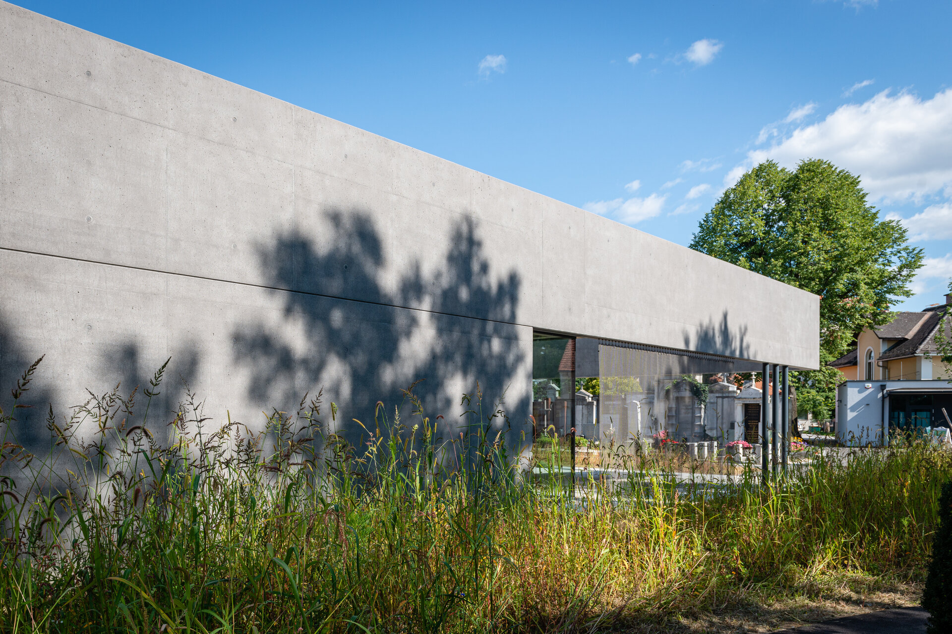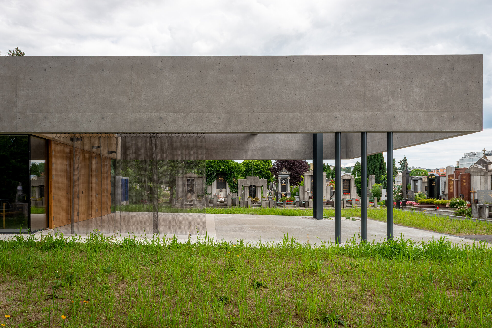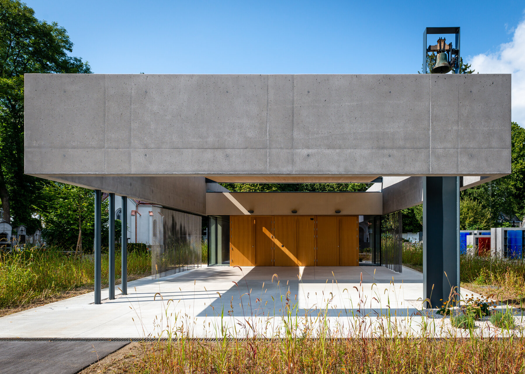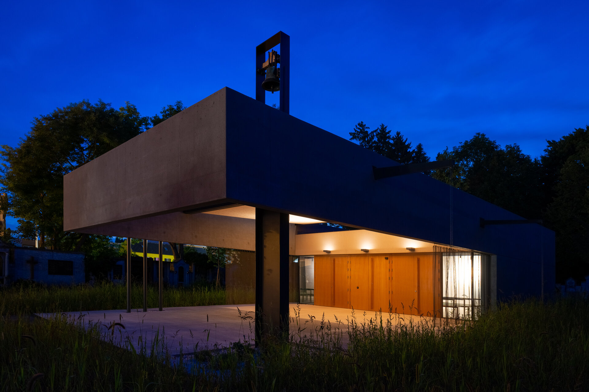 Die beiden verglasten Ecken der Eingangsfront bilden den Auftakt zu einer subtilen Abfolge immer stärker geöffneter Zonen. Der Vorplatz ist räumlich von einem Betonbügel gefasst, dessen weite Auskragung allein von drei schlanken, in Gehrichtung aufgereihten Stahlstützen auf der einen und einem zierlichen Glockentürmchen auf der anderen Seite abgefangen wird. Metallene Vorhänge nach Art eines Kettenhemds mildern an den Seiten den Übergang ins Freie. Auch der Natursteinboden ist ein Stück weit hinausgeführt, Felder aus Beton mit Besenstrich schließen an. Etwa zwei Drittel der vom Betonbügel gefassten Fläche sind überdacht. Die Raumgrenzen verschwimmen, was sich als Sinnbild für Übergang lesen lässt, aber auch schlicht offen, einladend und zwanglos wirkt – ganz im Gegensatz zur geschlossenen Wand des Vorgängerbaus, die sich, ebenfalls auf den Haupteingang des Friedhofs hin ausgerichtet, zugeknöpft und unnahbar gab. (Text: Achim Geissinger)