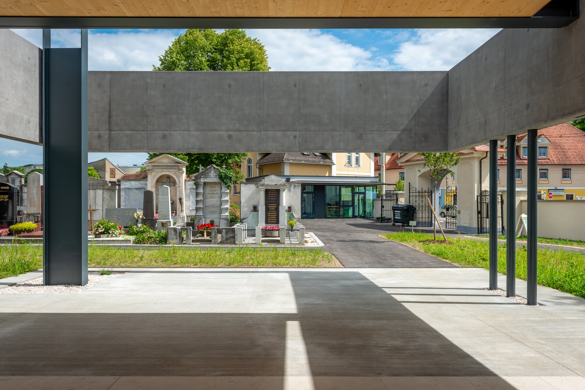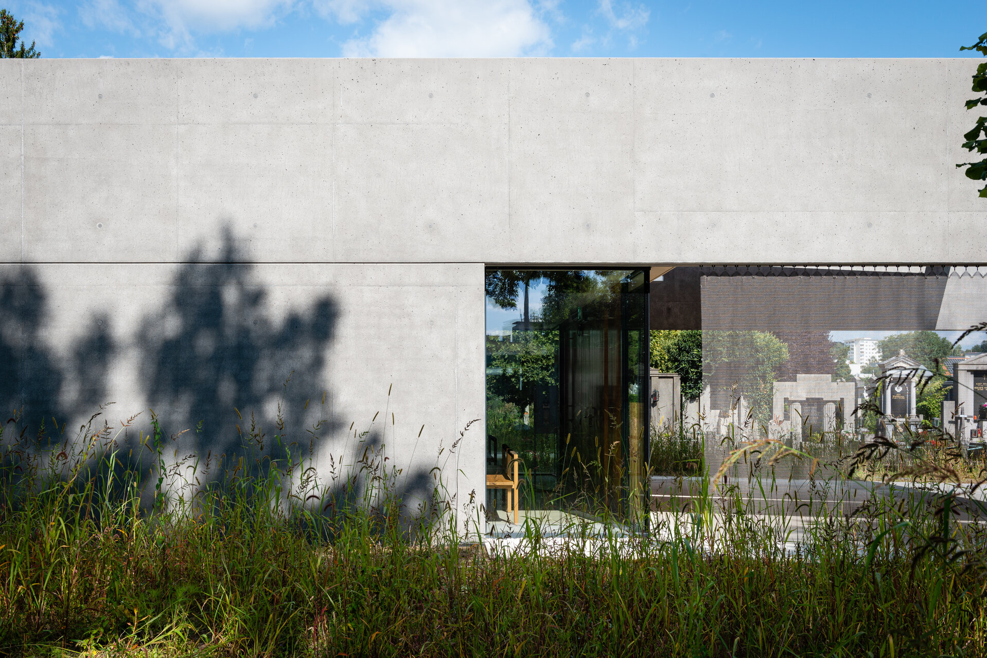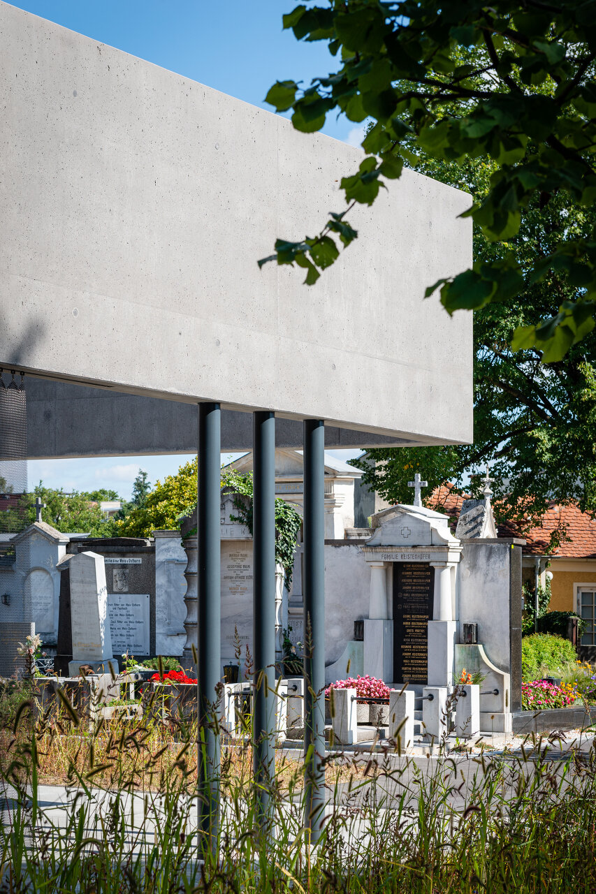 Die beiden verglasten Ecken der Eingangsfront bilden den Auftakt zu einer subtilen Abfolge immer stärker geöffneter Zonen. Der Vorplatz ist räumlich von einem Betonbügel gefasst, dessen weite Auskragung allein von drei schlanken, in Gehrichtung aufgereihten Stahlstützen auf der einen und einem zierlichen Glockentürmchen auf der anderen Seite abgefangen wird. Metallene Vorhänge nach Art eines Kettenhemds mildern an den Seiten den Übergang ins Freie. Auch der Natursteinboden ist ein Stück weit hinausgeführt, Felder aus Beton mit Besenstrich schließen an. Etwa zwei Drittel der vom Betonbügel gefassten Fläche sind überdacht. Die Raumgrenzen verschwimmen, was sich als Sinnbild für Übergang lesen lässt, aber auch schlicht offen, einladend und zwanglos wirkt – ganz im Gegensatz zur geschlossenen Wand des Vorgängerbaus, die sich, ebenfalls auf den Haupteingang des Friedhofs hin ausgerichtet, zugeknöpft und unnahbar gab. (Text: Achim Geissinger)