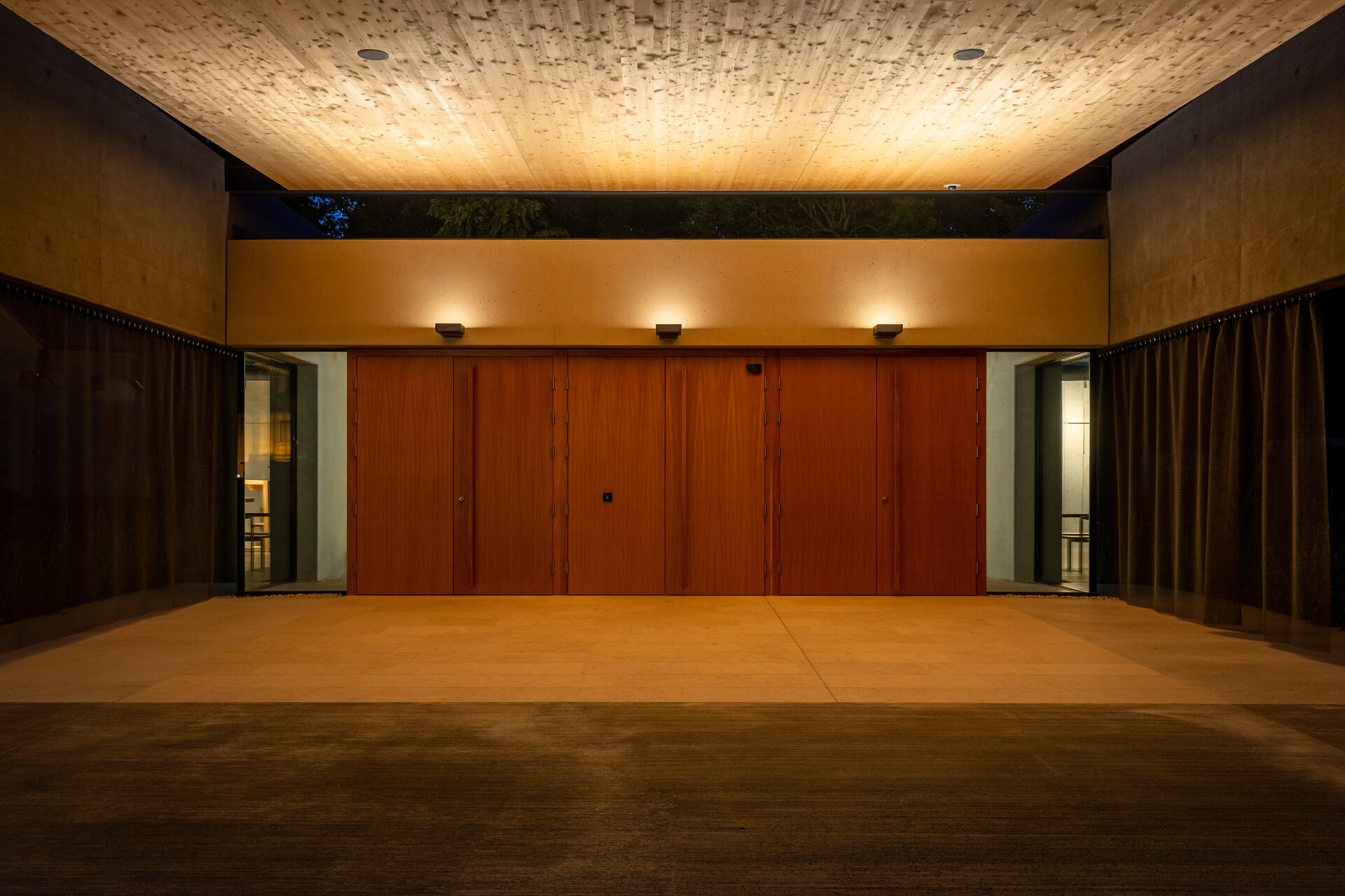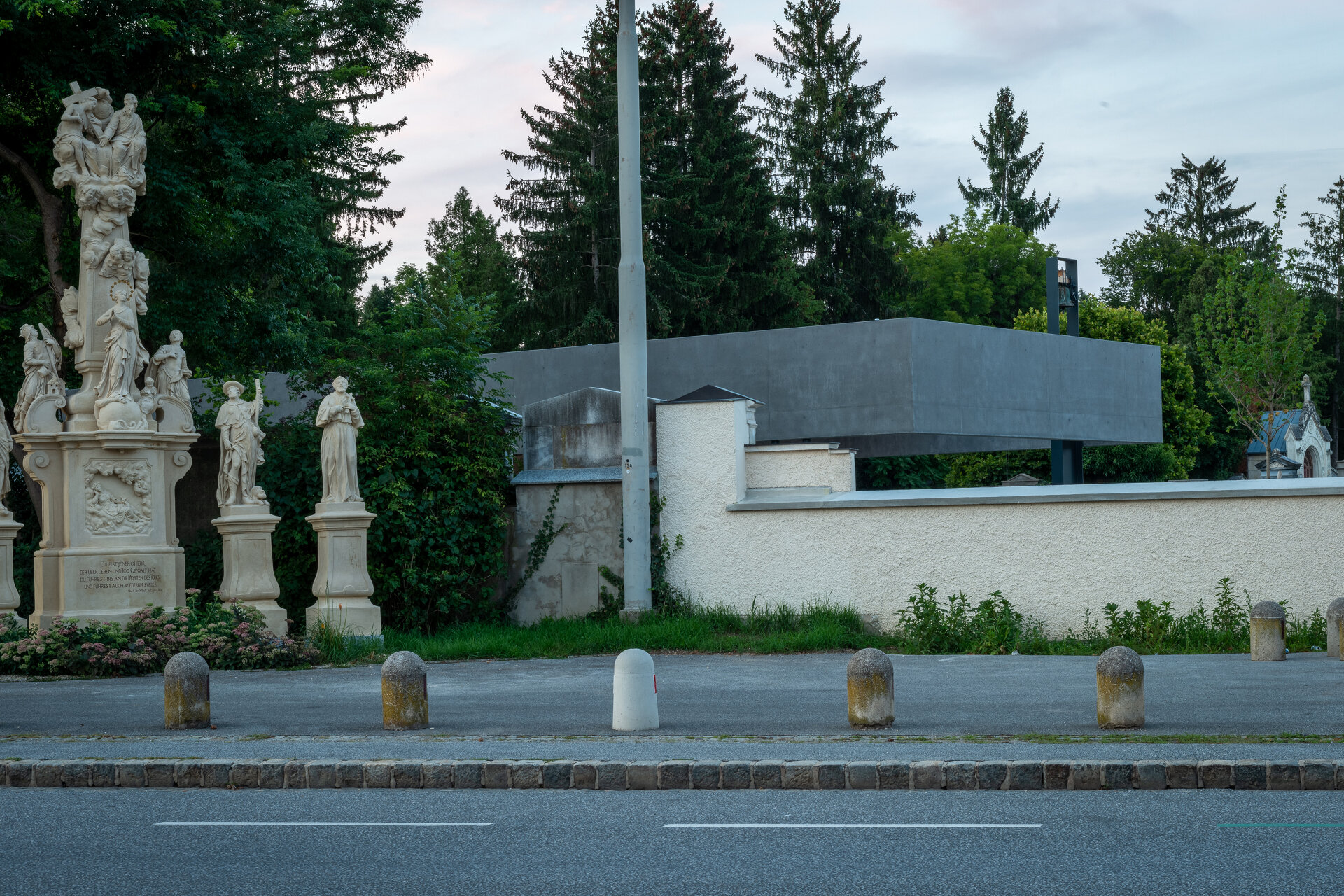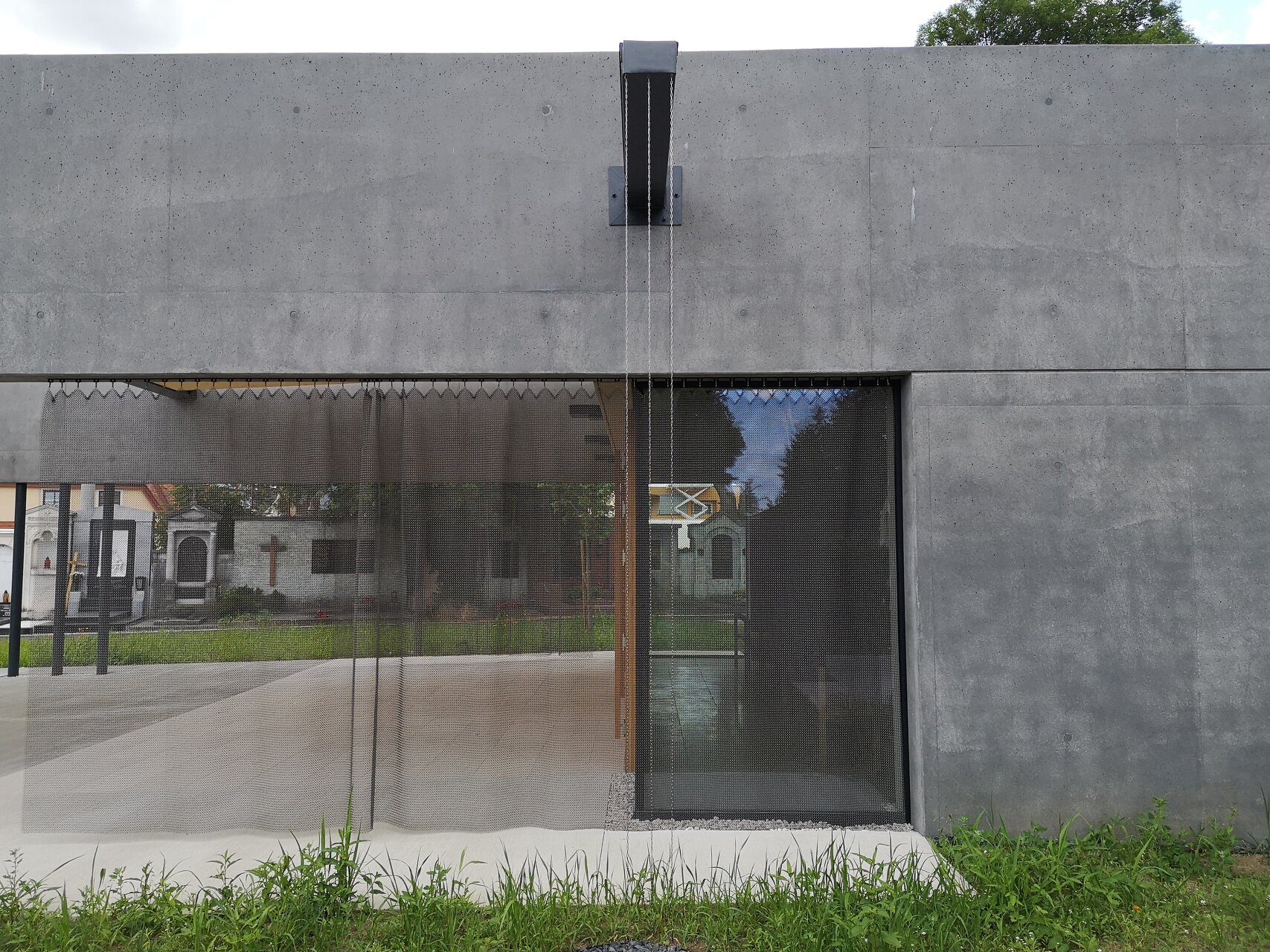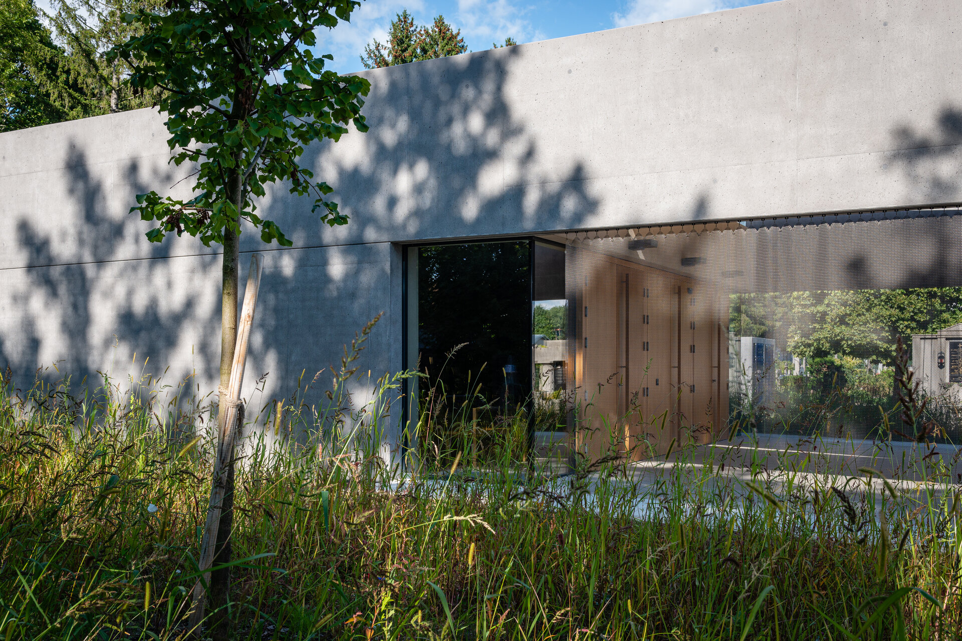 Die beiden verglasten Ecken der Eingangsfront bilden den Auftakt zu einer subtilen Abfolge immer stärker geöffneter Zonen. Der Vorplatz ist räumlich von einem Betonbügel gefasst, dessen weite Auskragung allein von drei schlanken, in Gehrichtung aufgereihten Stahlstützen auf der einen und einem zierlichen Glockentürmchen auf der anderen Seite abgefangen wird. Metallene Vorhänge nach Art eines Kettenhemds mildern an den Seiten den Übergang ins Freie. Auch der Natursteinboden ist ein Stück weit hinausgeführt, Felder aus Beton mit Besenstrich schließen an. Etwa zwei Drittel der vom Betonbügel gefassten Fläche sind überdacht. Die Raumgrenzen verschwimmen, was sich als Sinnbild für Übergang lesen lässt, aber auch schlicht offen, einladend und zwanglos wirkt – ganz im Gegensatz zur geschlossenen Wand des Vorgängerbaus, die sich, ebenfalls auf den Haupteingang des Friedhofs hin ausgerichtet, zugeknöpft und unnahbar gab. (Text: Achim Geissinger)